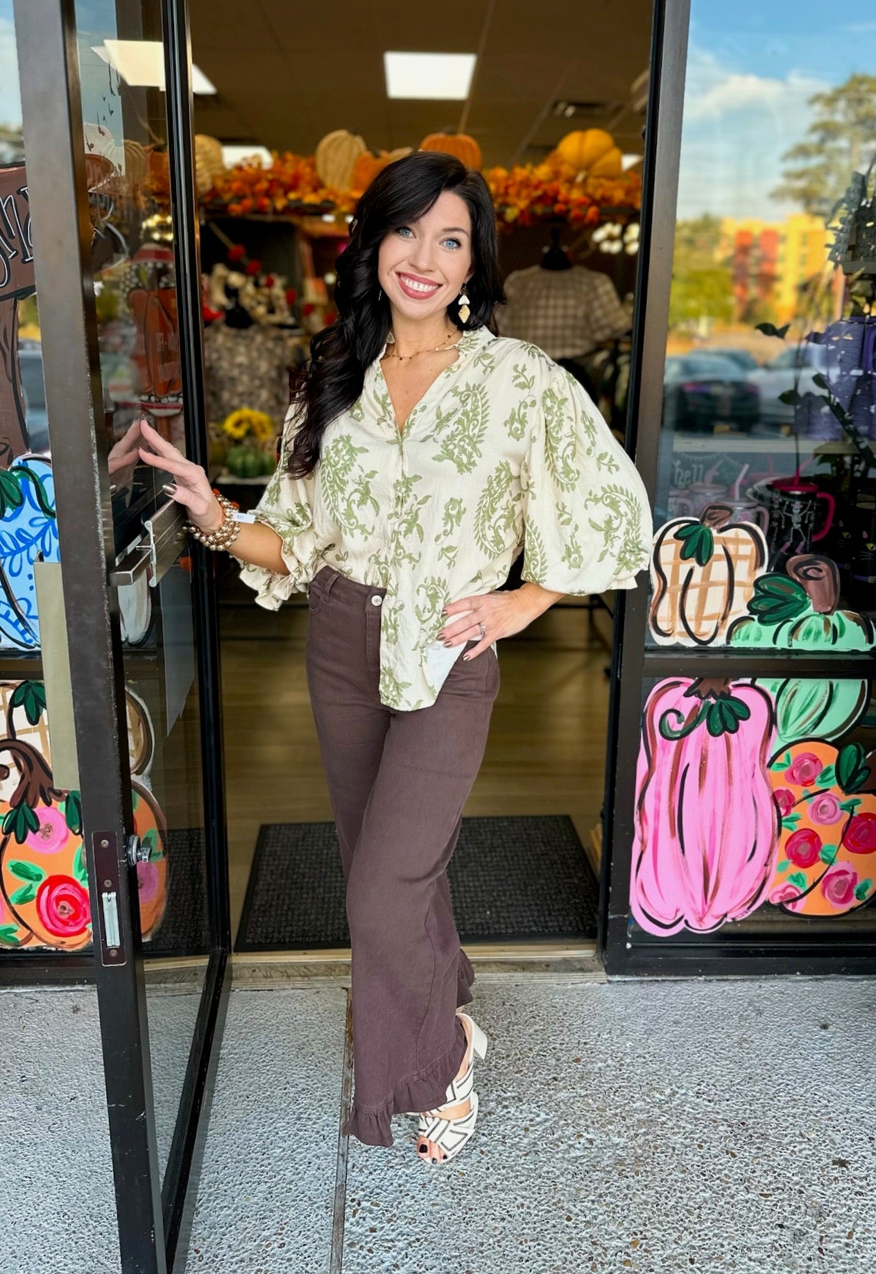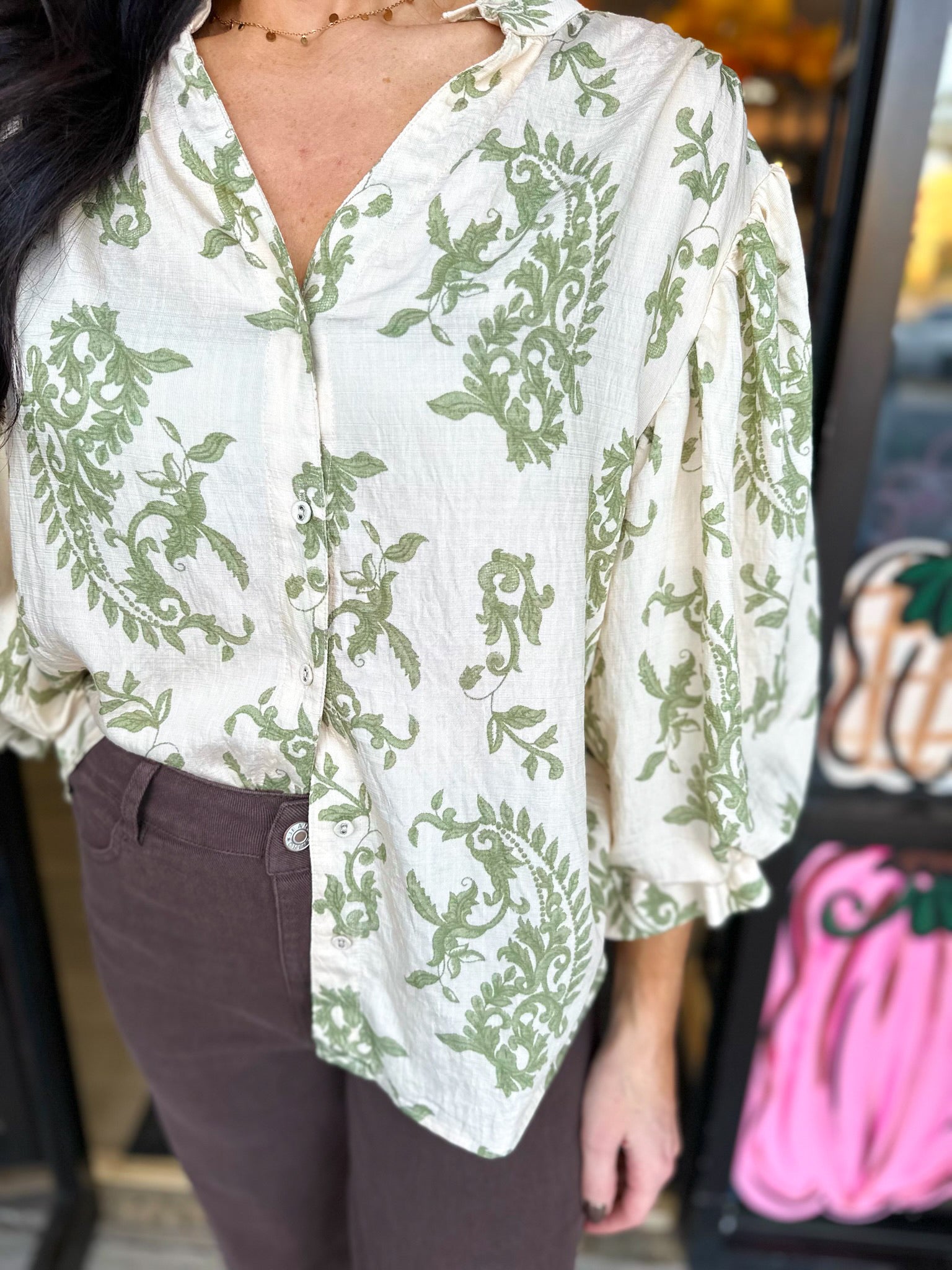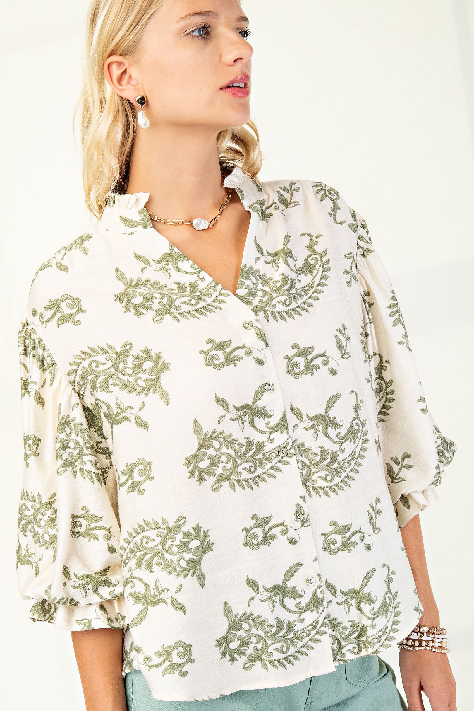 Button Down Blouse with 3/4 Length Balloon Sleeves
