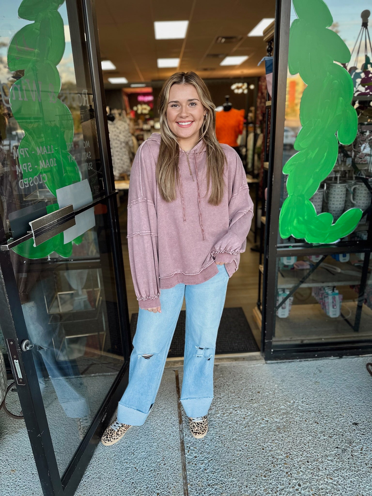 BALOON SLVS WASHED TERRY HOODIE PULLOVER -RELAXED AND OVERSIZED -ATTACHED HOOD WITH MATCHING DRAWSTRINGS -MINERAL WASHED -DROPPED SHOULDERS -SMALL MEASUREMENTS : LENGTH - 24" & BUST - 31.25"