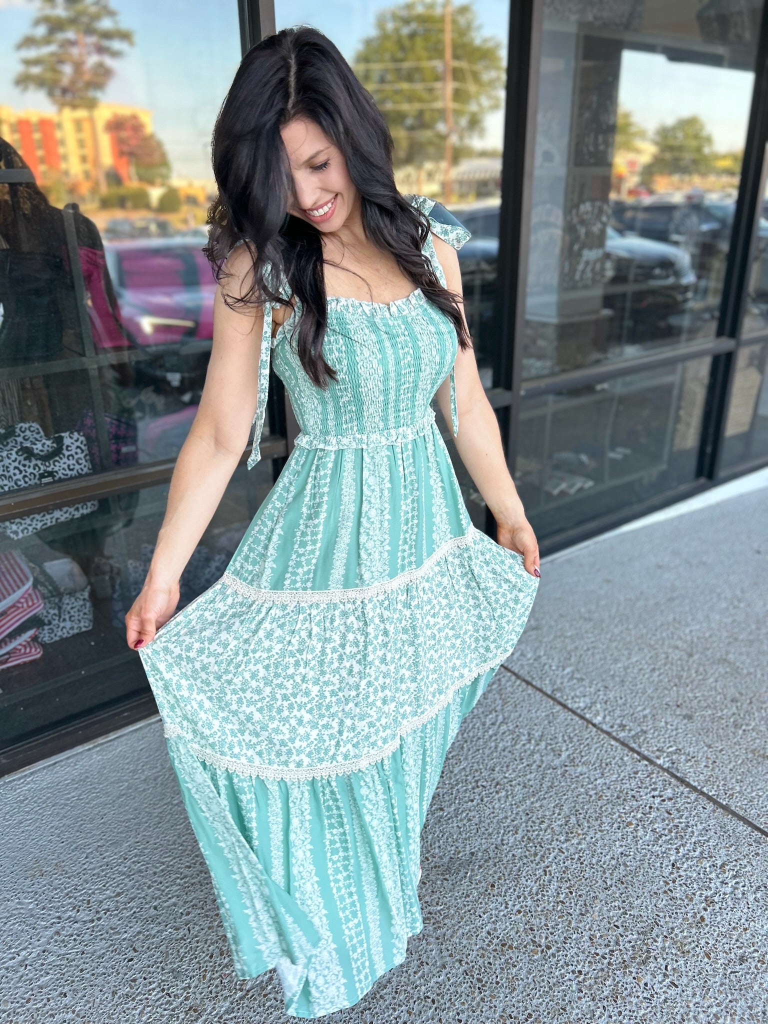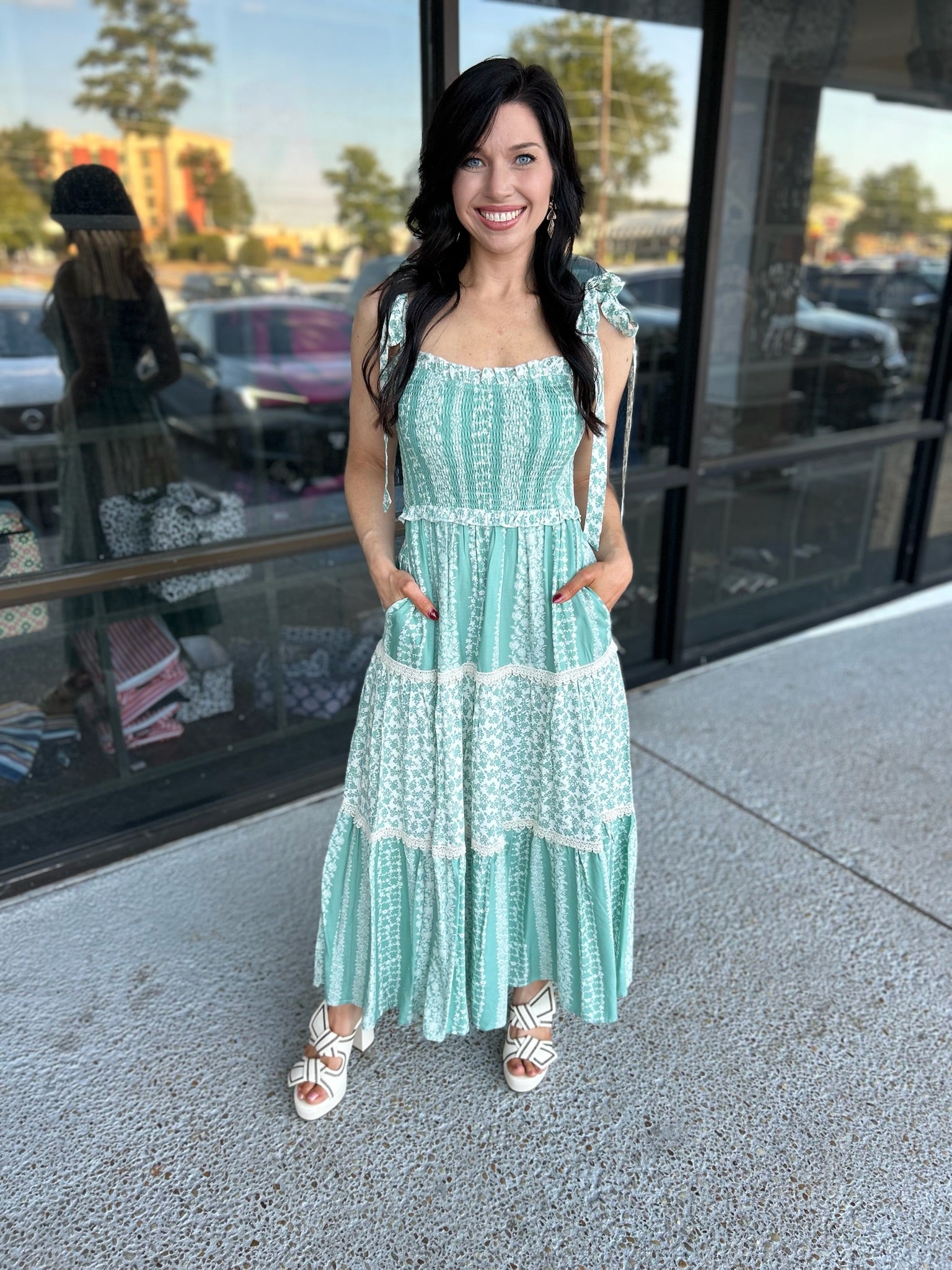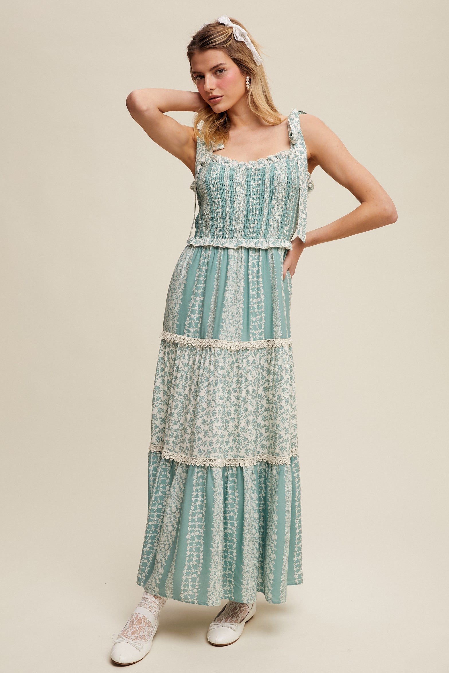 Details: Smocked Bodice: Stretchy, ruched bodice provides a flattering, form-hugging fit with delicate mini ruffle trimming. - Shoulder Tie Straps: Adjustable self-tie straps allow for a customizable fit and add a sweet, feminine touch. - Floral Patchwork Print: Features a vintage-inspired mix of dainty floral patterns with vertical stripe contrast for a charming boho look. - Tiered Skirt Design: Flowing maxi-length skirt crafted with tiered panels for graceful movement and dimension. - Crochet Lace Trims: Romantic crochet lace detailing at each tier adds a soft, whimsical finish. - Side Pockets: Functional side pockets enhance practicality without disturbing the elegant silhouette. - Fully Lined: Thoughtfully lined to ensure comfortable wear and confident coverage.