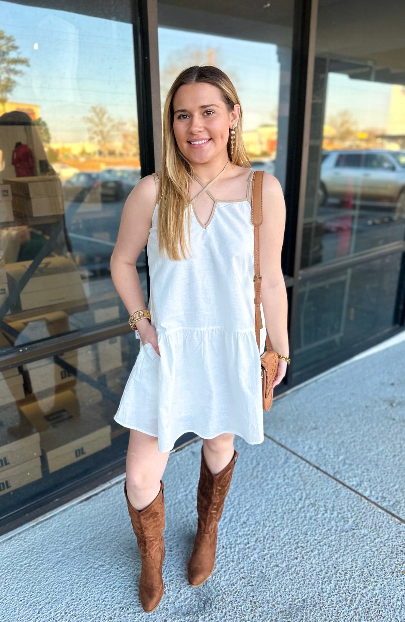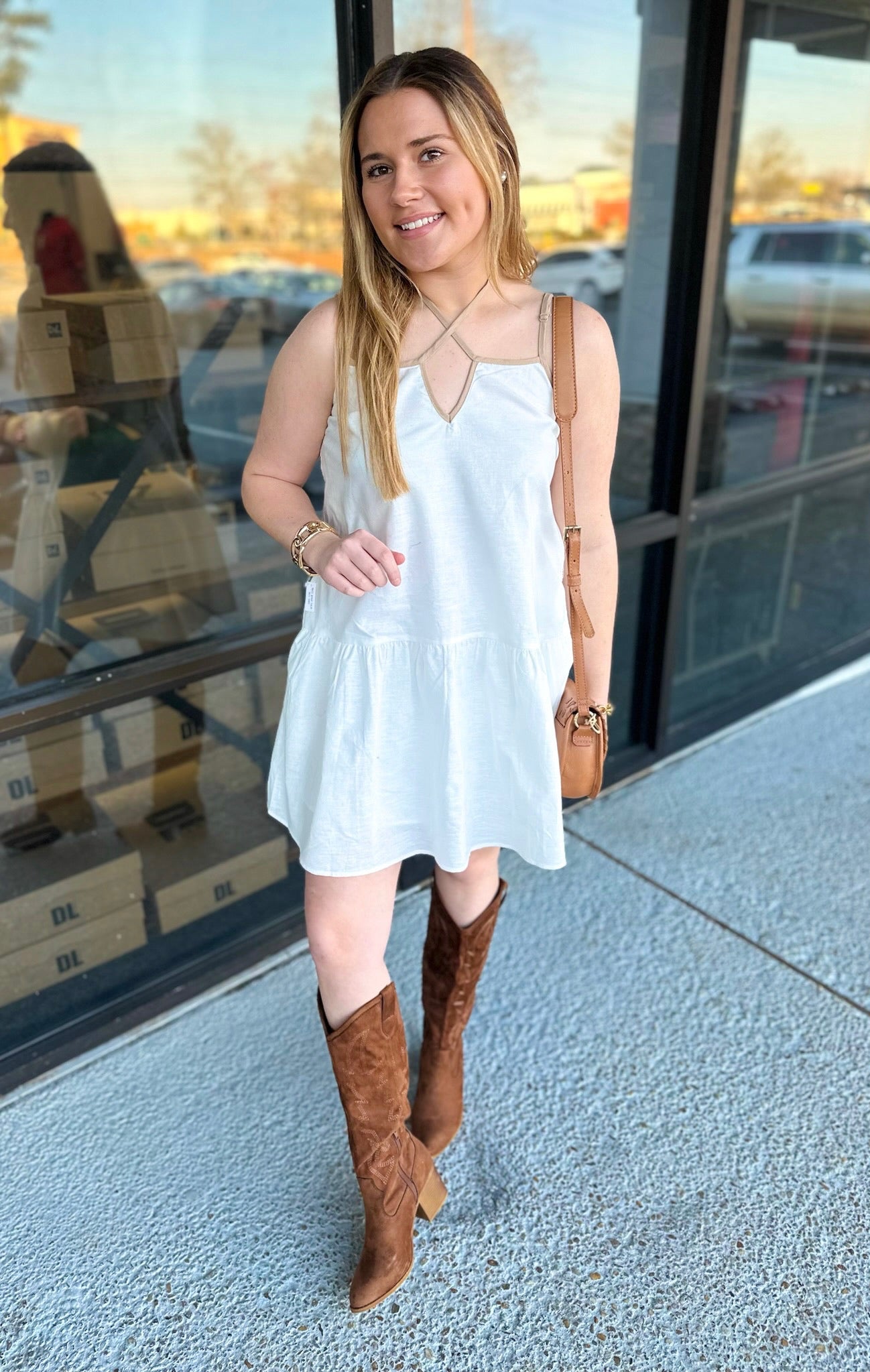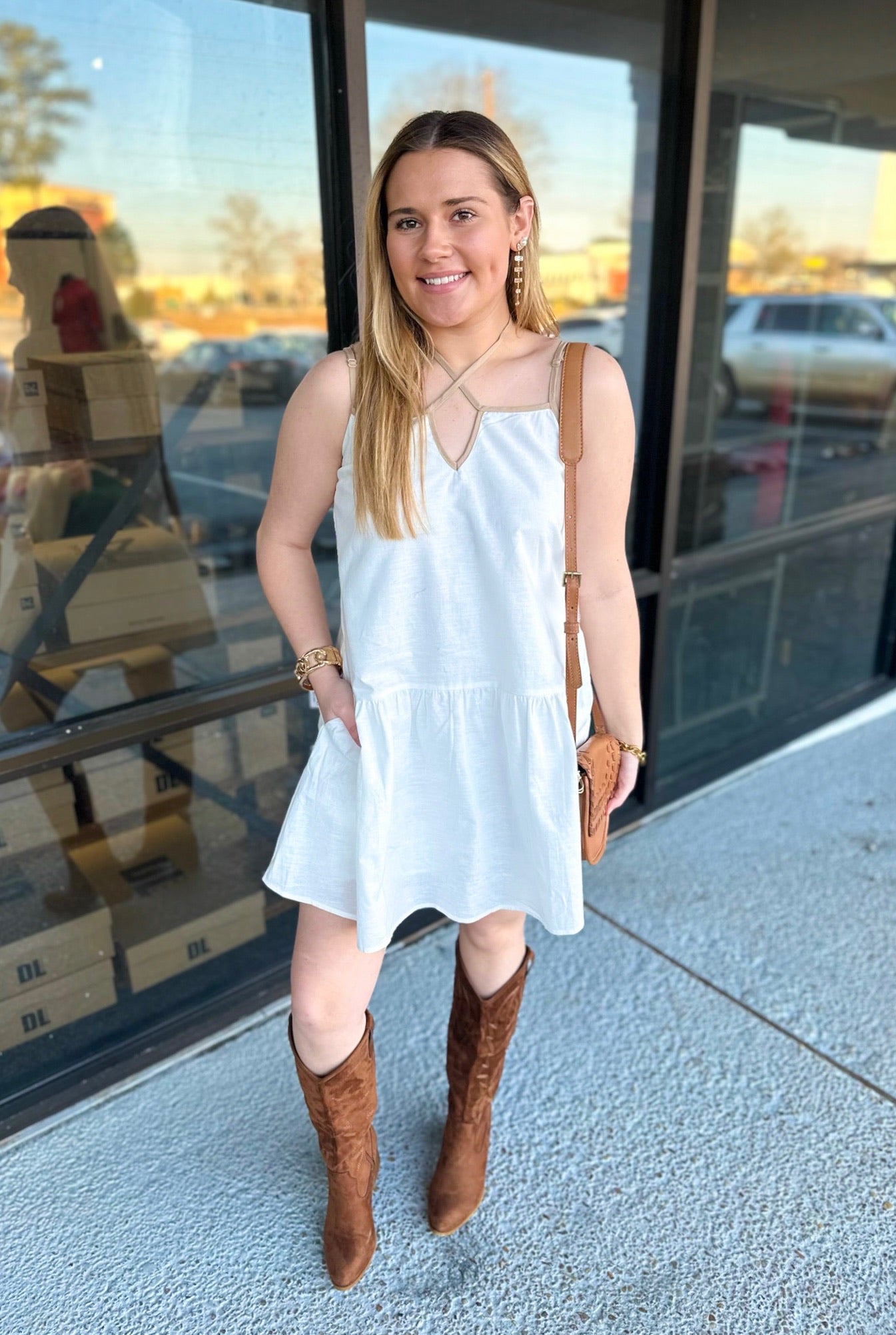 CONTRAST CAMI MINI DRESS - SELF FRONT TIE - ADJUSTABLE STRAPS - SIDE POCKETS AND LINED SELF: 70% COTTON, 30% LINEN CONTRAST: 70% COTTON, 30% LINEN LINING: 100% POLYESTER * Due to lighting and differences in monitors, actual colors may vary slightly from what appears online.