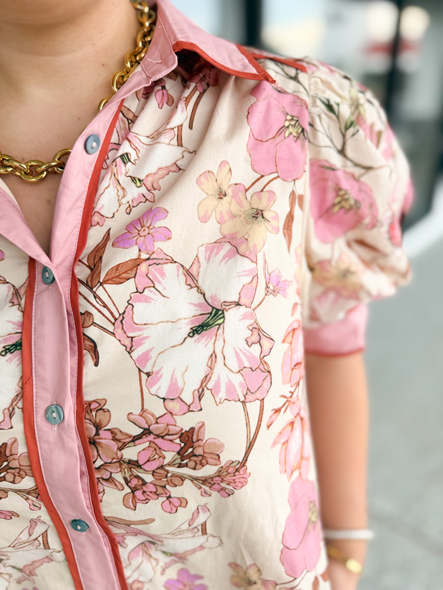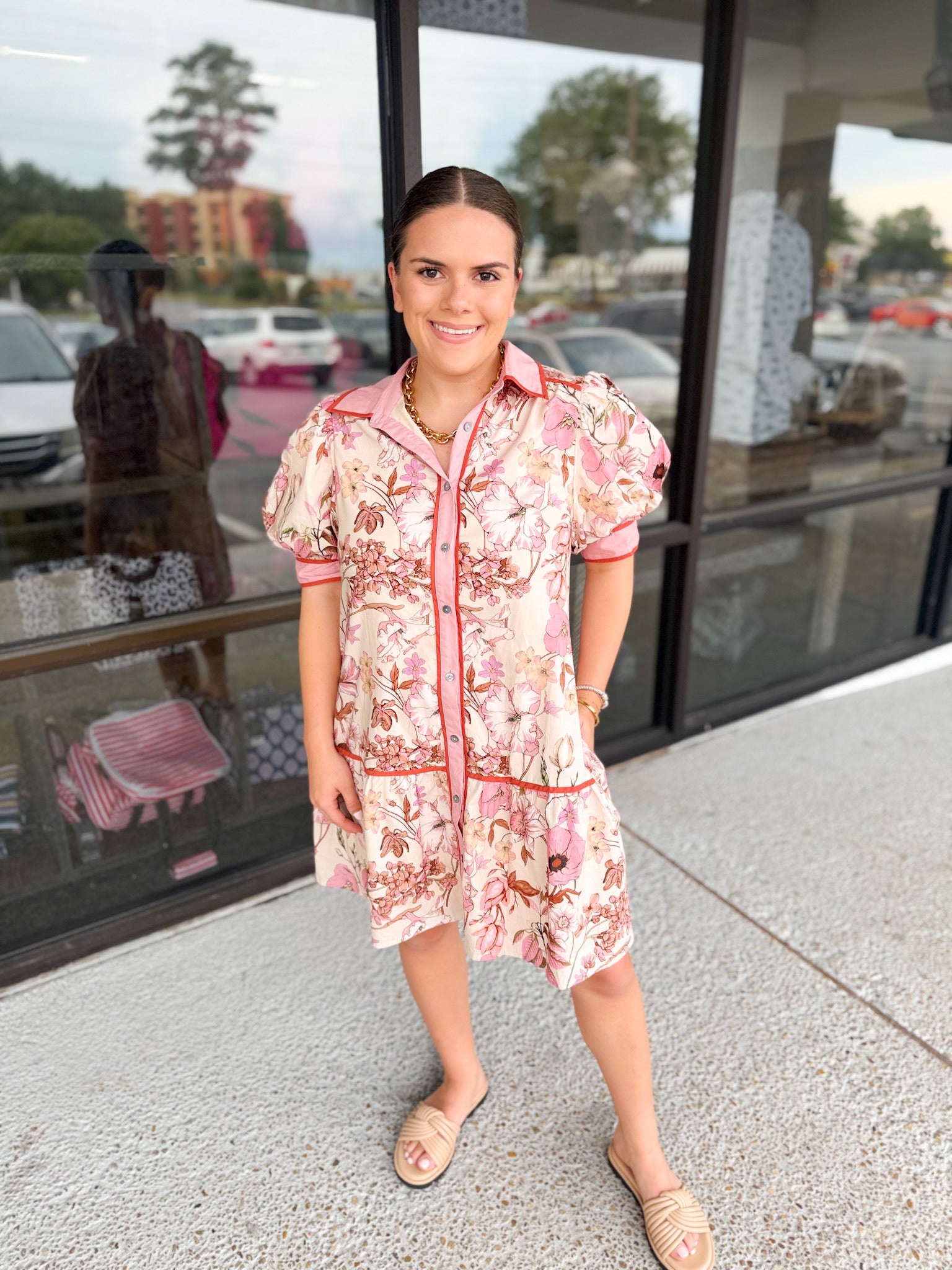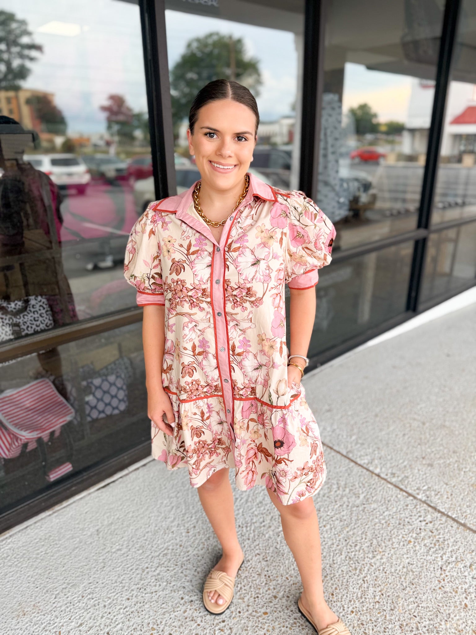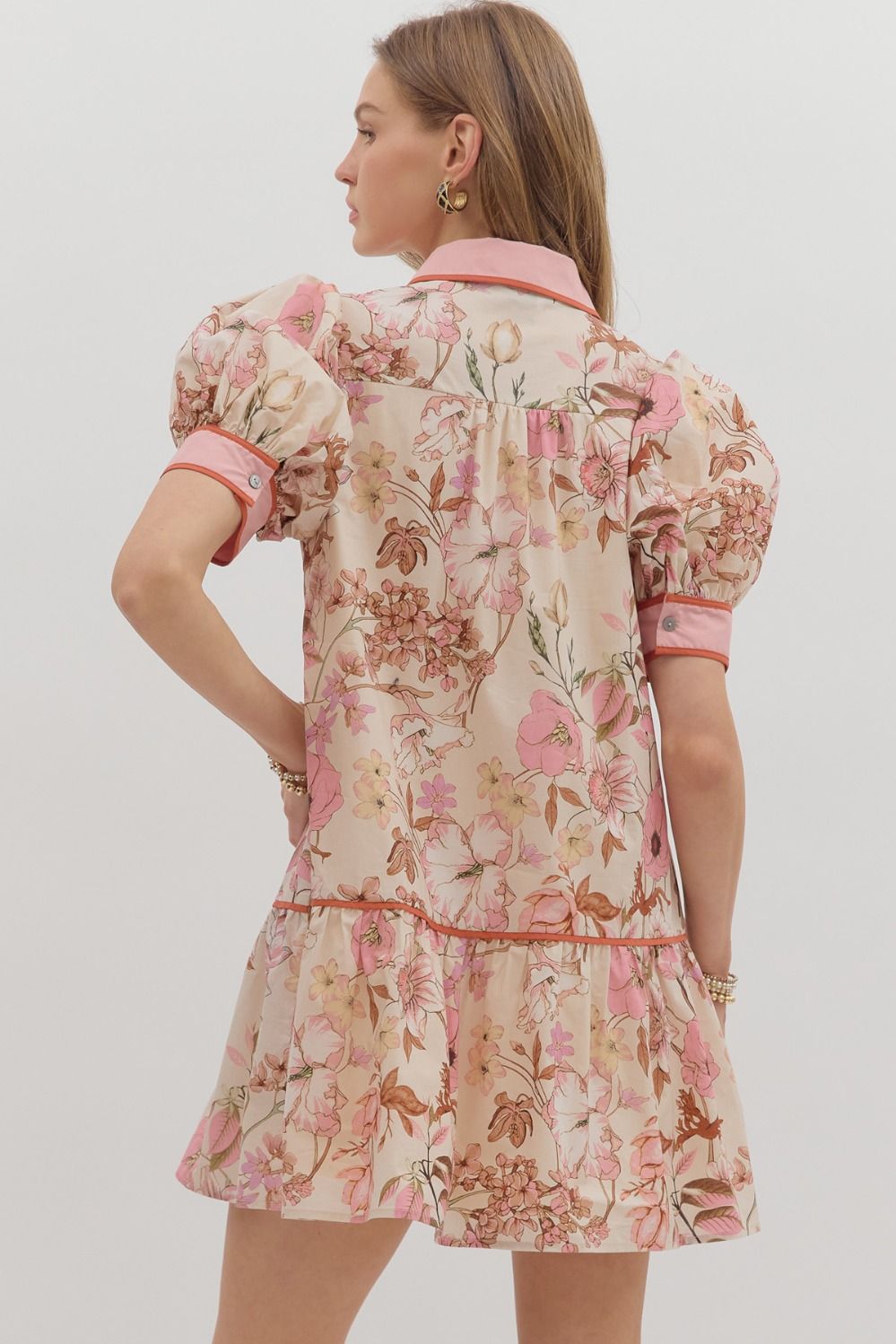 Floral print ruffle hem mini dress featuring contrast accent collar button front closure and sleeve band. Side pockets. Lined. Woven. Non-sheer. Lightweight.