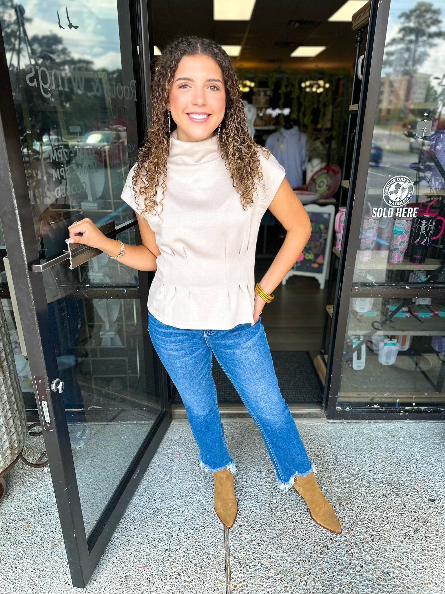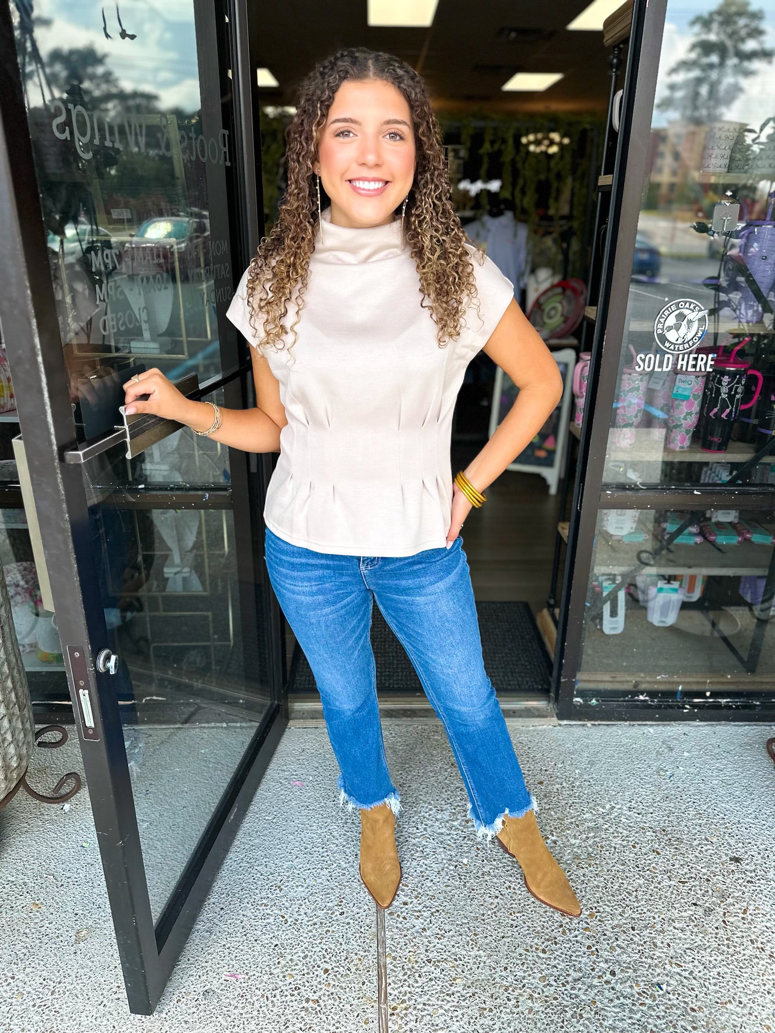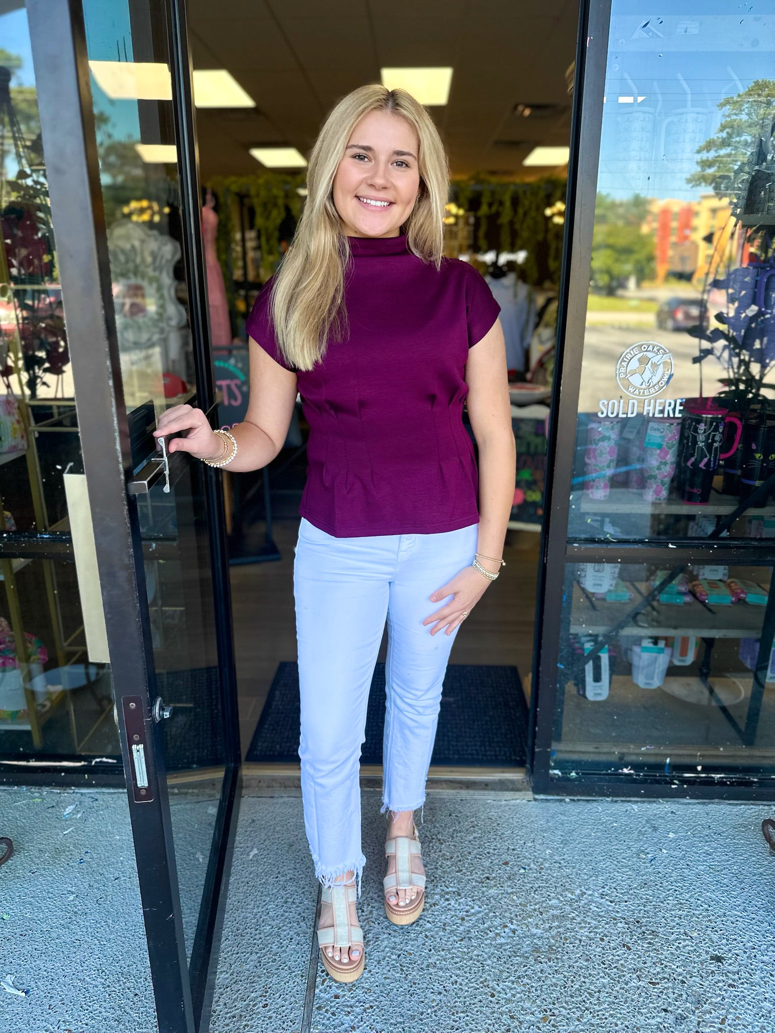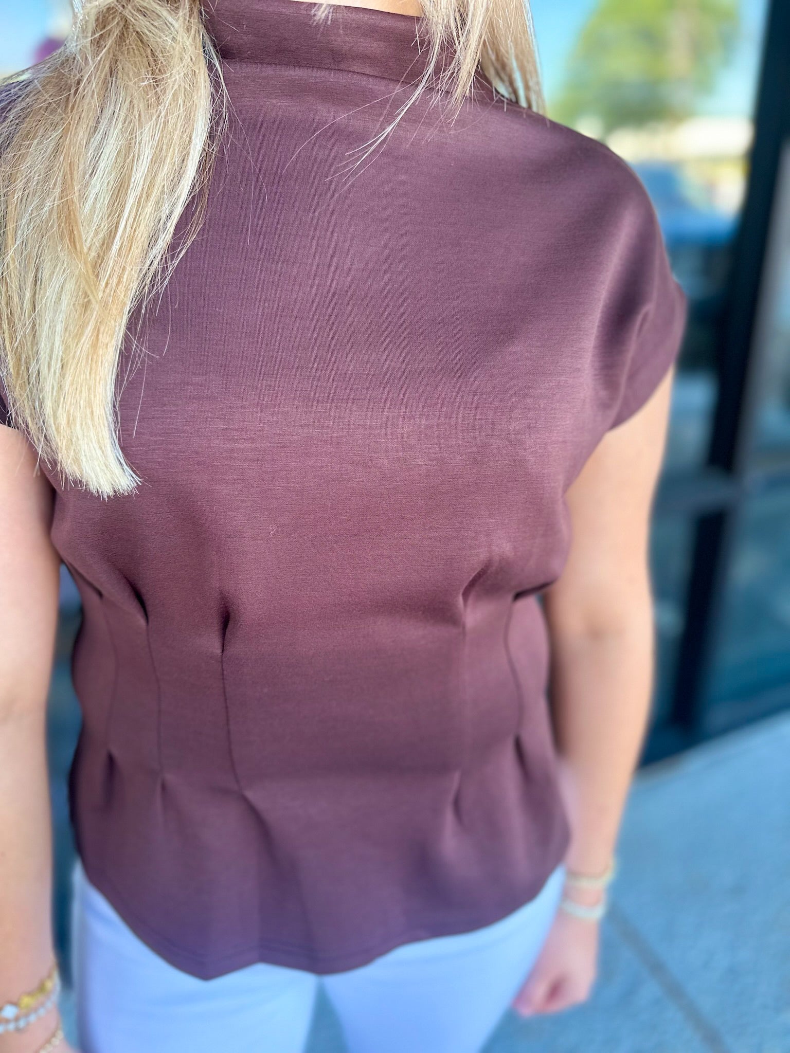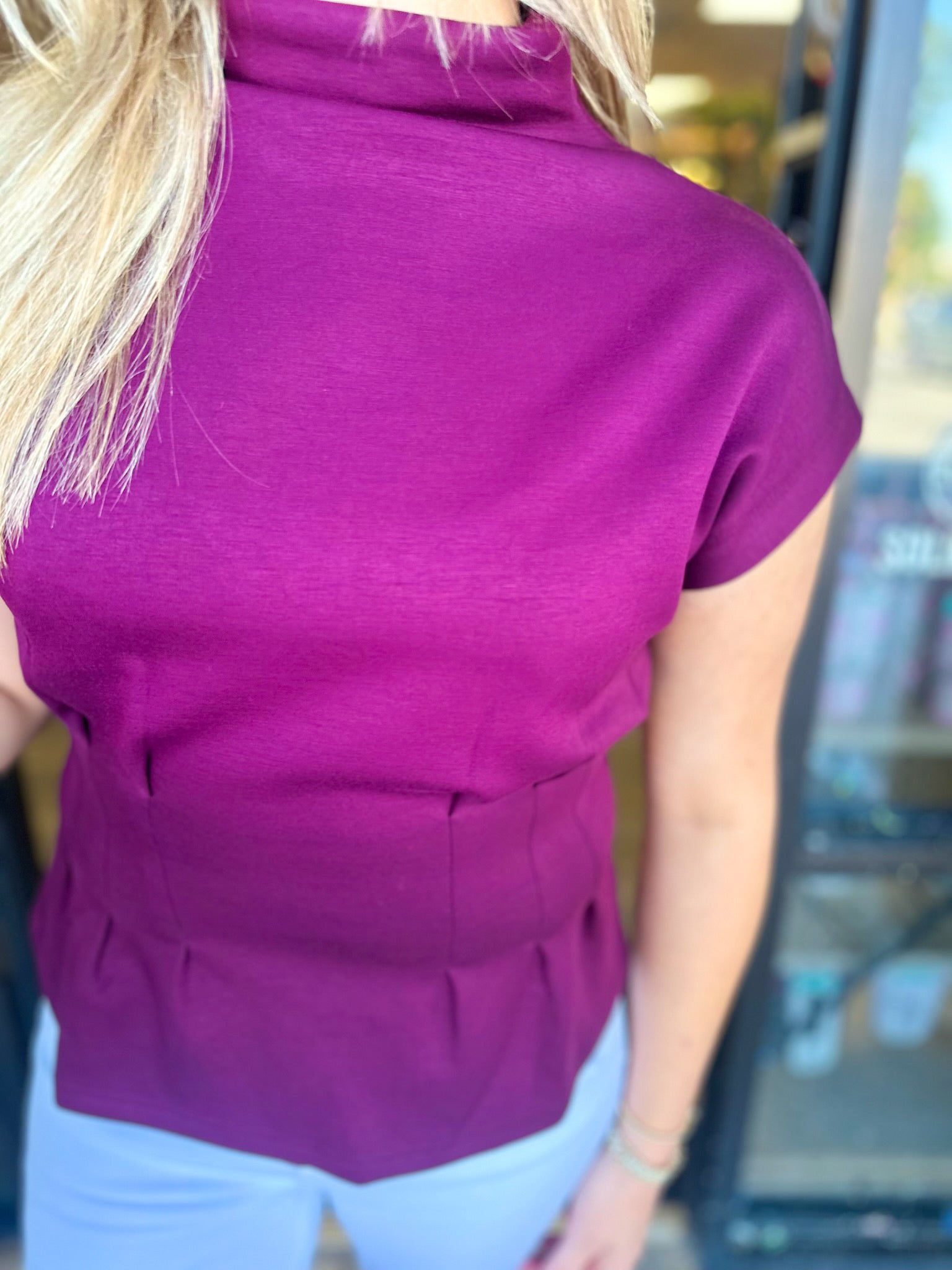 Solid short sleeve mock neck top featuring pleated waist shaping. Unlined. Knit. Non-sheer. Lightweight.