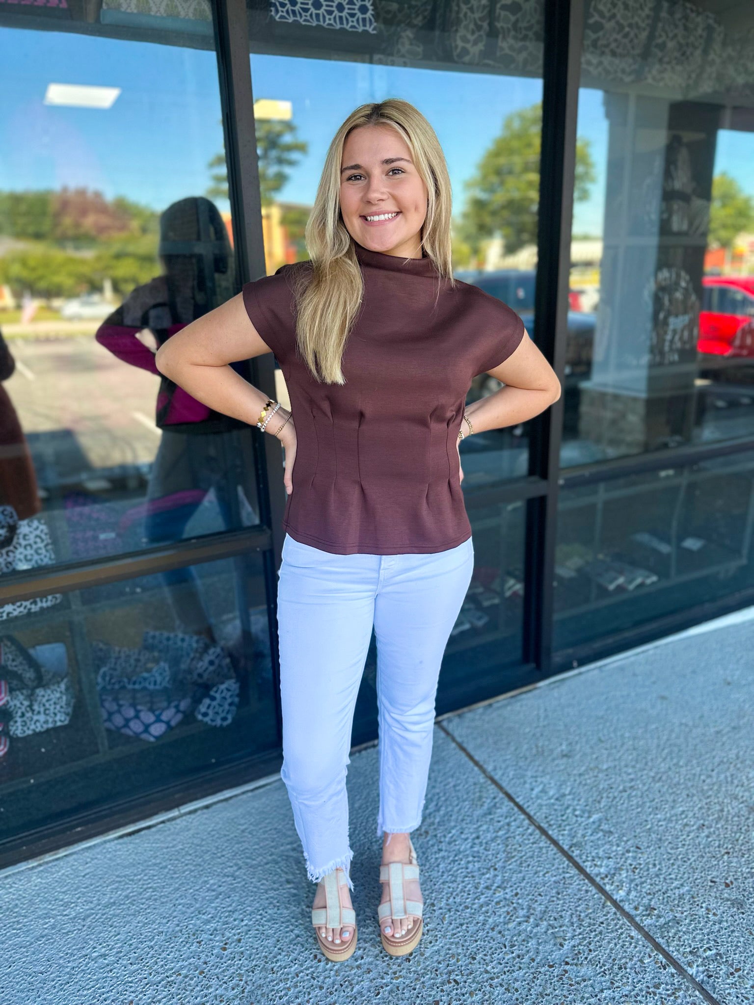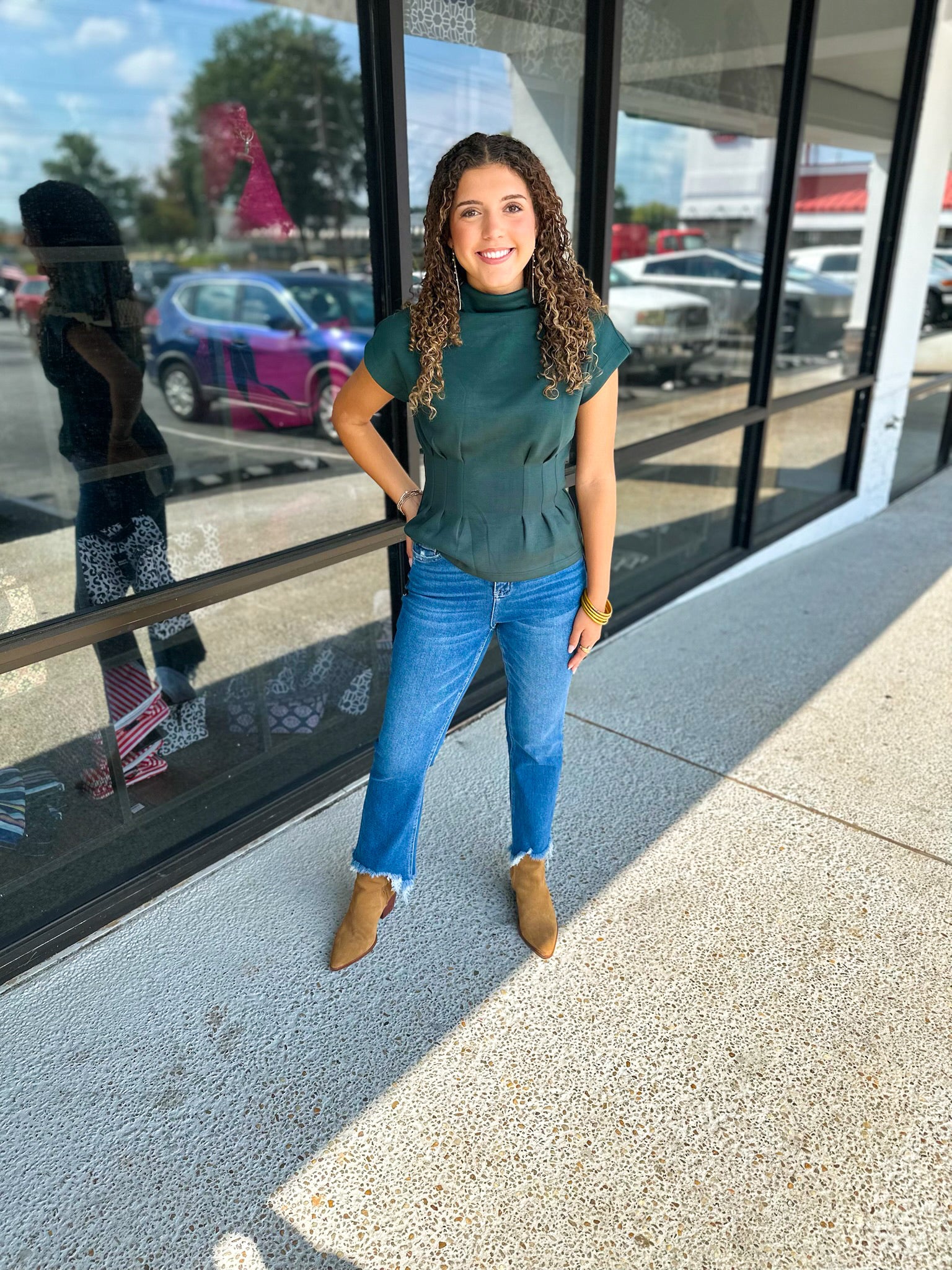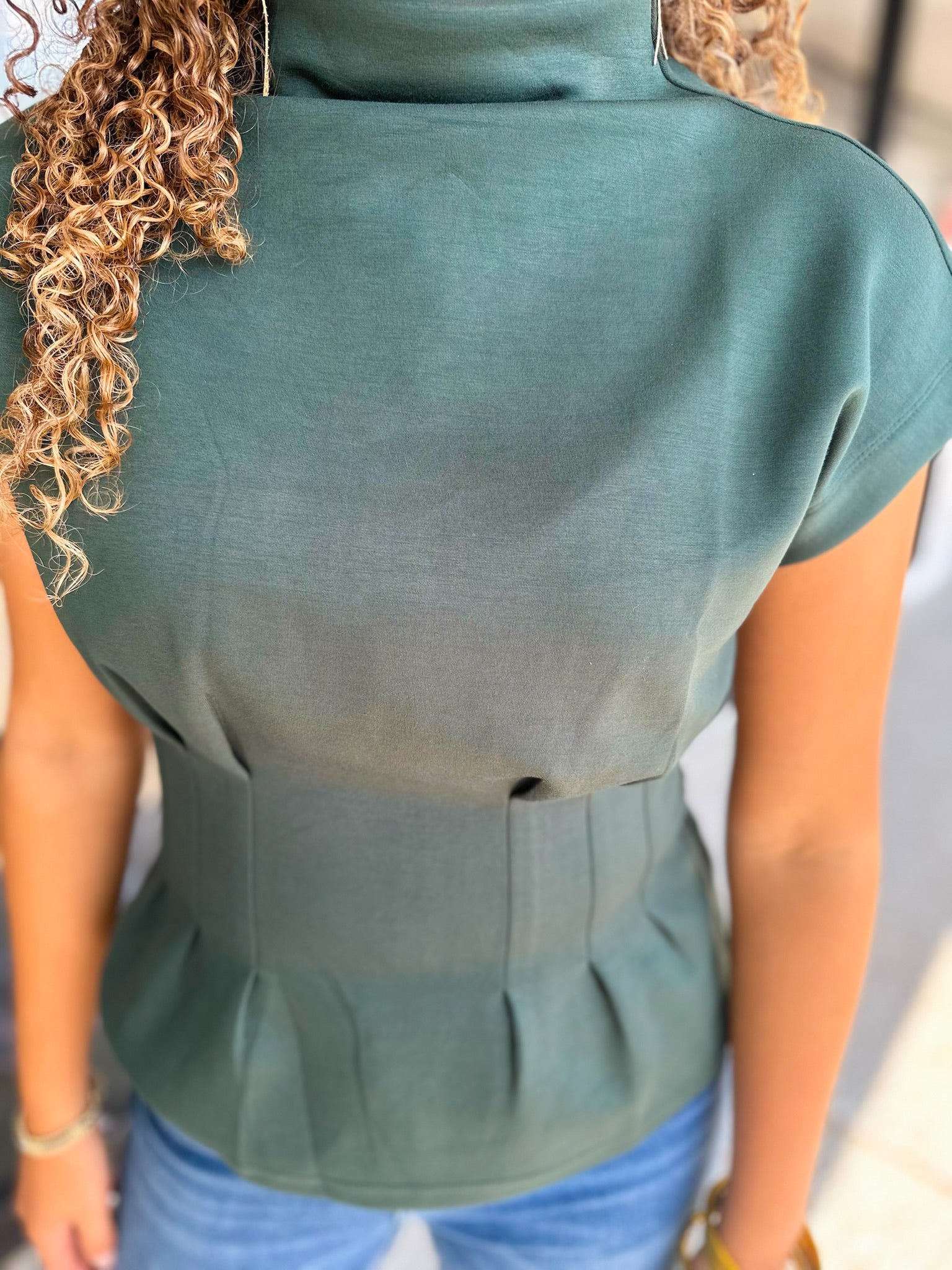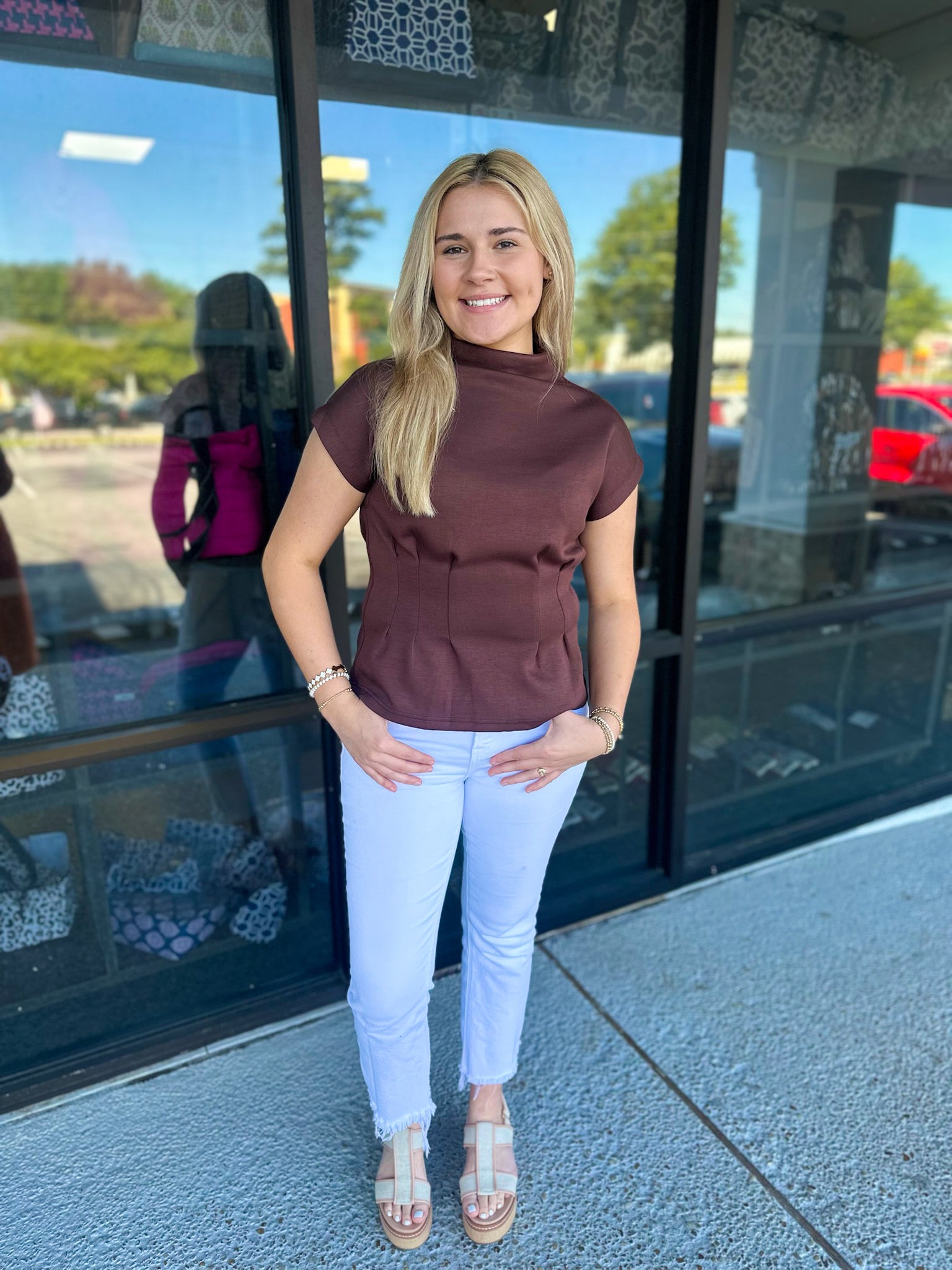 Solid short sleeve mock neck top featuring pleated waist shaping. Unlined. Knit. Non-sheer. Lightweight.