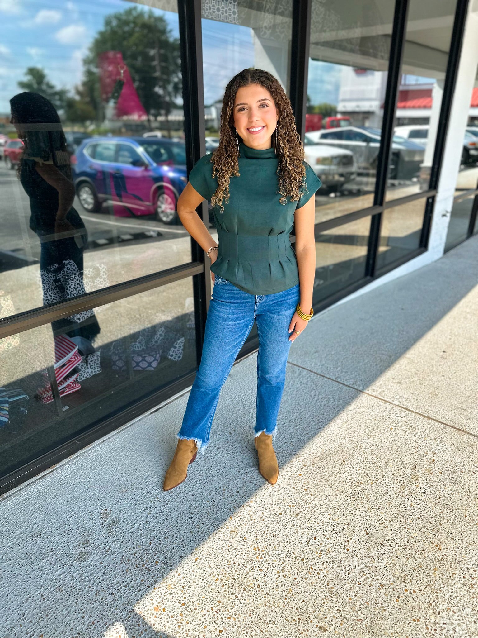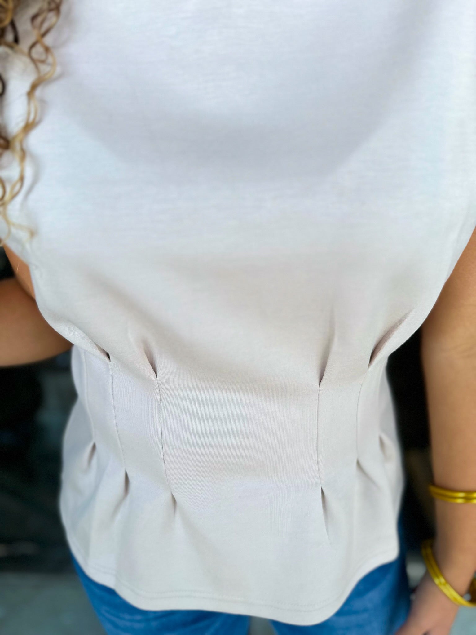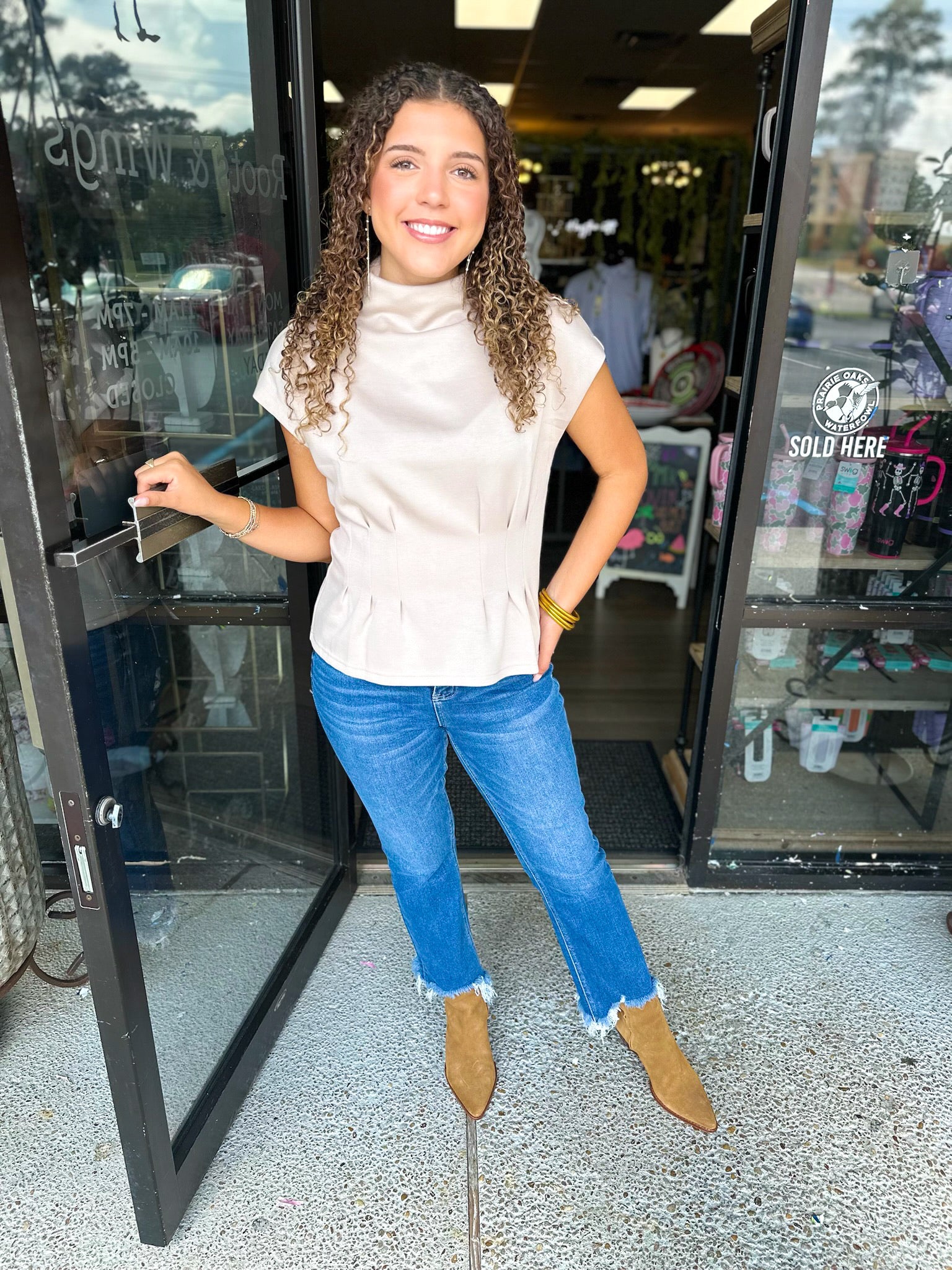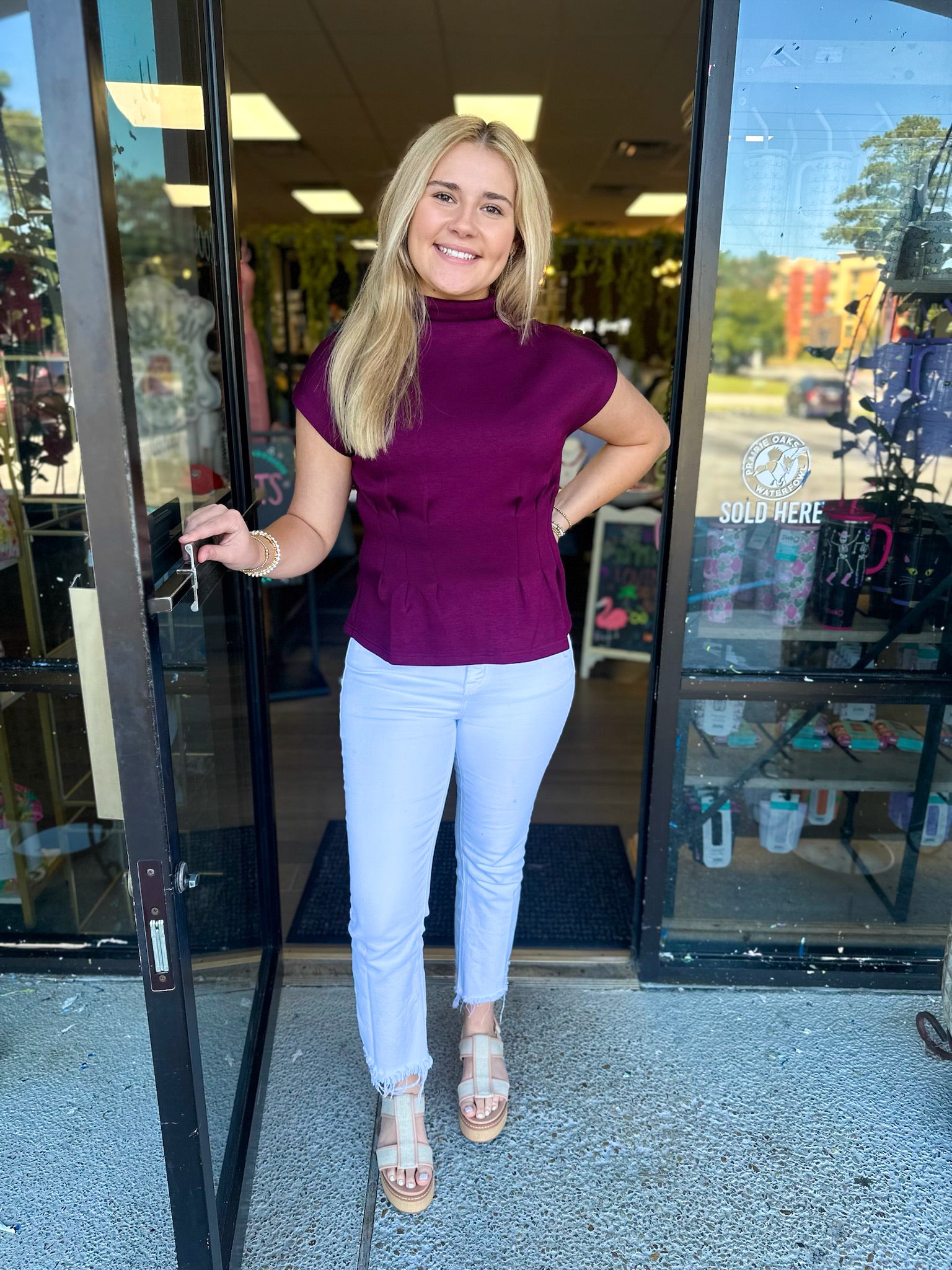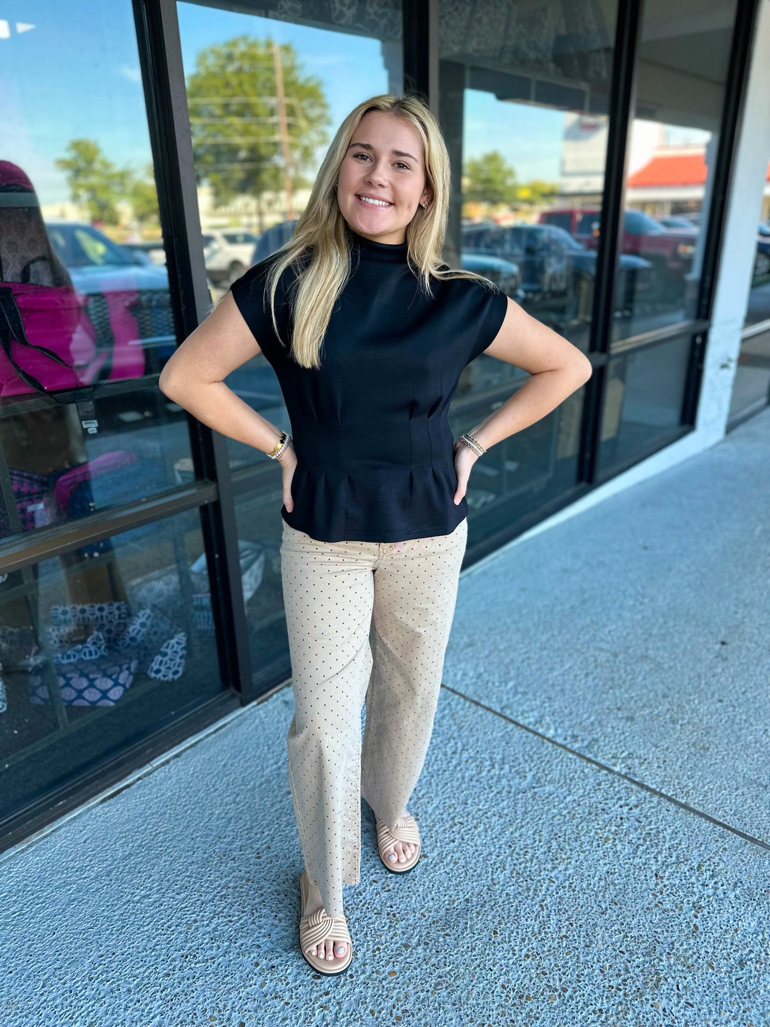 Solid short sleeve mock neck top featuring pleated waist shaping. Unlined. Knit. Non-sheer. Lightweight.