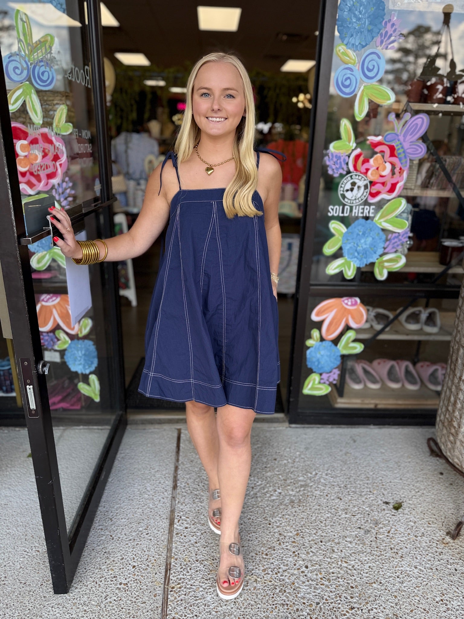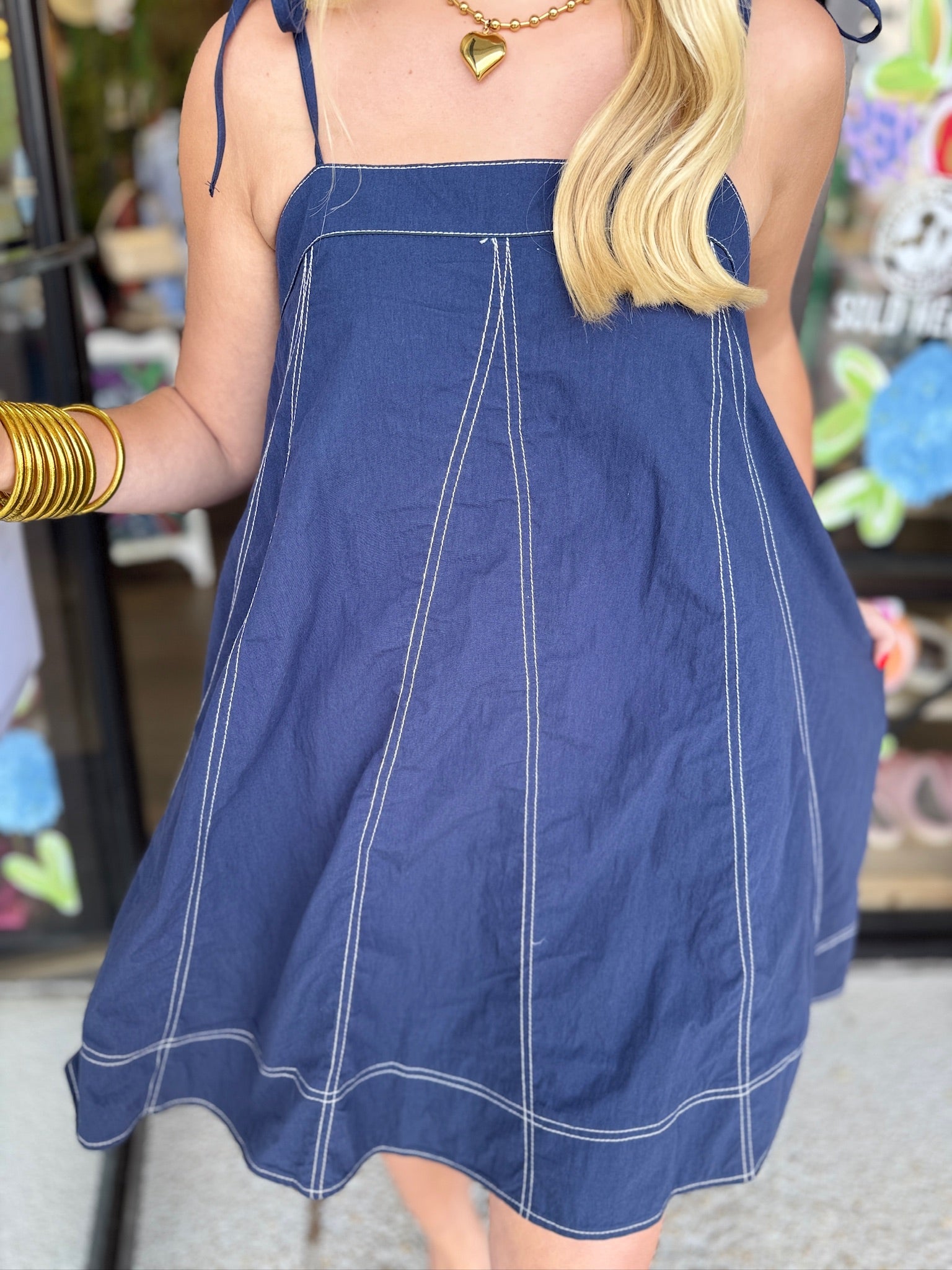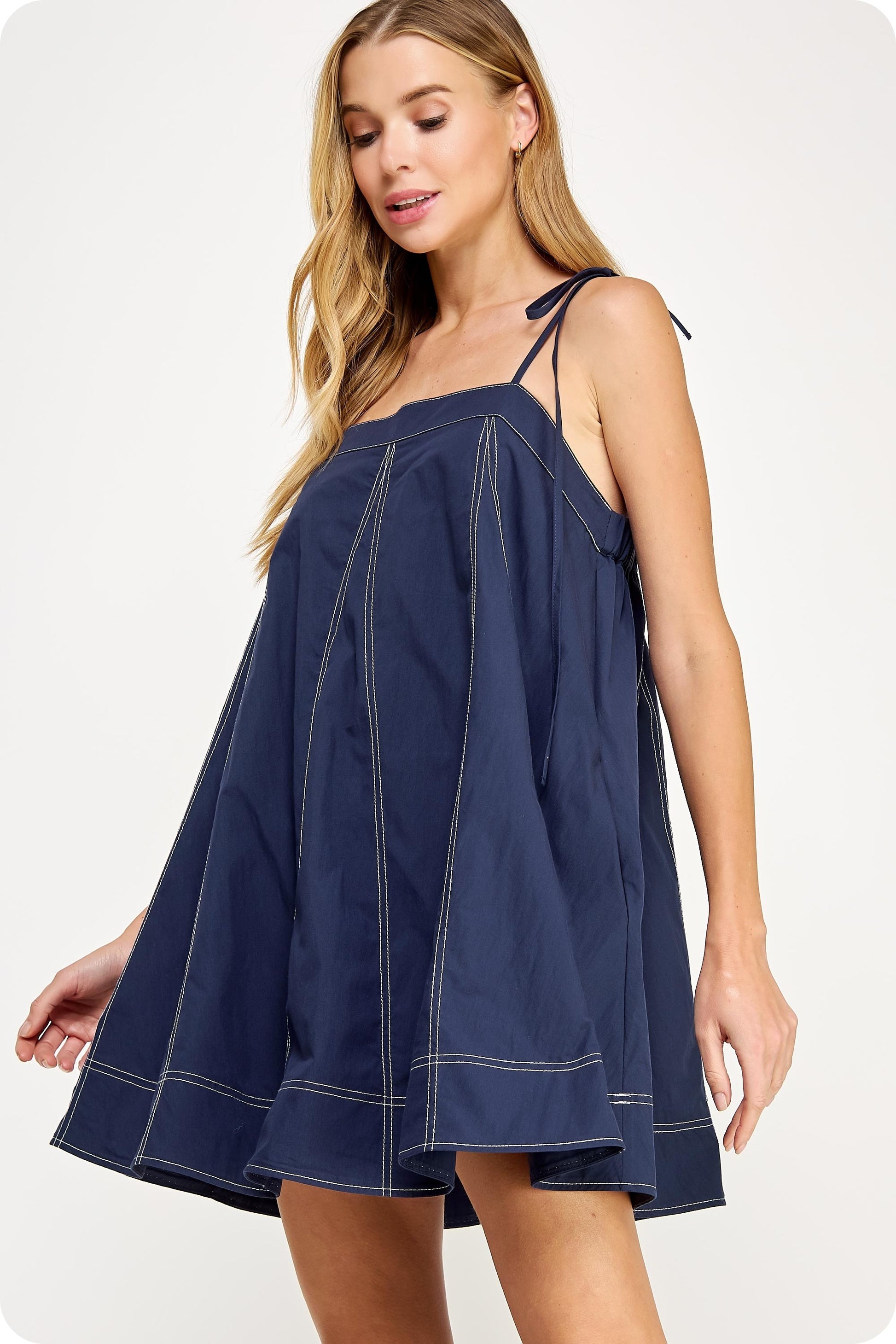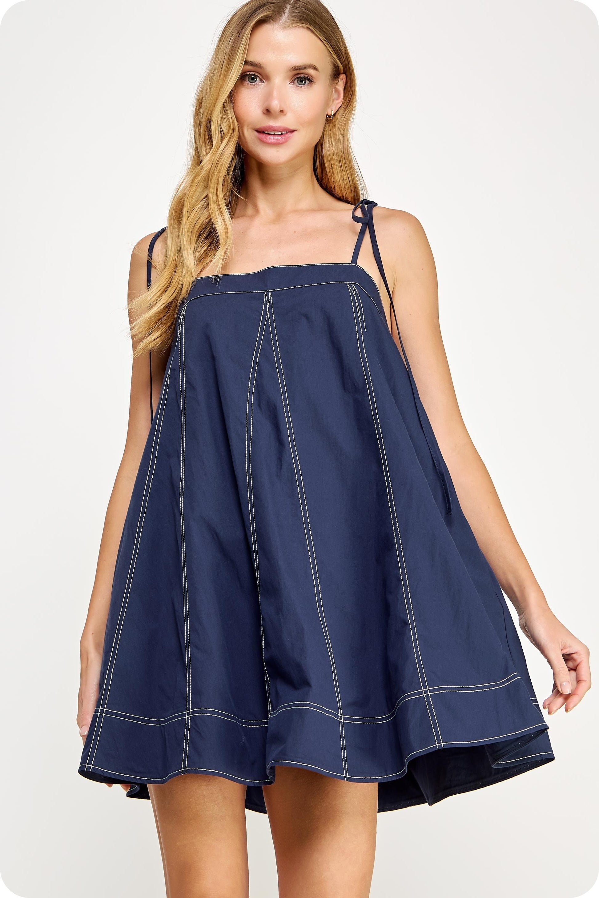 Contrast top stitch mini dress in cotton blend poplin fabric. This baby doll style features full lining for comfort, adjustable tie straps, elasticated back for flattering, side pockets, and contrast top stitch detail throughout.