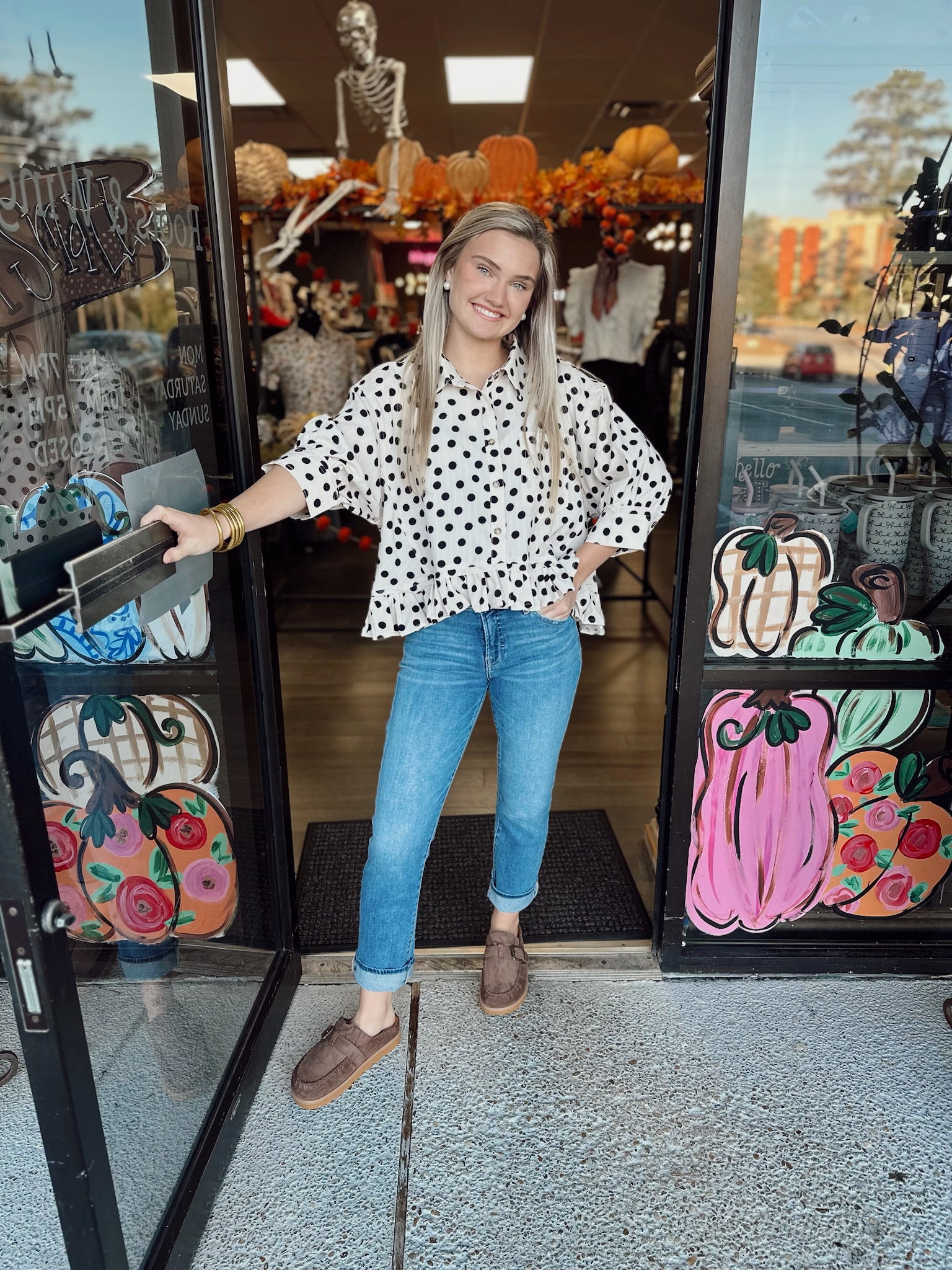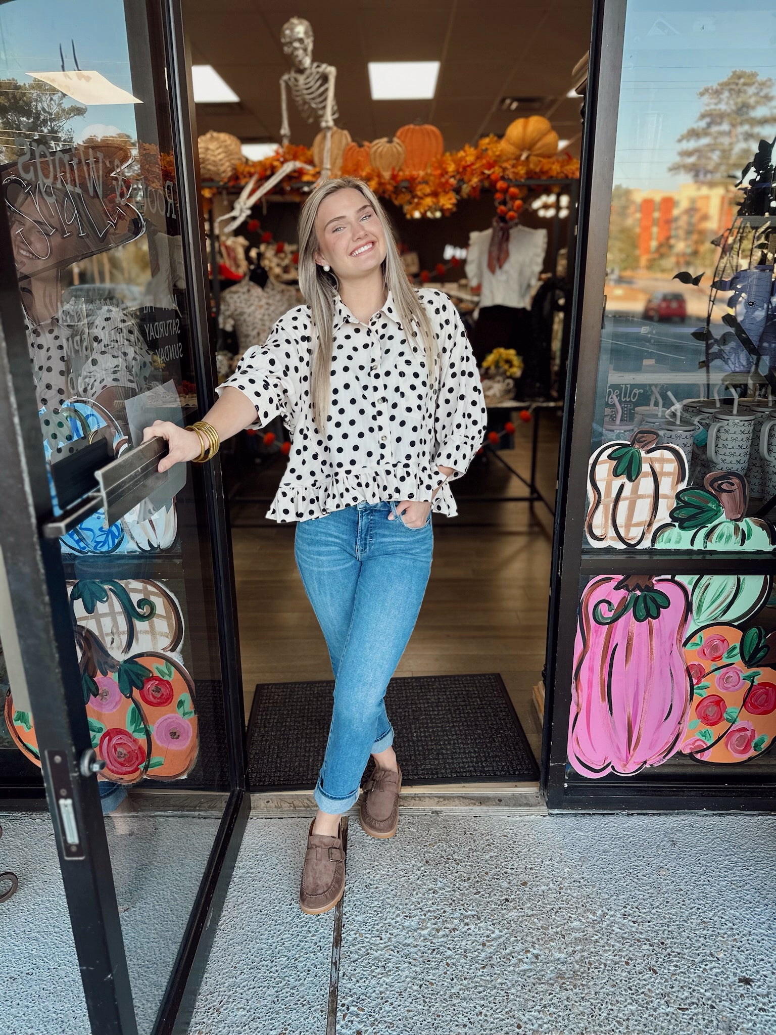 POLKA DOT PRINTED PEPLUM TOP WITH LONG SLEEVES AND FRONT BUTTON CLOSURE