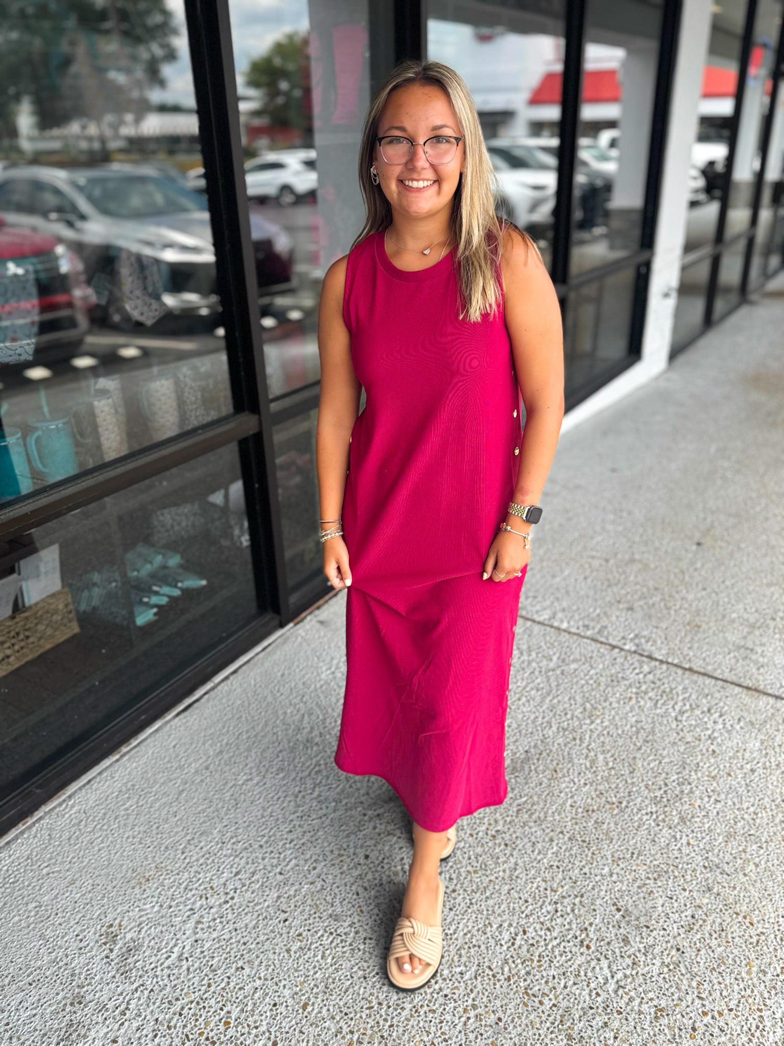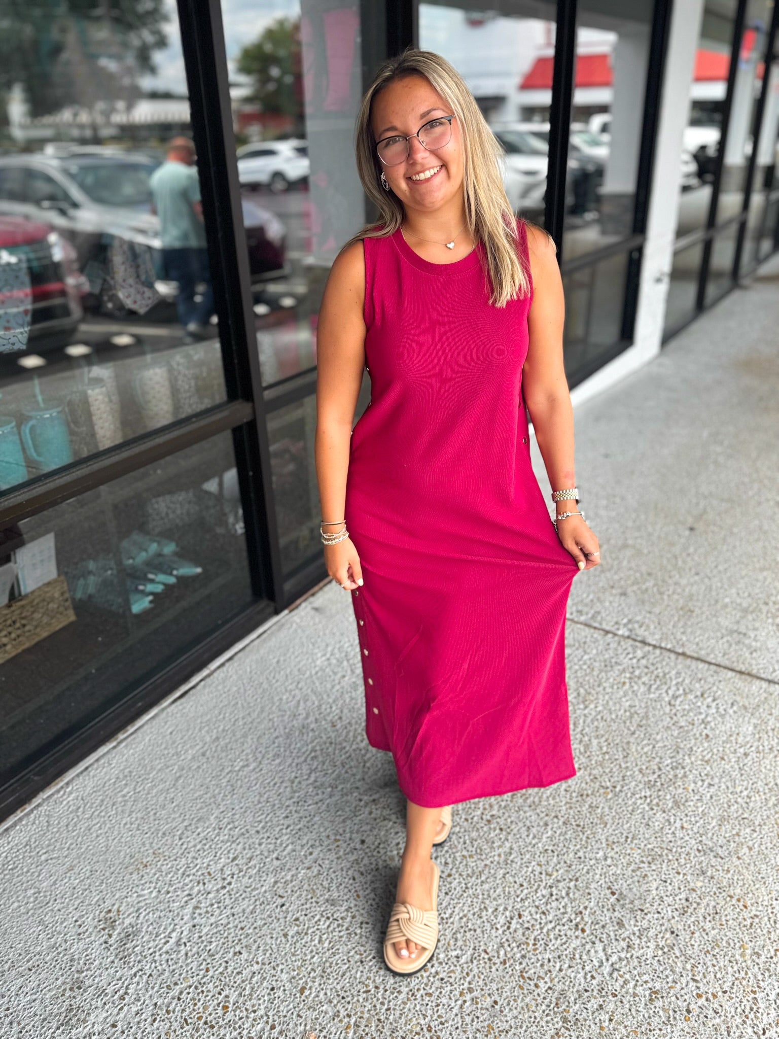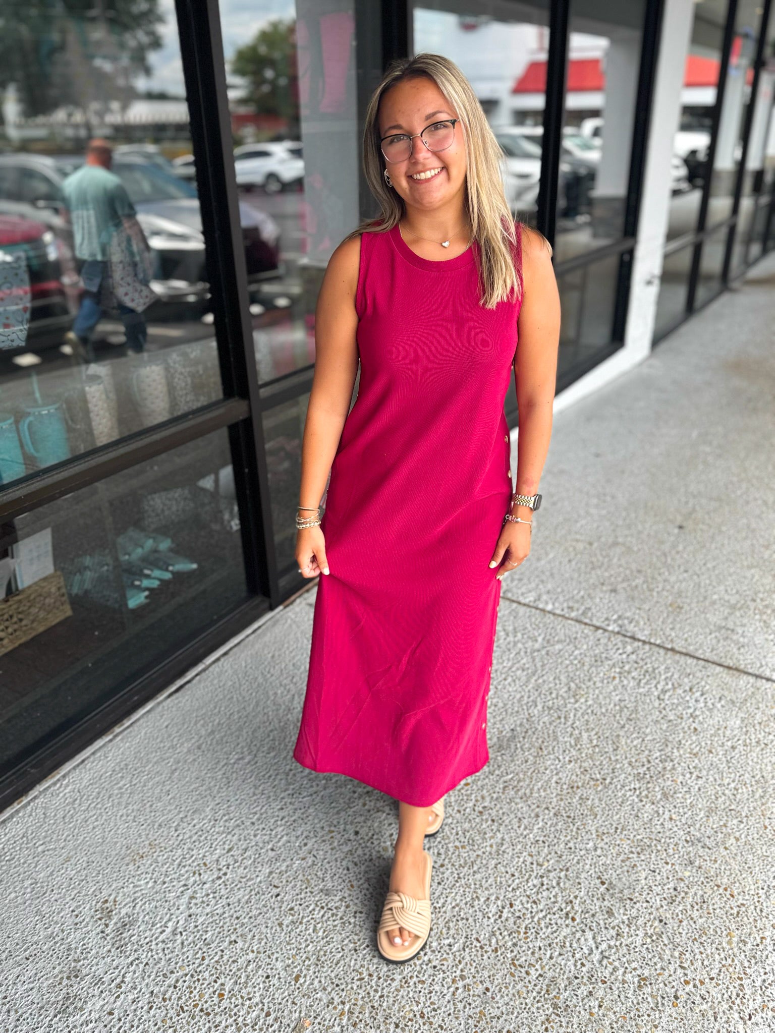 Details: Solid rib textured sleeveless pullover midi dress featuring gold accented button at side. Slit hem at back. Unlined. Knit. Non-sheer. Lightweight.