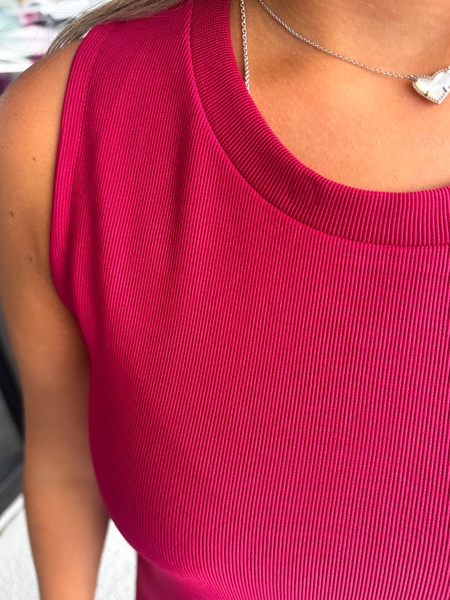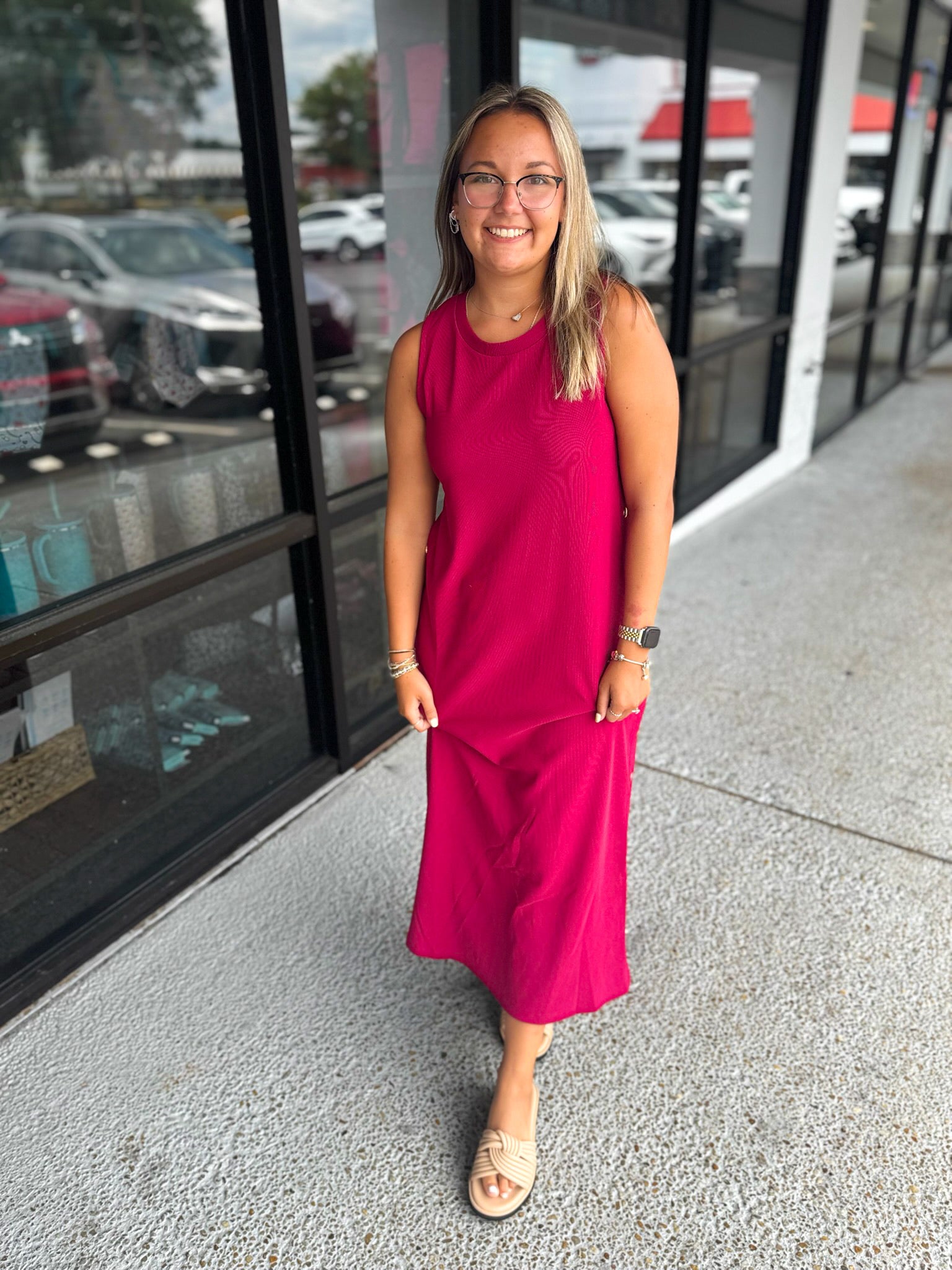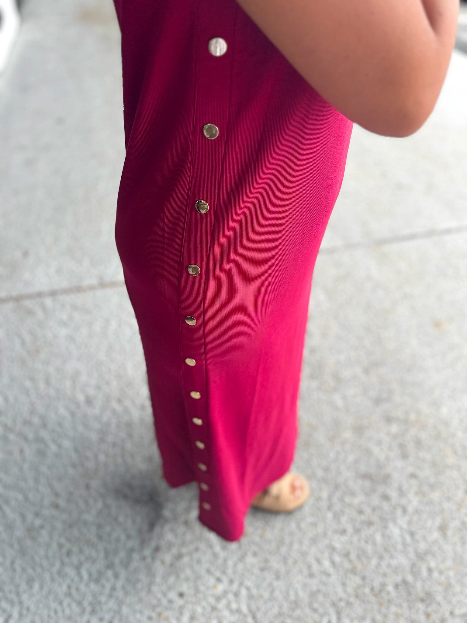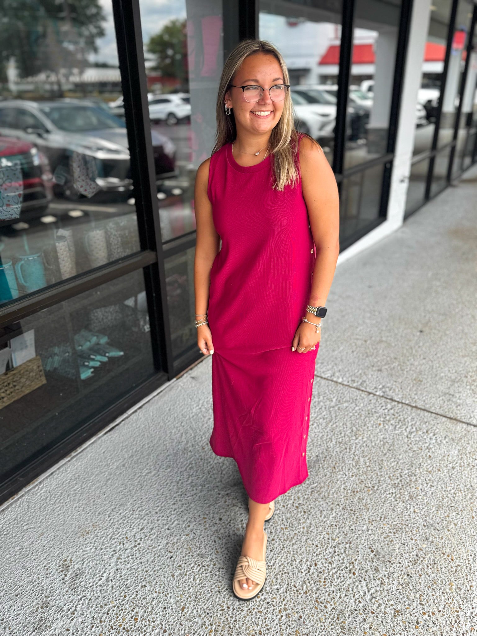 Details: Solid rib textured sleeveless pullover midi dress featuring gold accented button at side. Slit hem at back. Unlined. Knit. Non-sheer. Lightweight.
