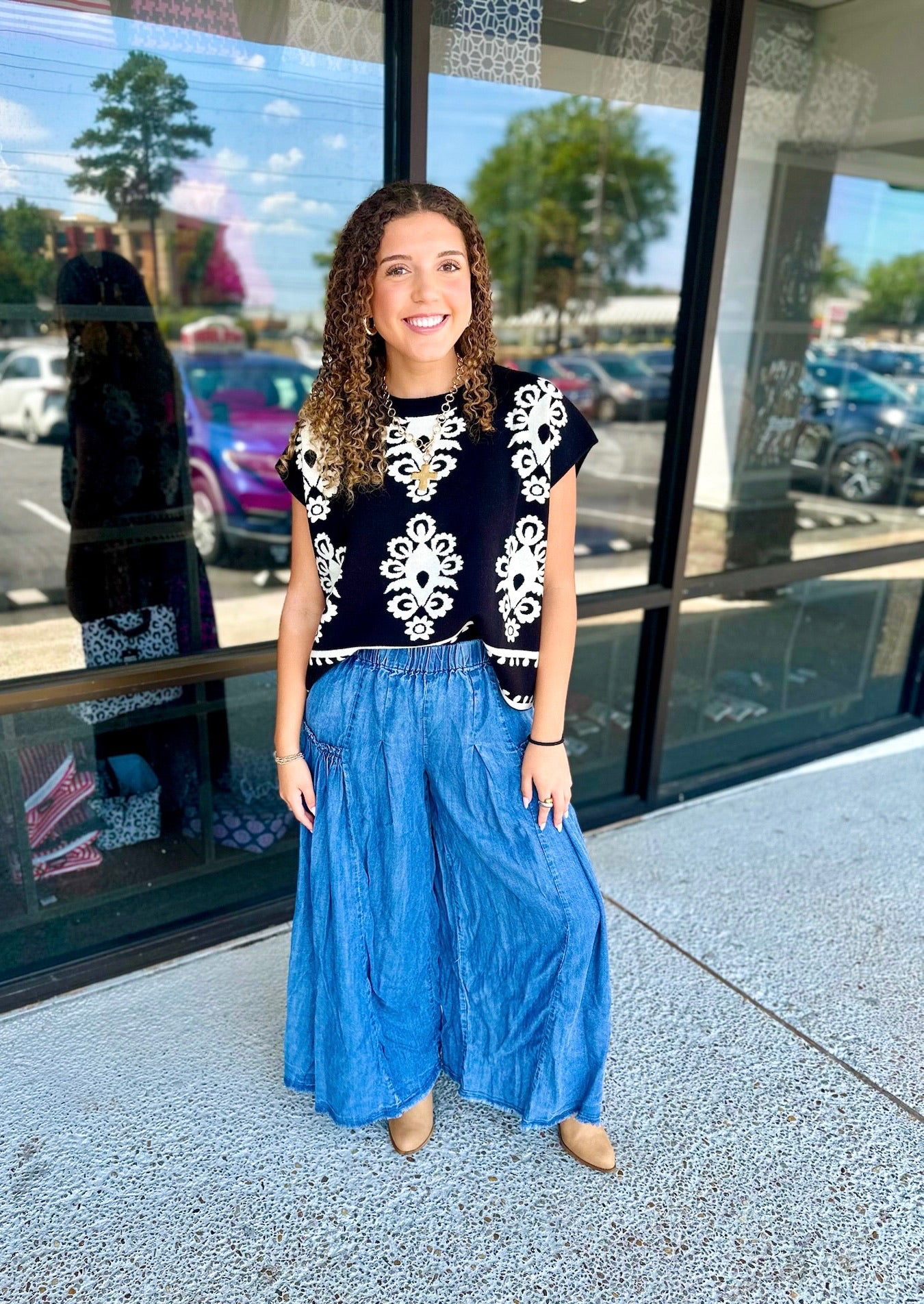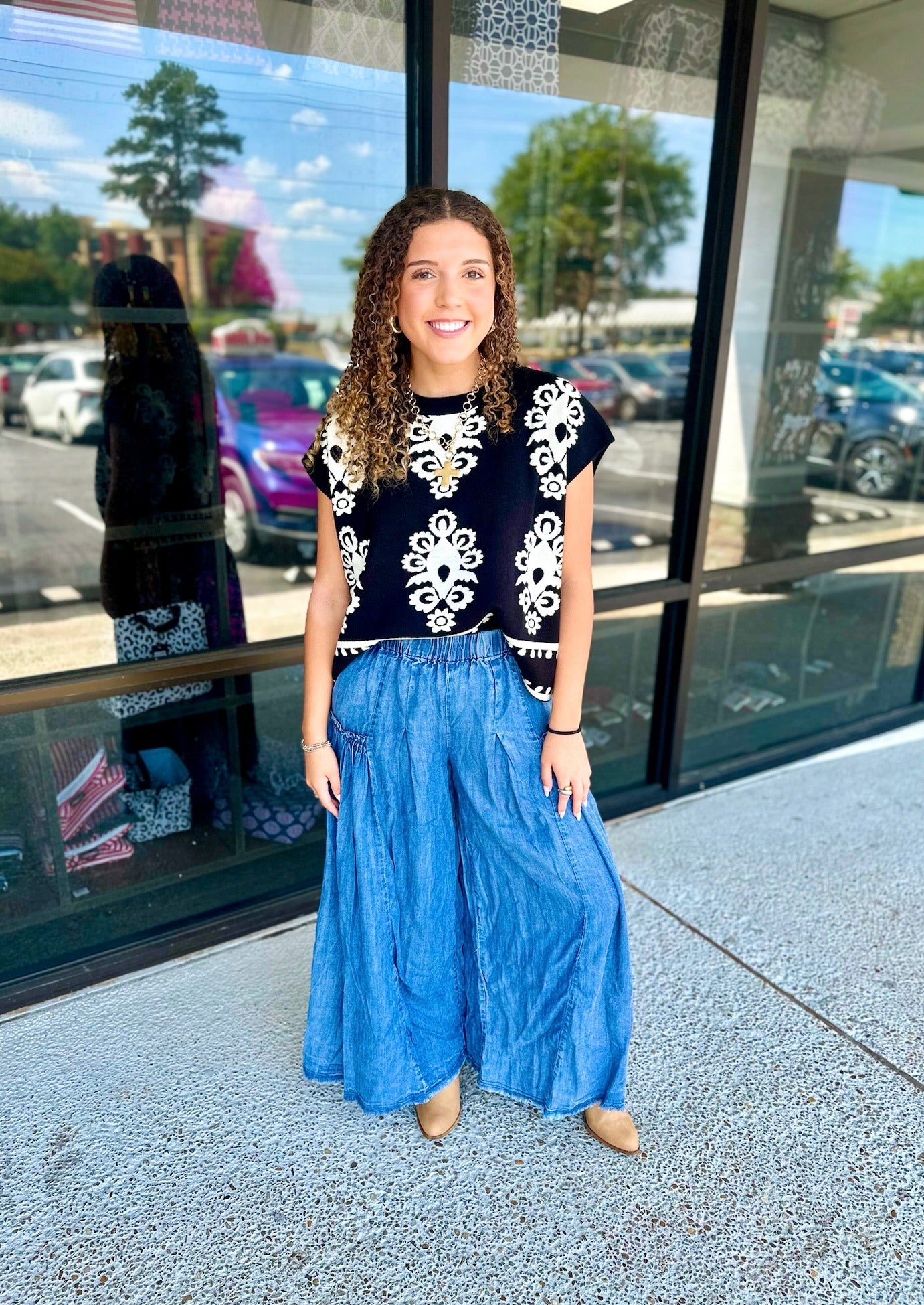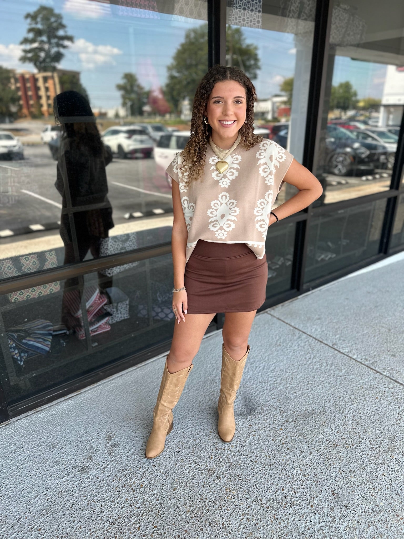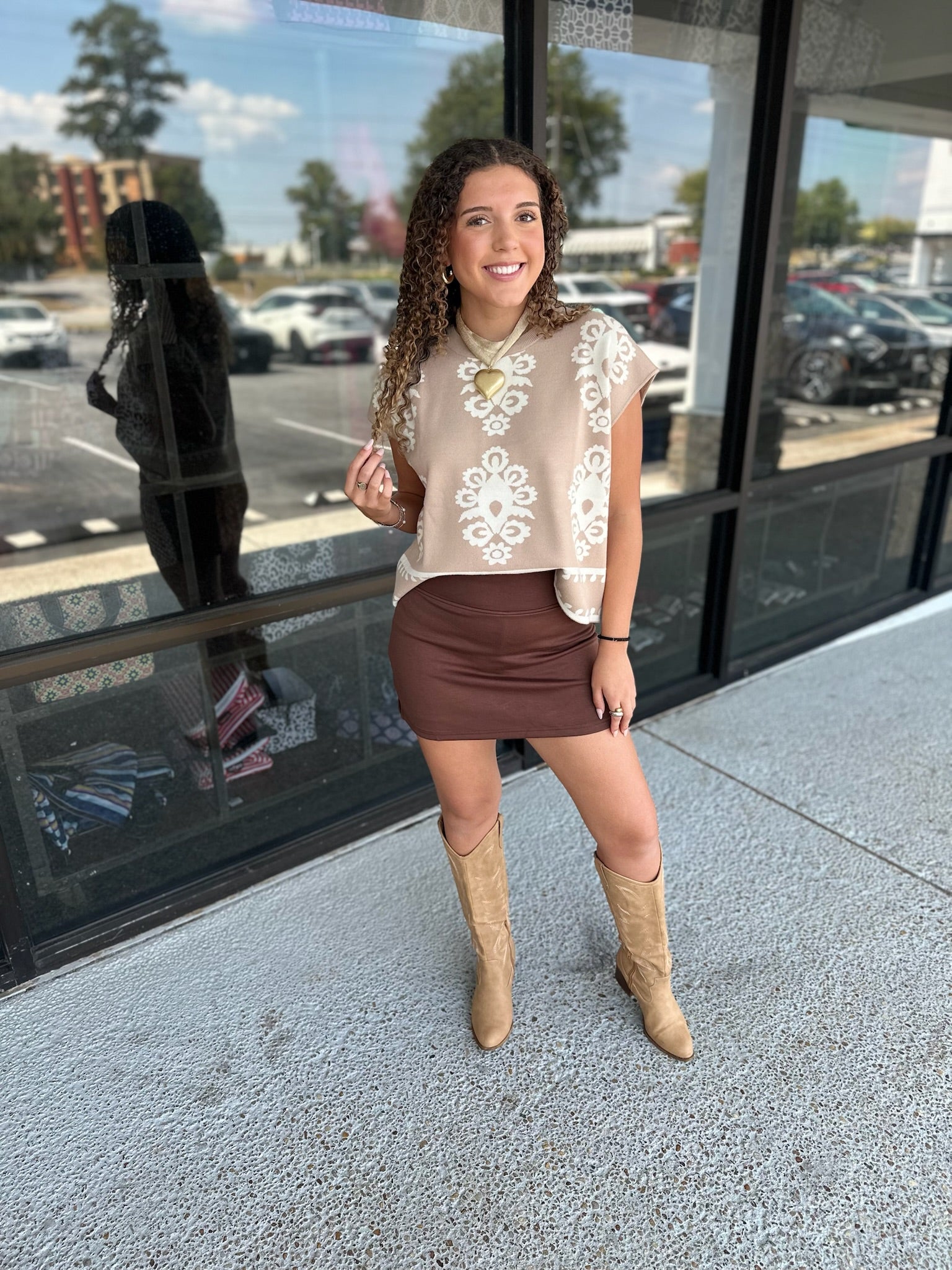 Damask pattern sweater knit muscle tee pullover top. Unlined. Knit. Non-sheer. Lightweight.