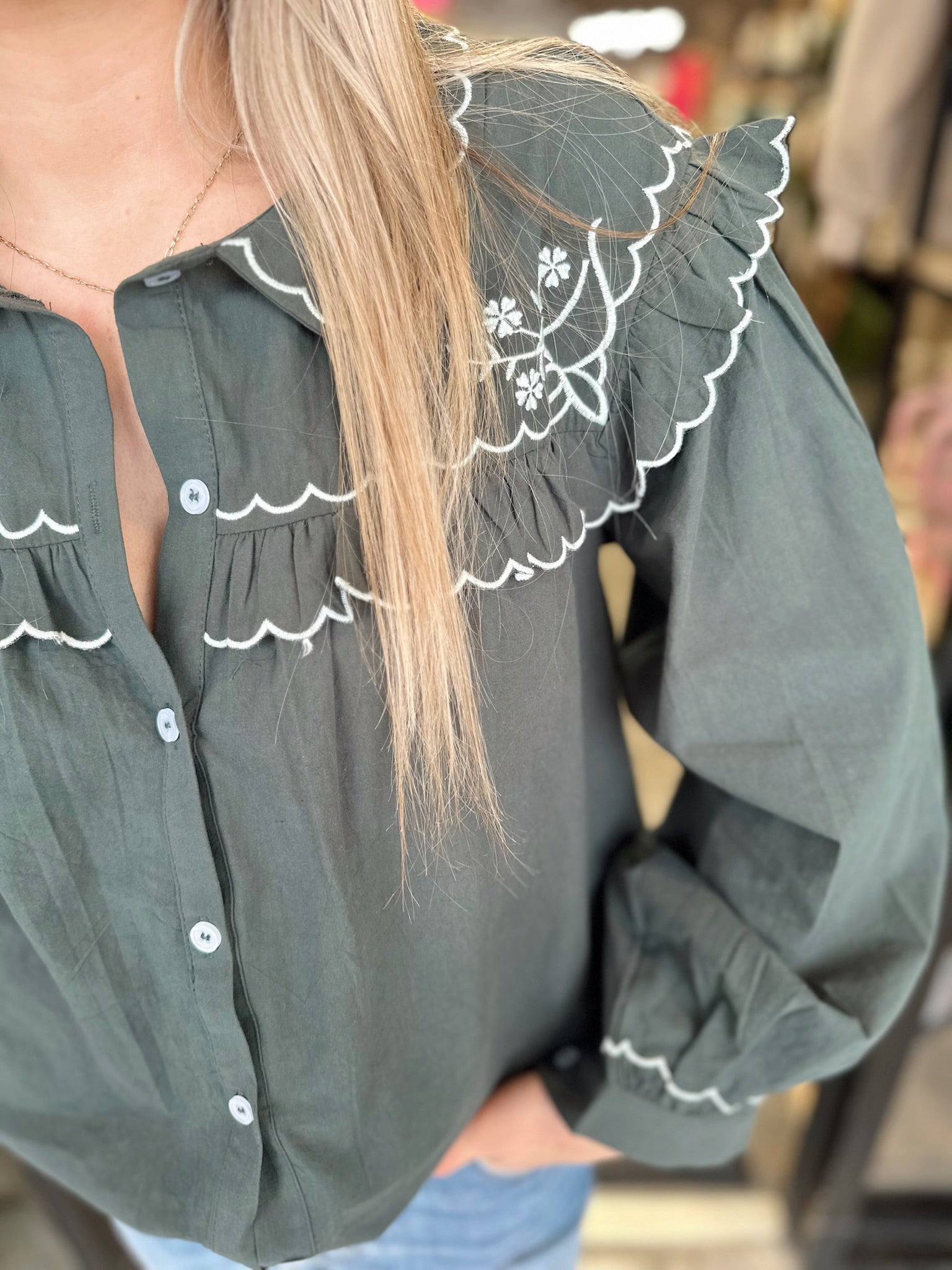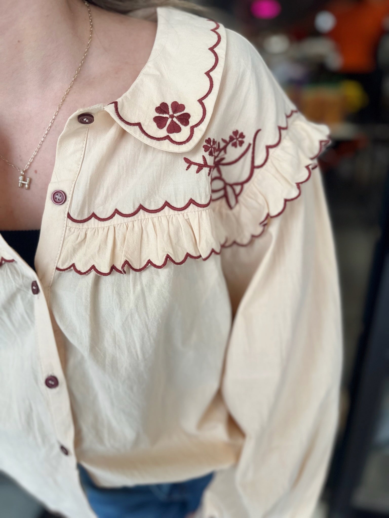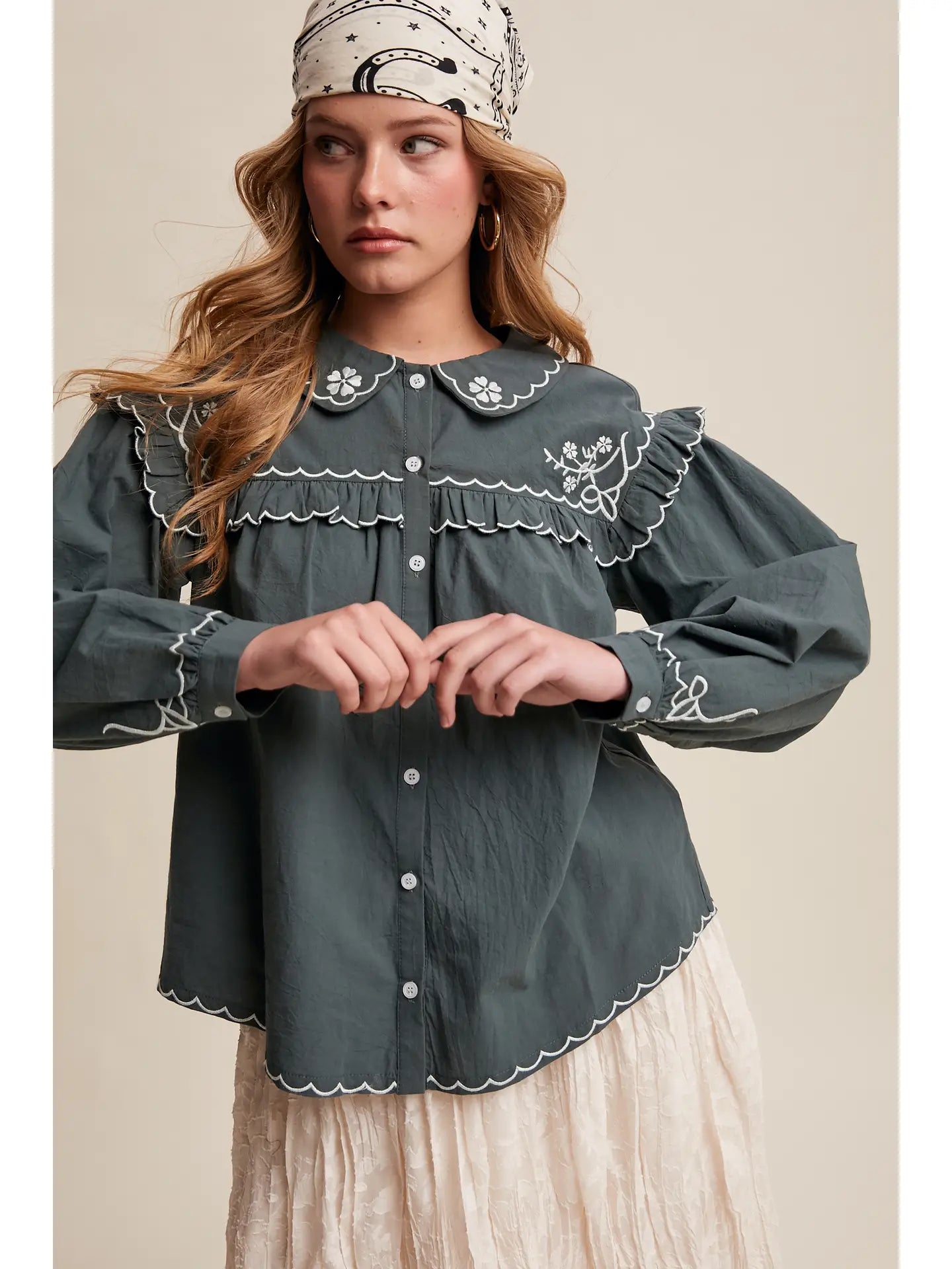 Lightweight Cotton Fabric: Made from breathable woven cotton for all-day comfort - Oversized Ruffle Collar: Features a double-layered scalloped collar with floral embroidery for a romantic touch - Embroidered Details: Contrasting embroidery on the collar, cuffs, and hemline adds vintage-inspired charm - Full Button Front: Easy-to-wear closure with delicate matching buttons - Puff Long Sleeves: Voluminous sleeves with elasticized cuffs for a soft, billowy silhouette - Relaxed Fit: Gently draped body offers a breezy, effortless feel