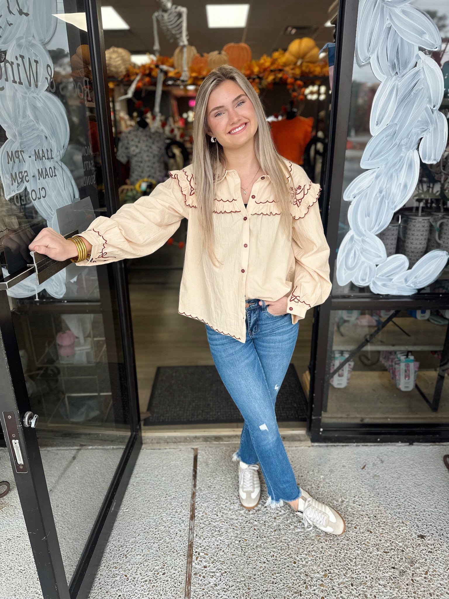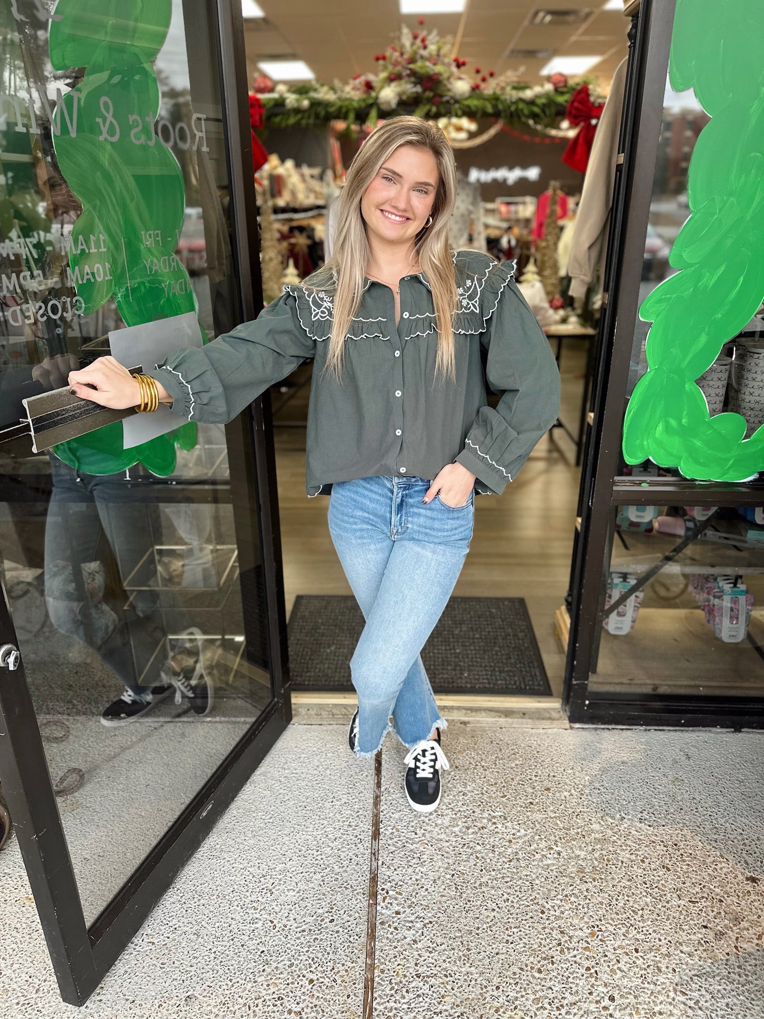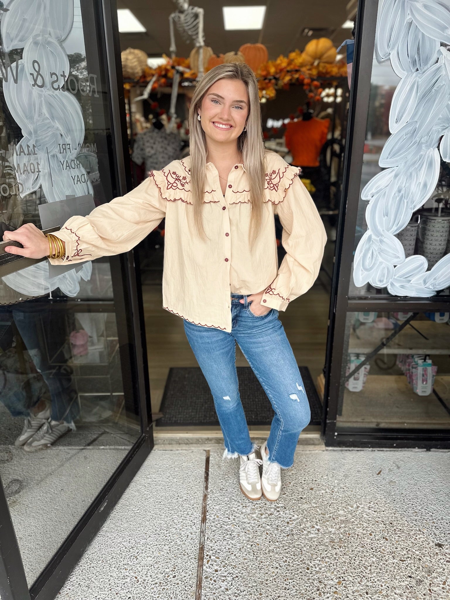Lightweight Cotton Fabric: Made from breathable woven cotton for all-day comfort - Oversized Ruffle Collar: Features a double-layered scalloped collar with floral embroidery for a romantic touch - Embroidered Details: Contrasting embroidery on the collar, cuffs, and hemline adds vintage-inspired charm - Full Button Front: Easy-to-wear closure with delicate matching buttons - Puff Long Sleeves: Voluminous sleeves with elasticized cuffs for a soft, billowy silhouette - Relaxed Fit: Gently draped body offers a breezy, effortless feel