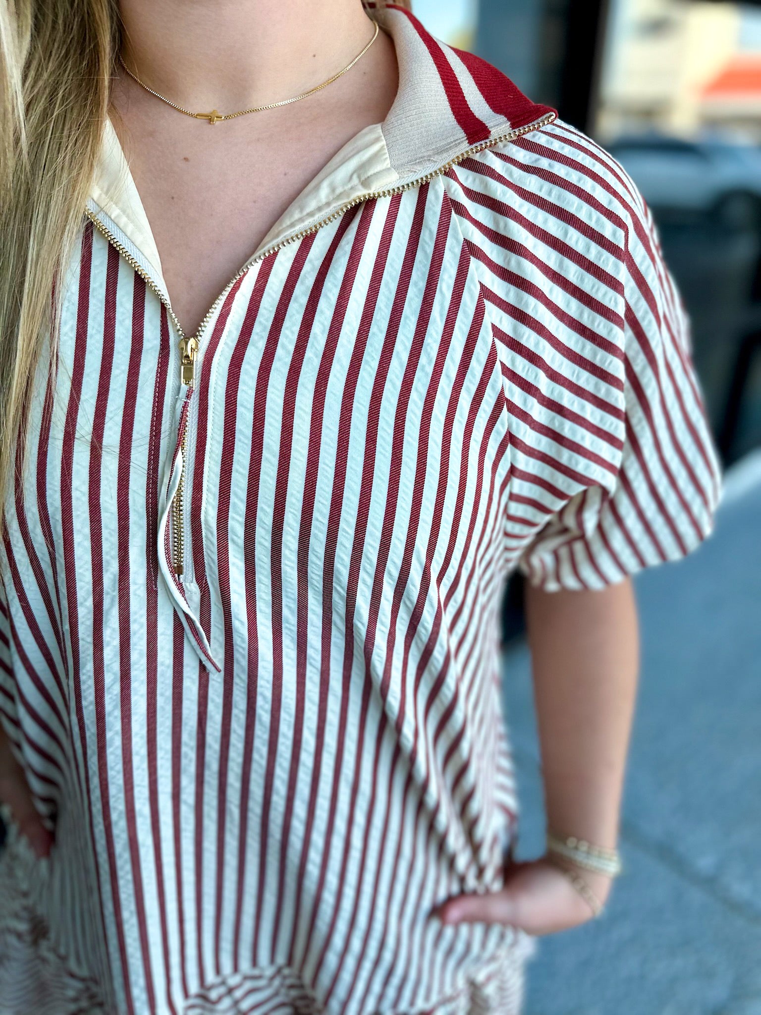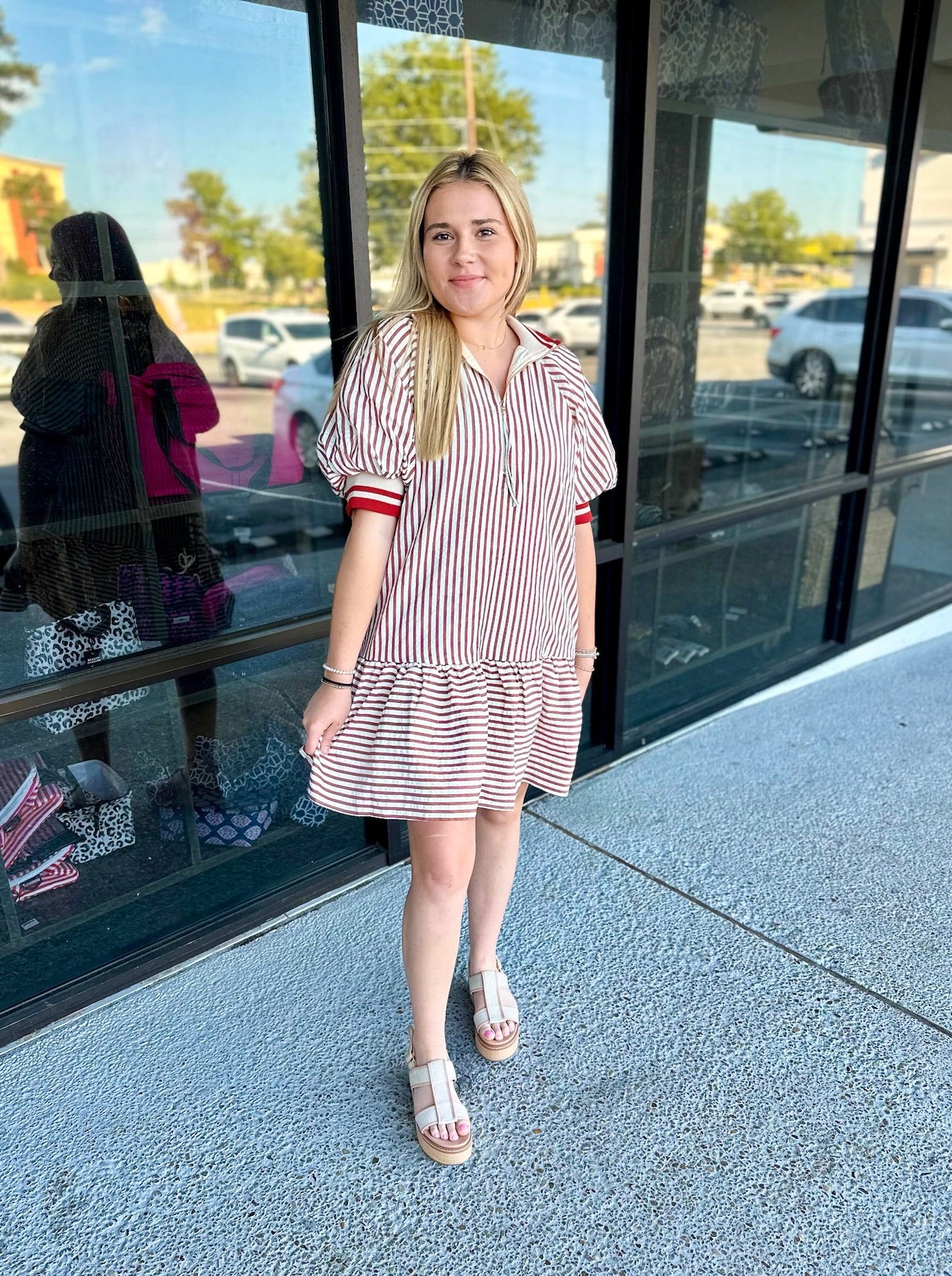 Striped pattern ruffle hem zip front mini dress featuring multicolor accent band trimmed raglan bubble sleeves and neck. Side pockets. Lined. Woven. Non-sheer. Lightweight.
