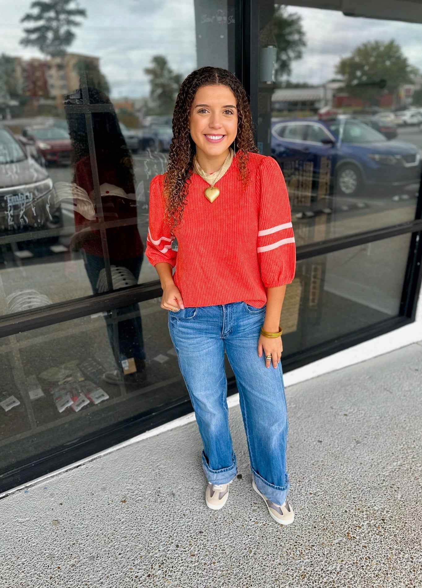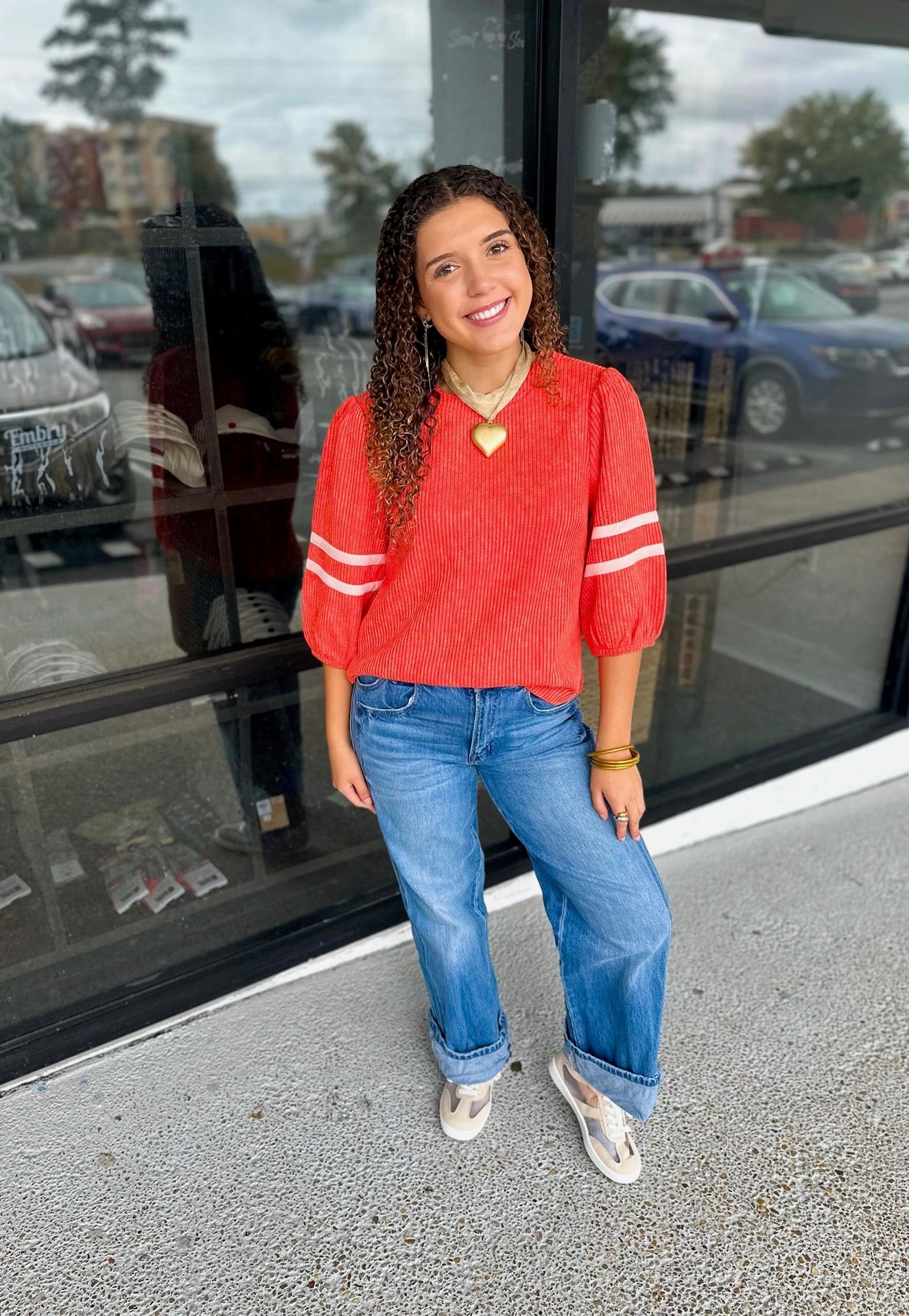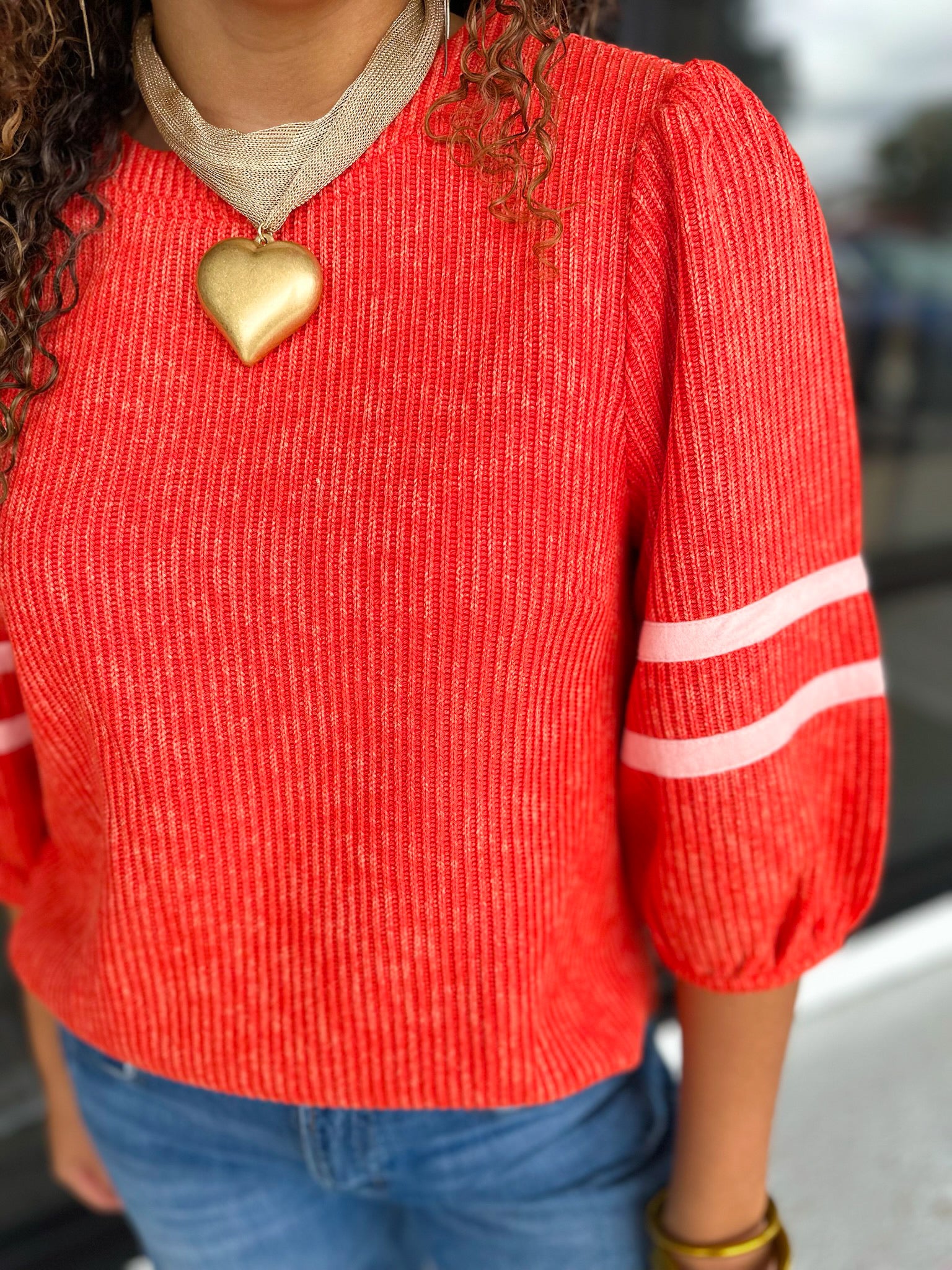 Round neck with band -Back neck button and loop closure - Half length puff sleeves - Double stripe detail on sleeves - Ribbed knit fabric
