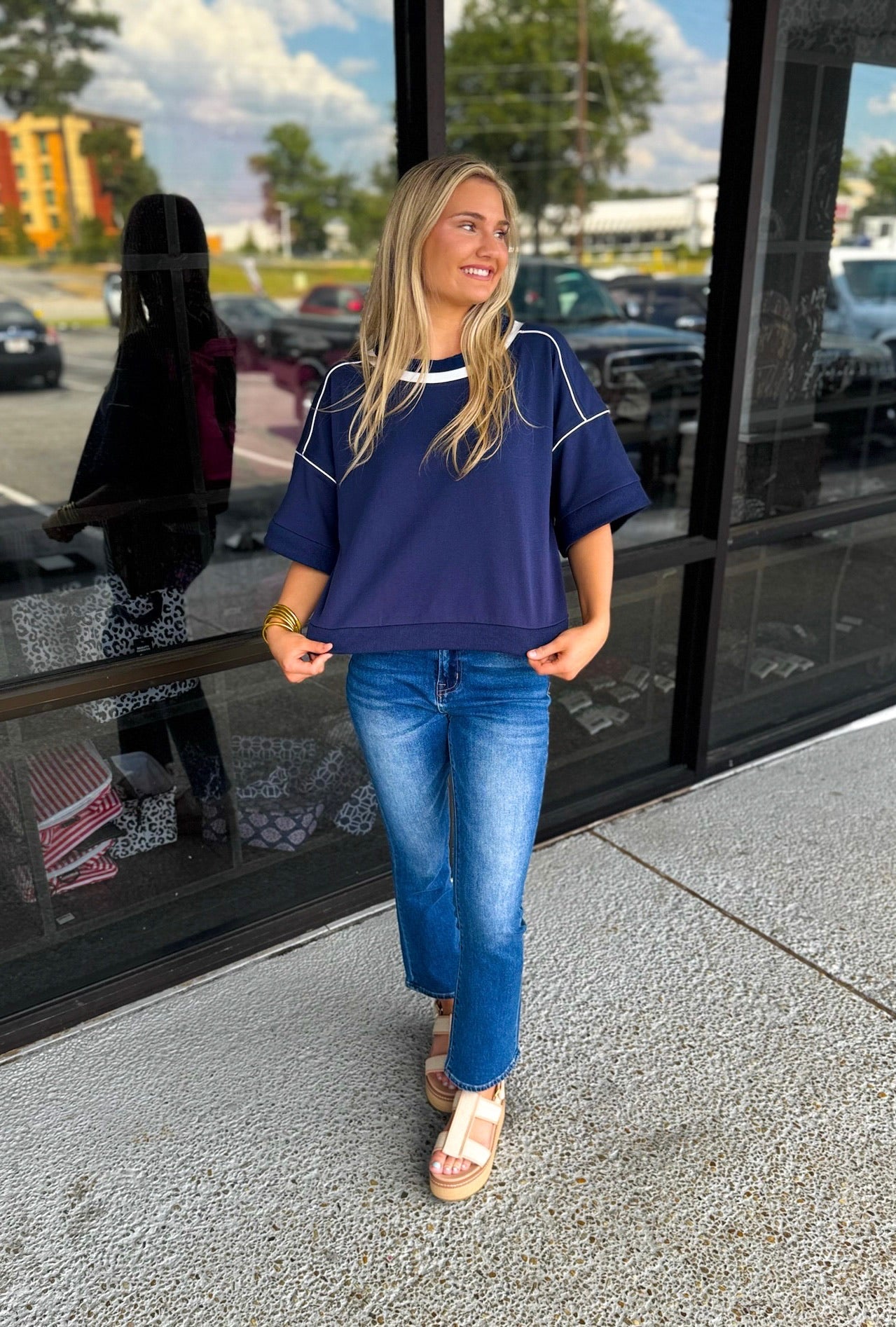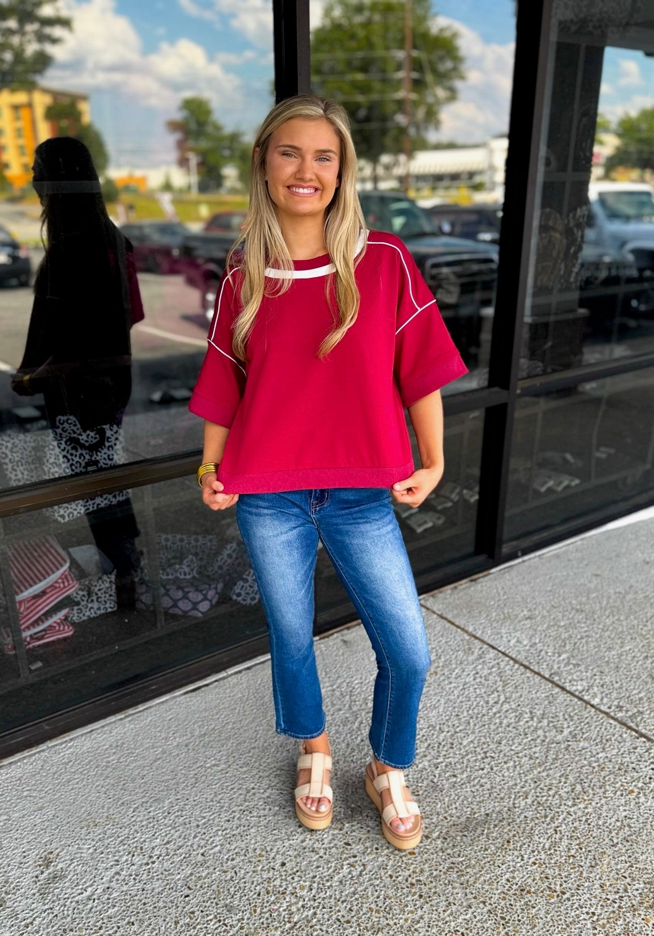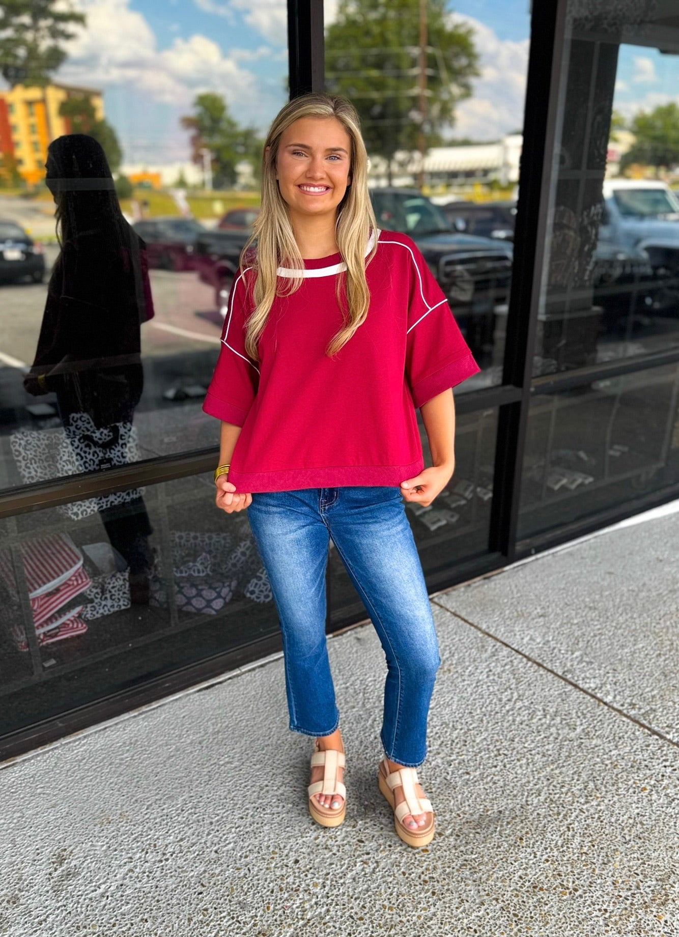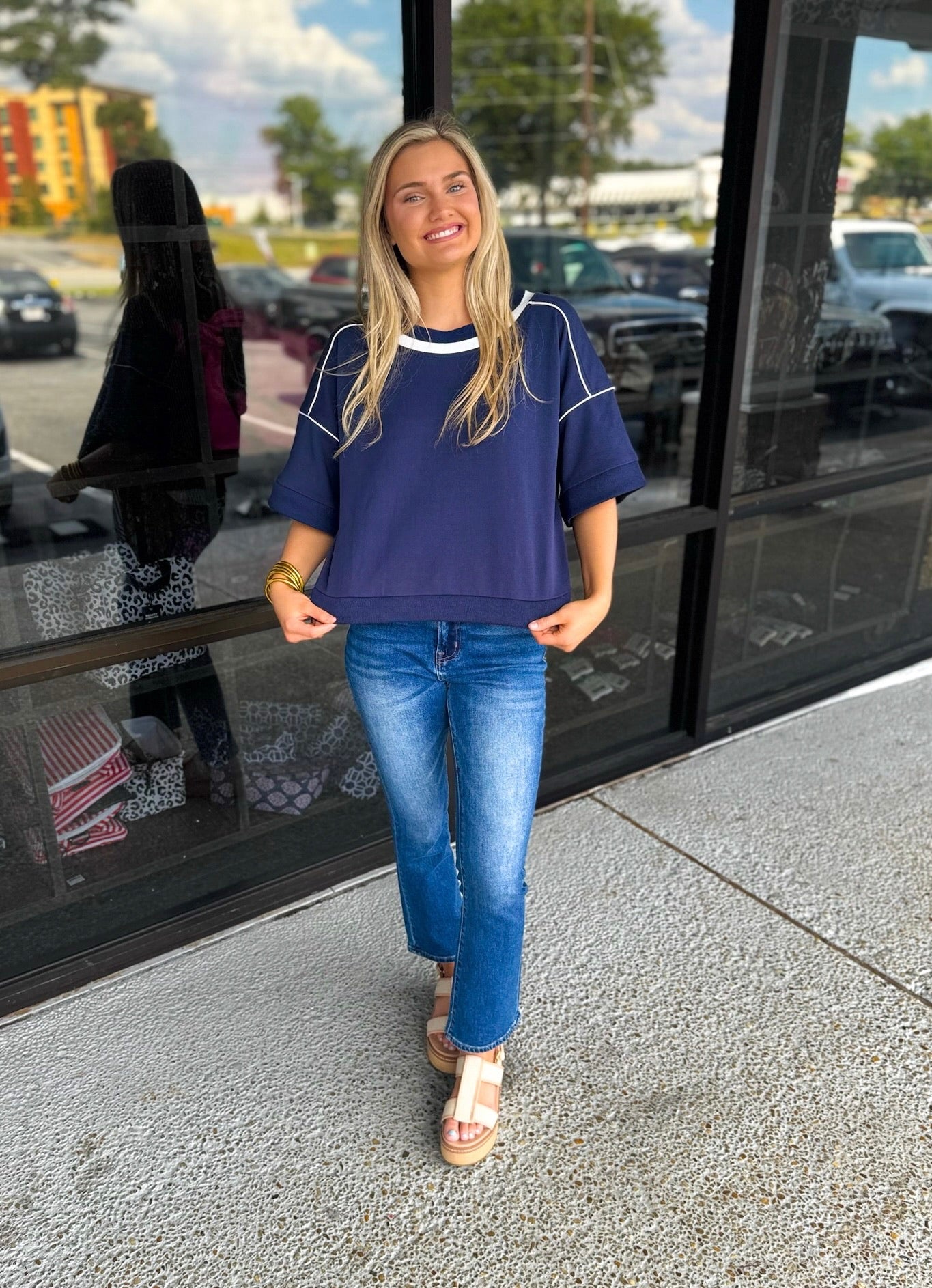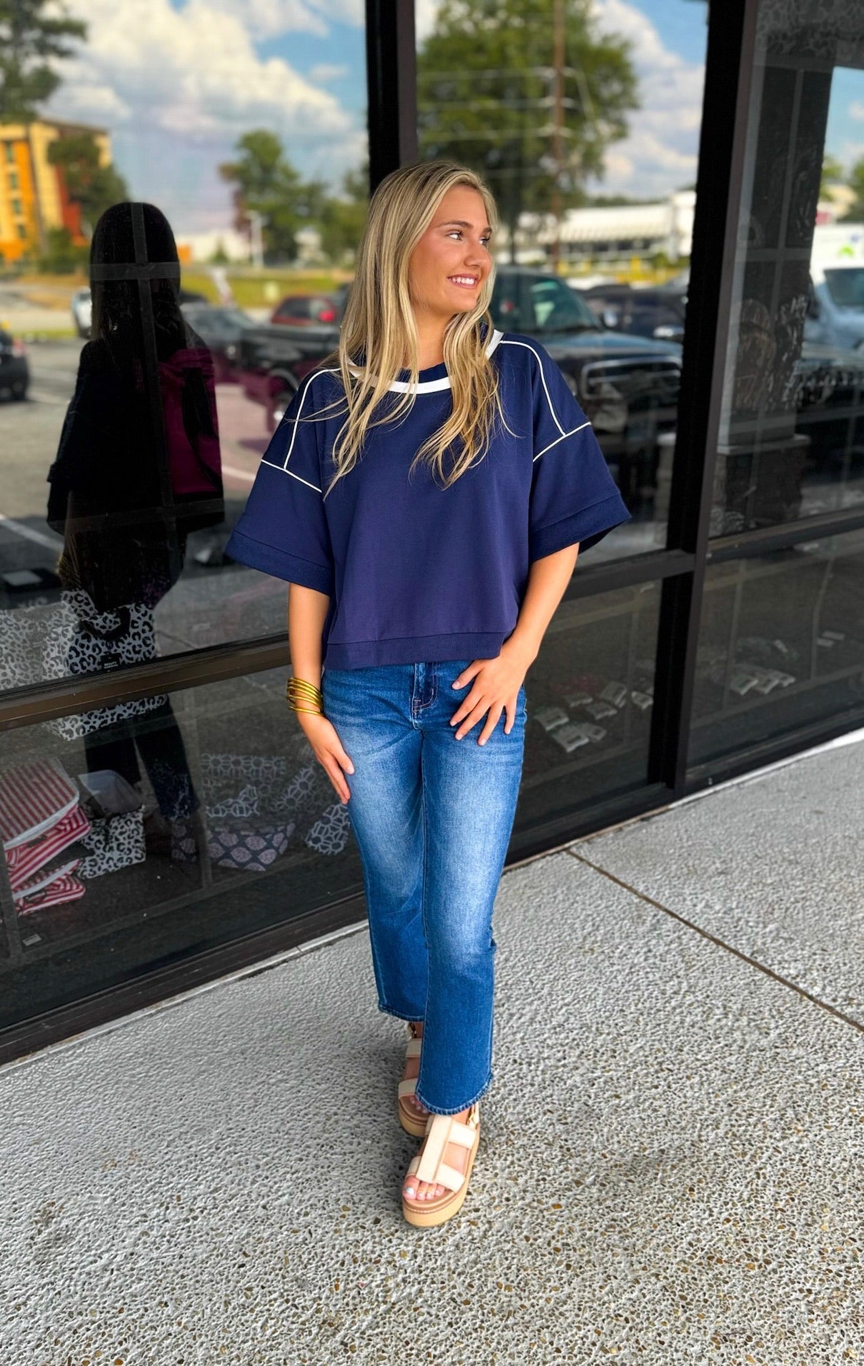 1/2 Sleeve Boxy Fit Sweatshirt with a Contrasting Stripe and Piping Details