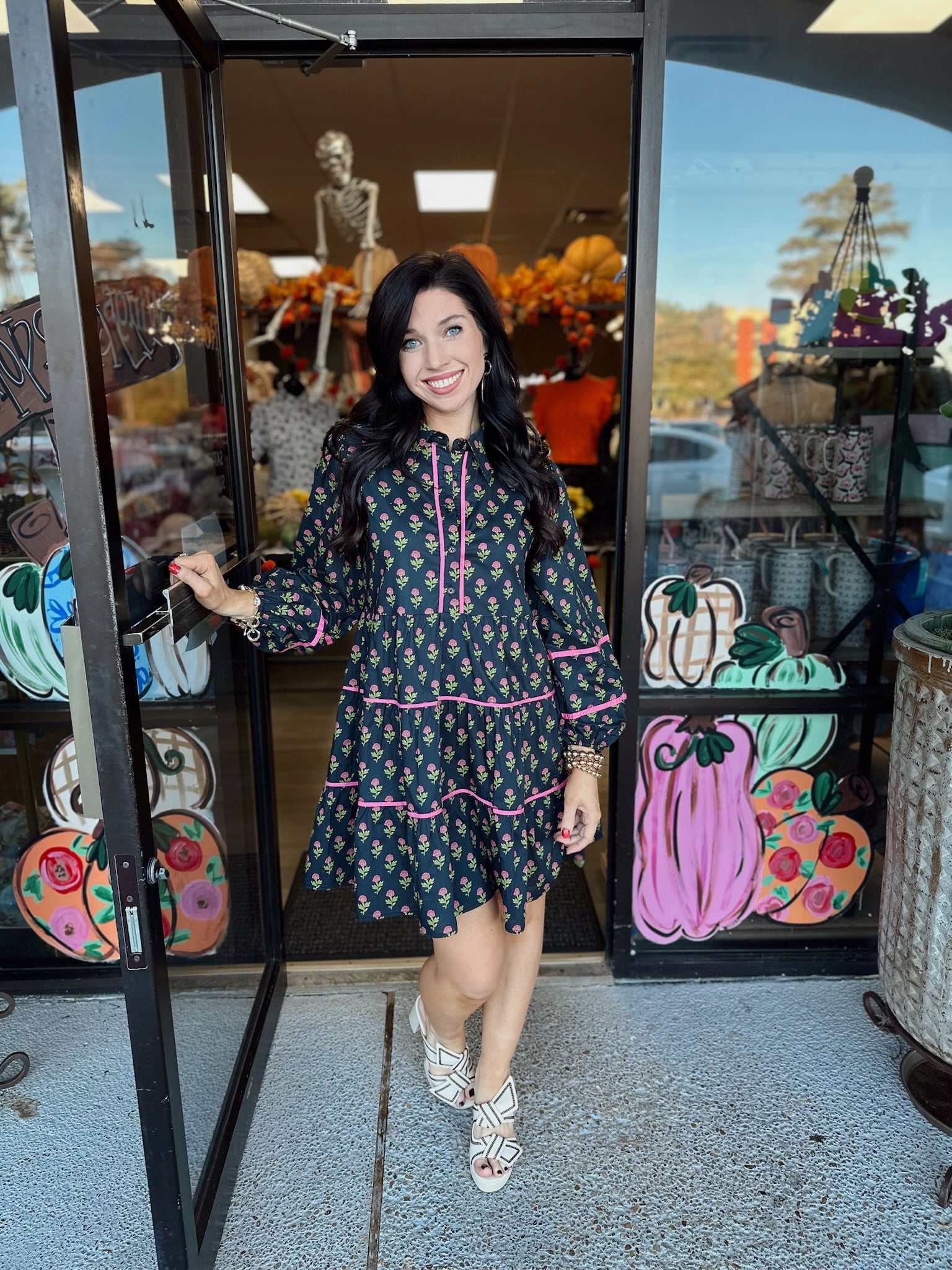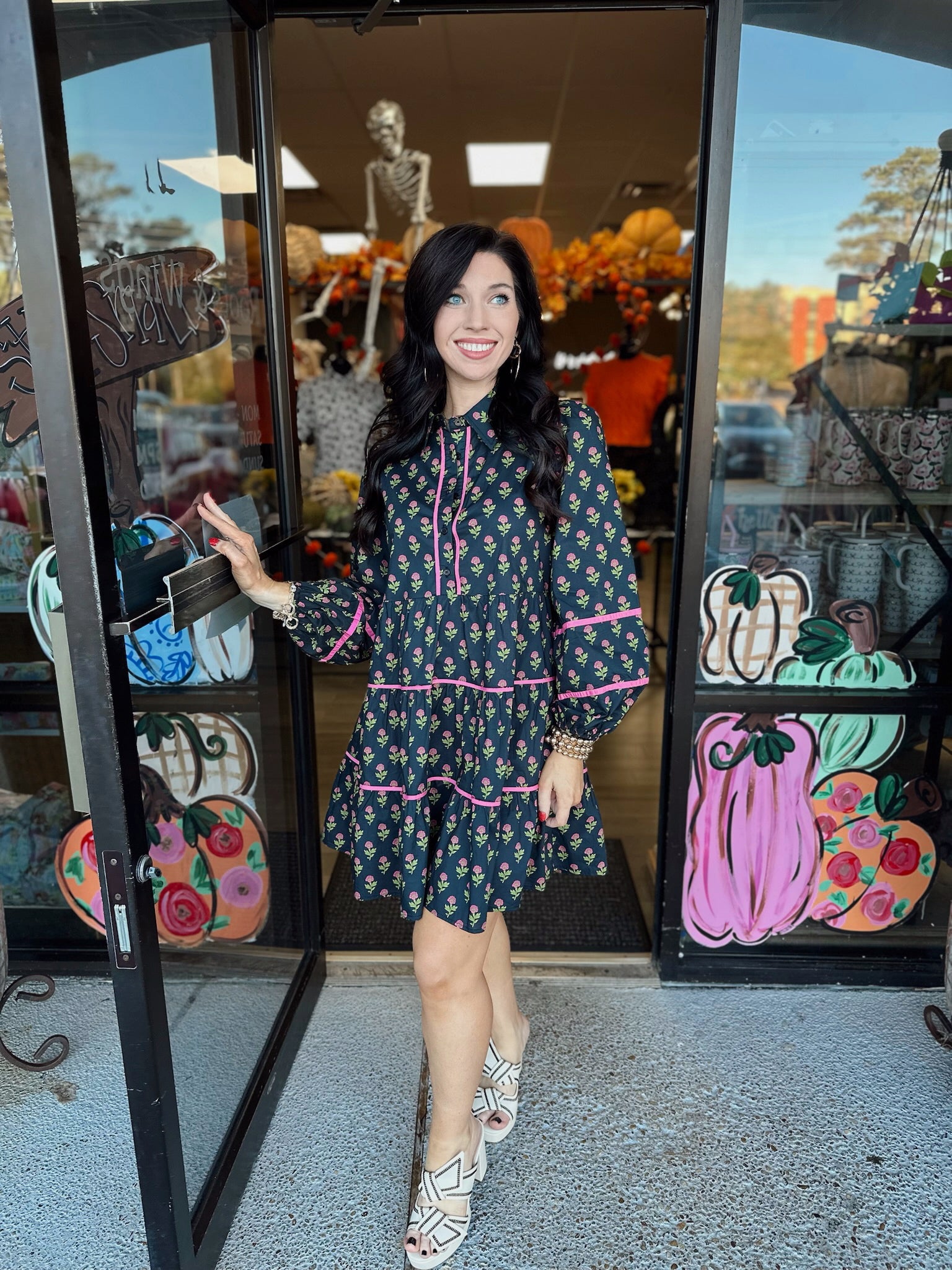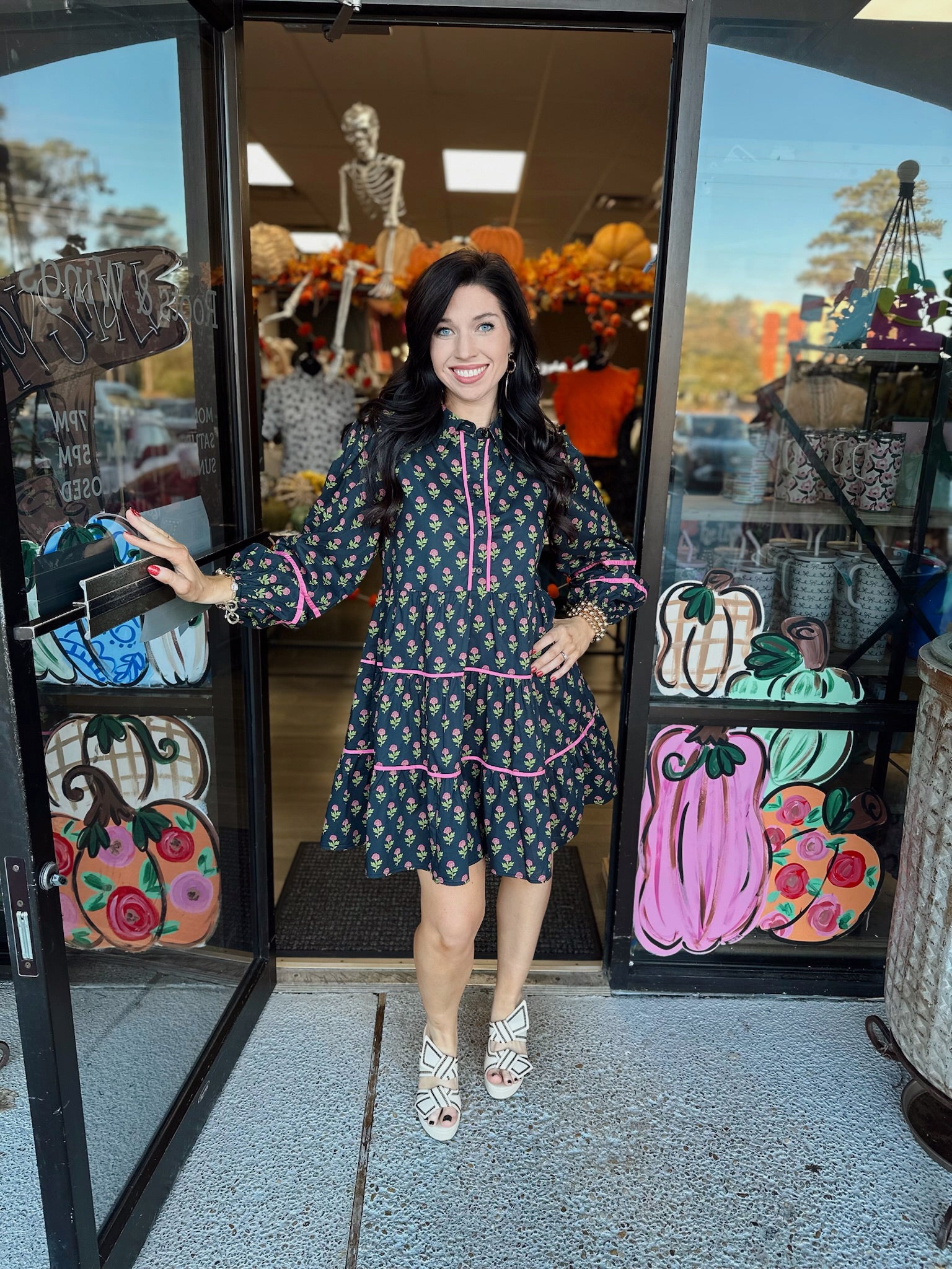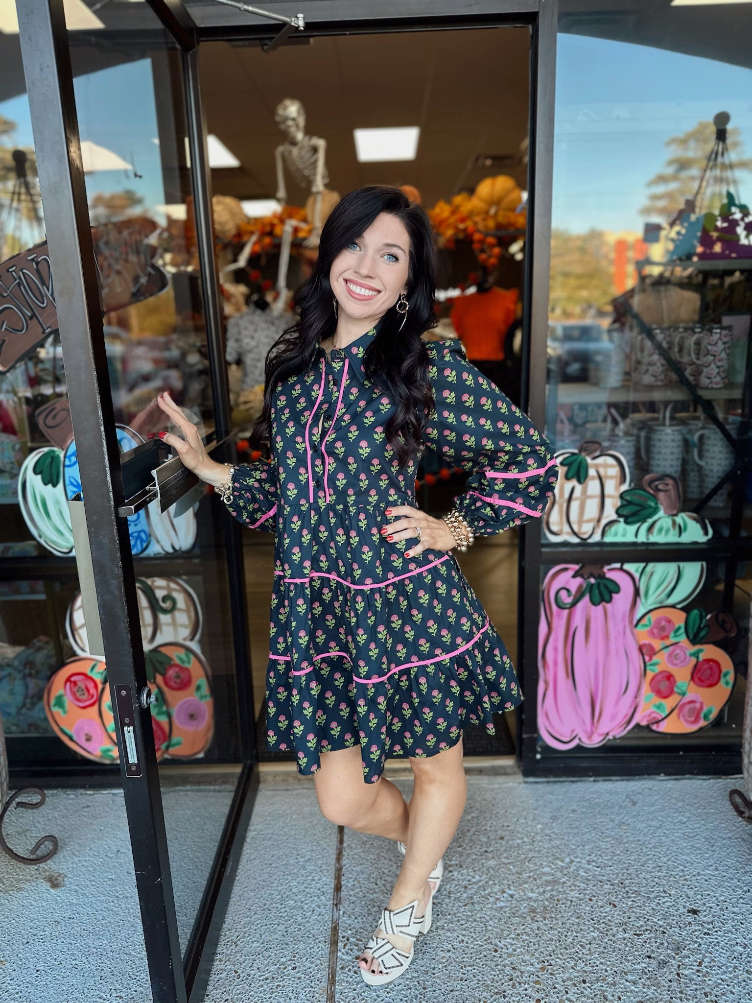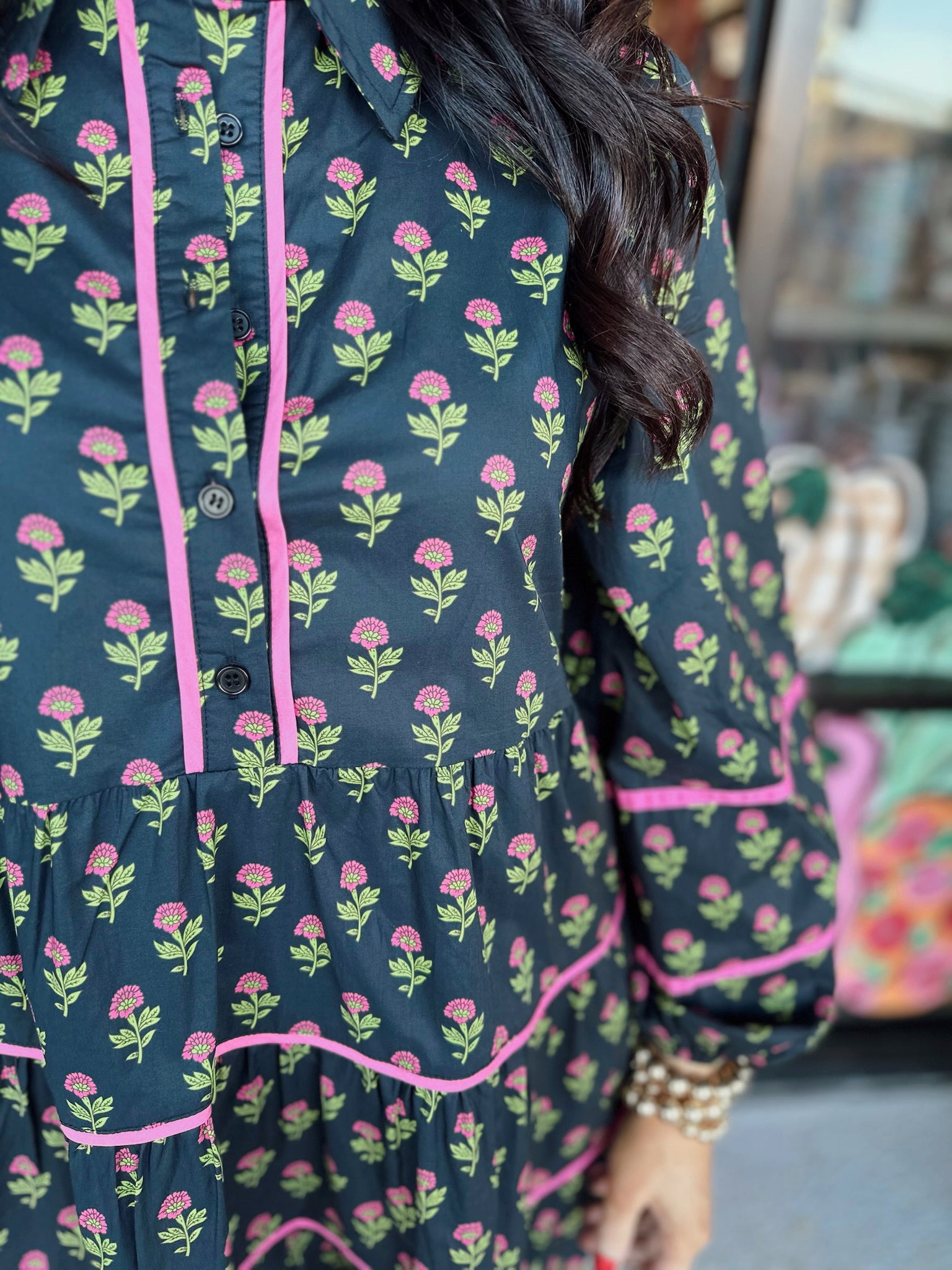Long sleeves button down floral dress with contrast trim accent, tiered dress, collared neckline.