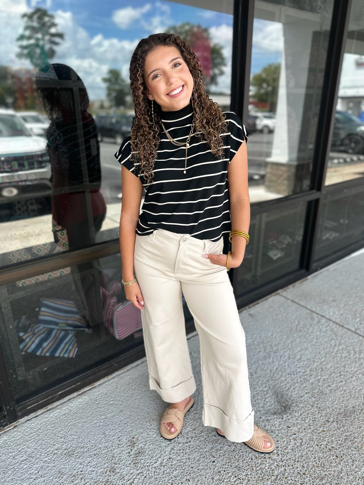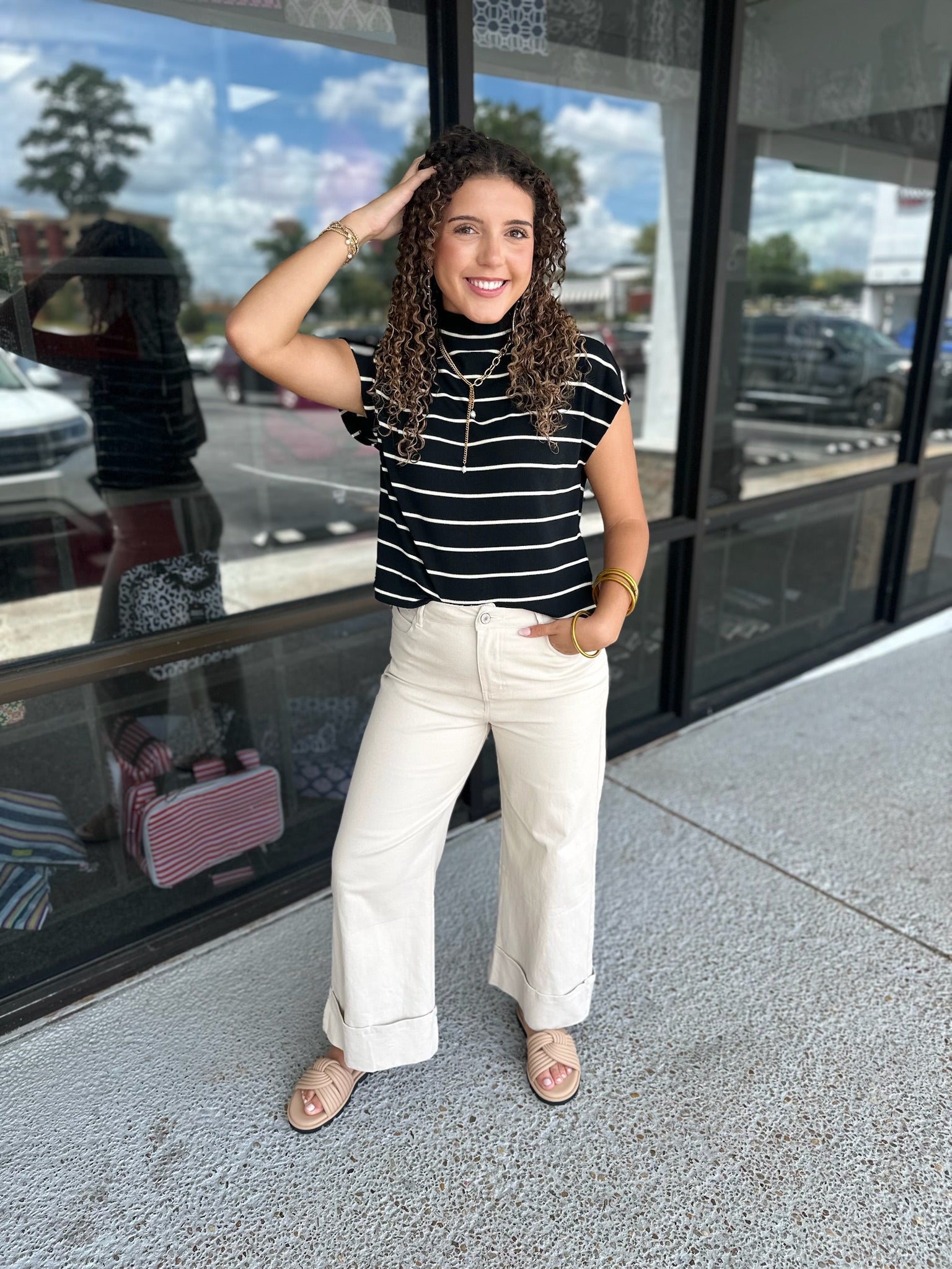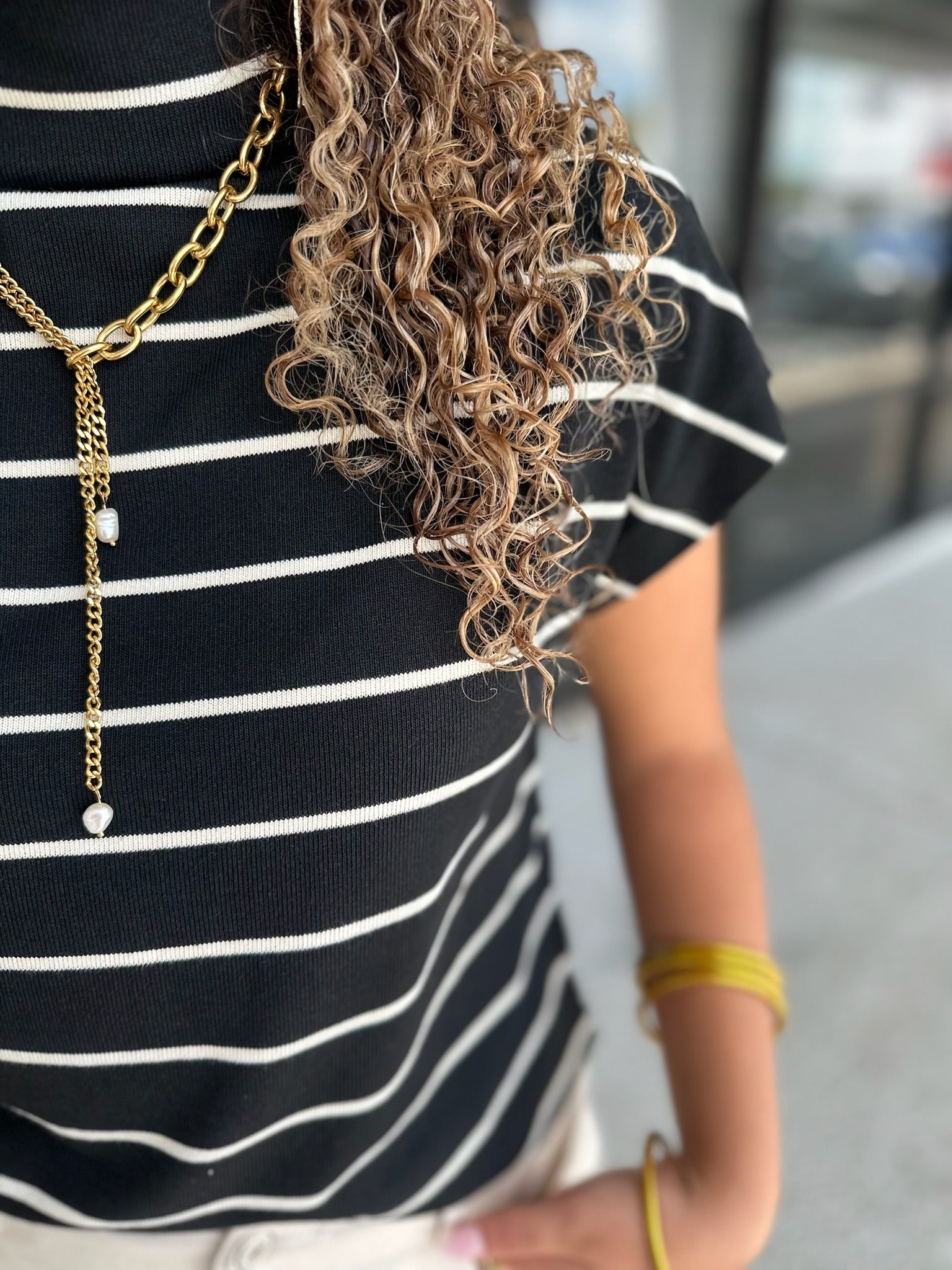 Stripe pattern mock neck jersey knit pullover top. Unlined. Knit. Non-sheer. Lightweight.