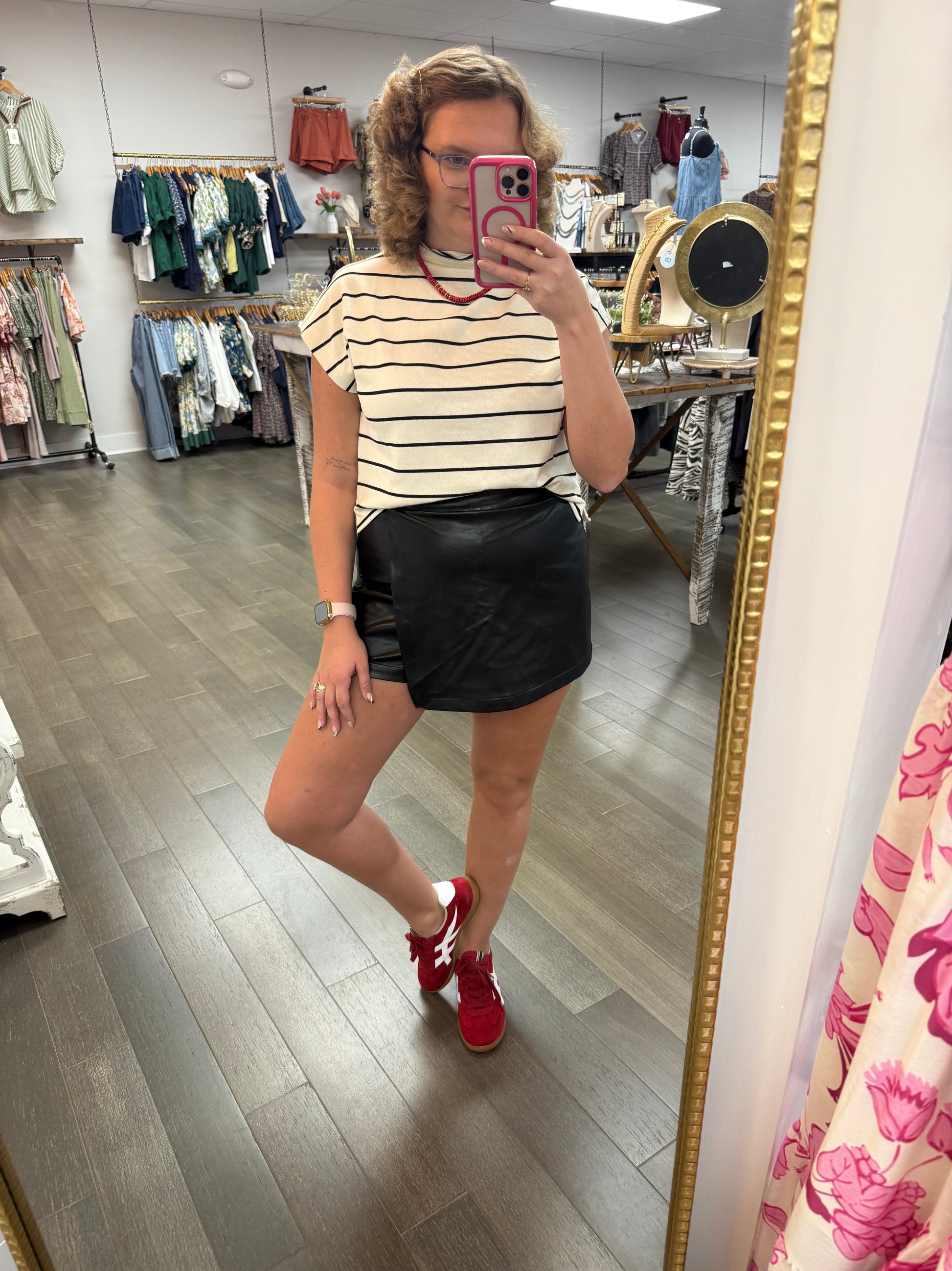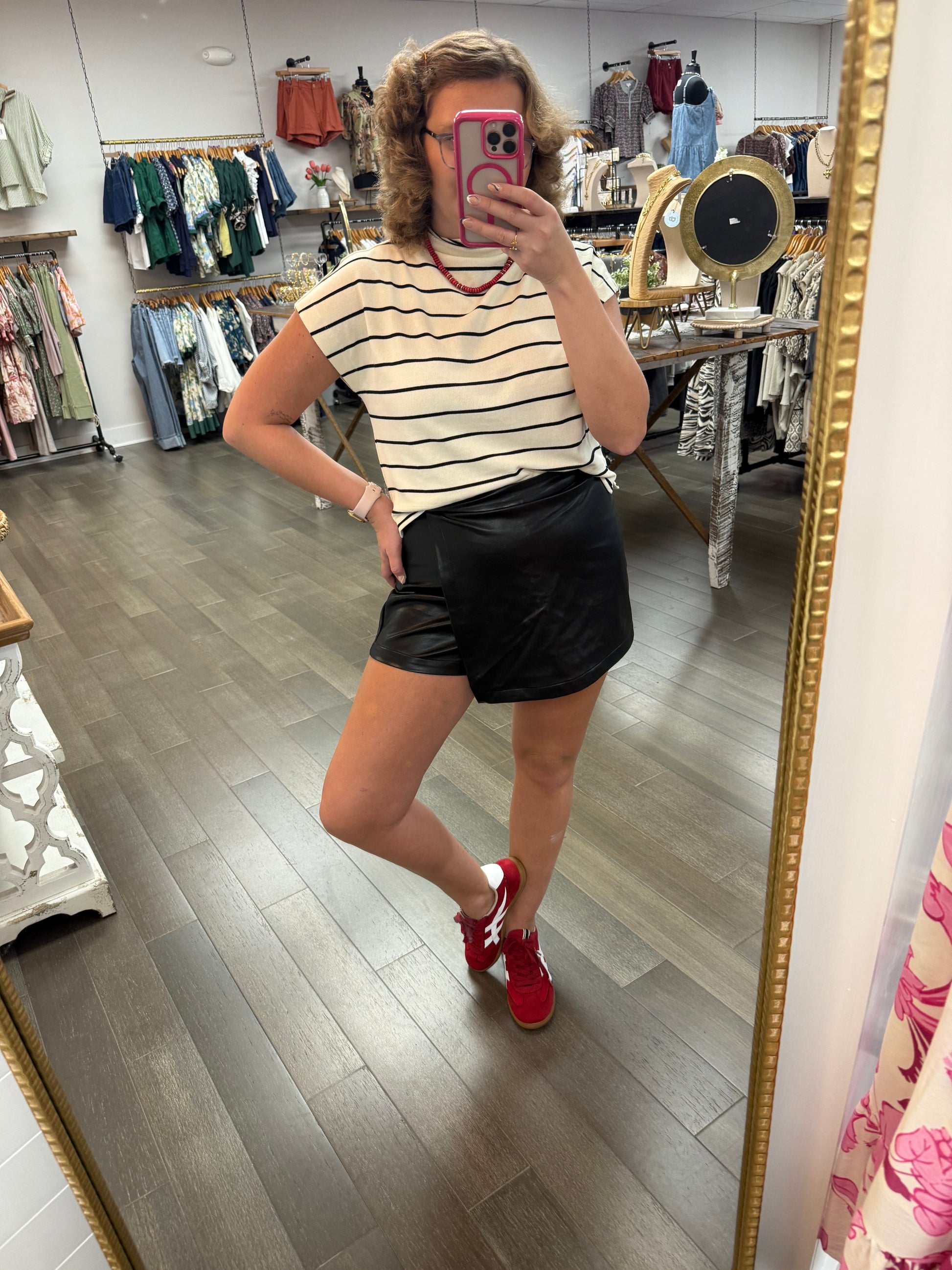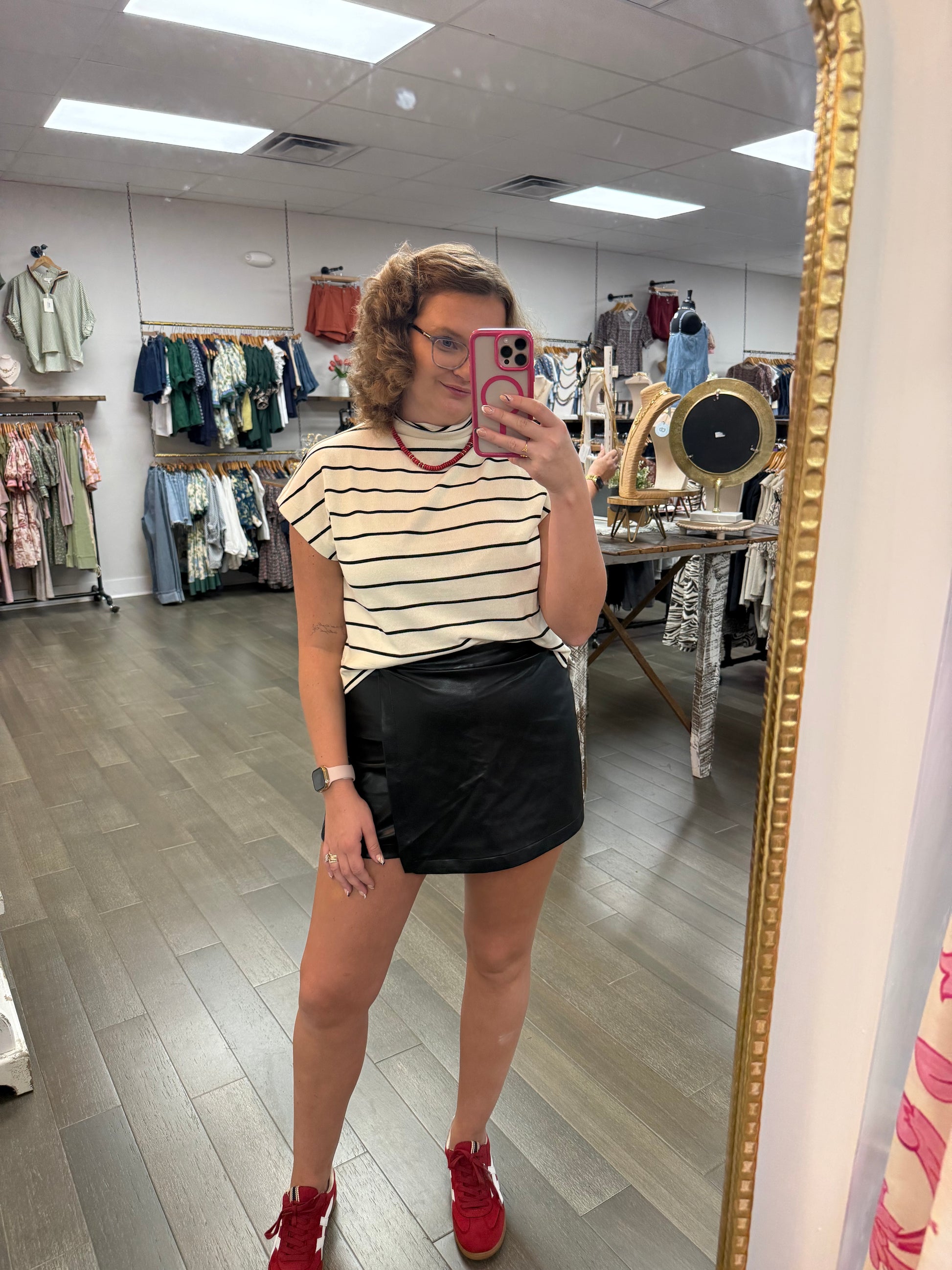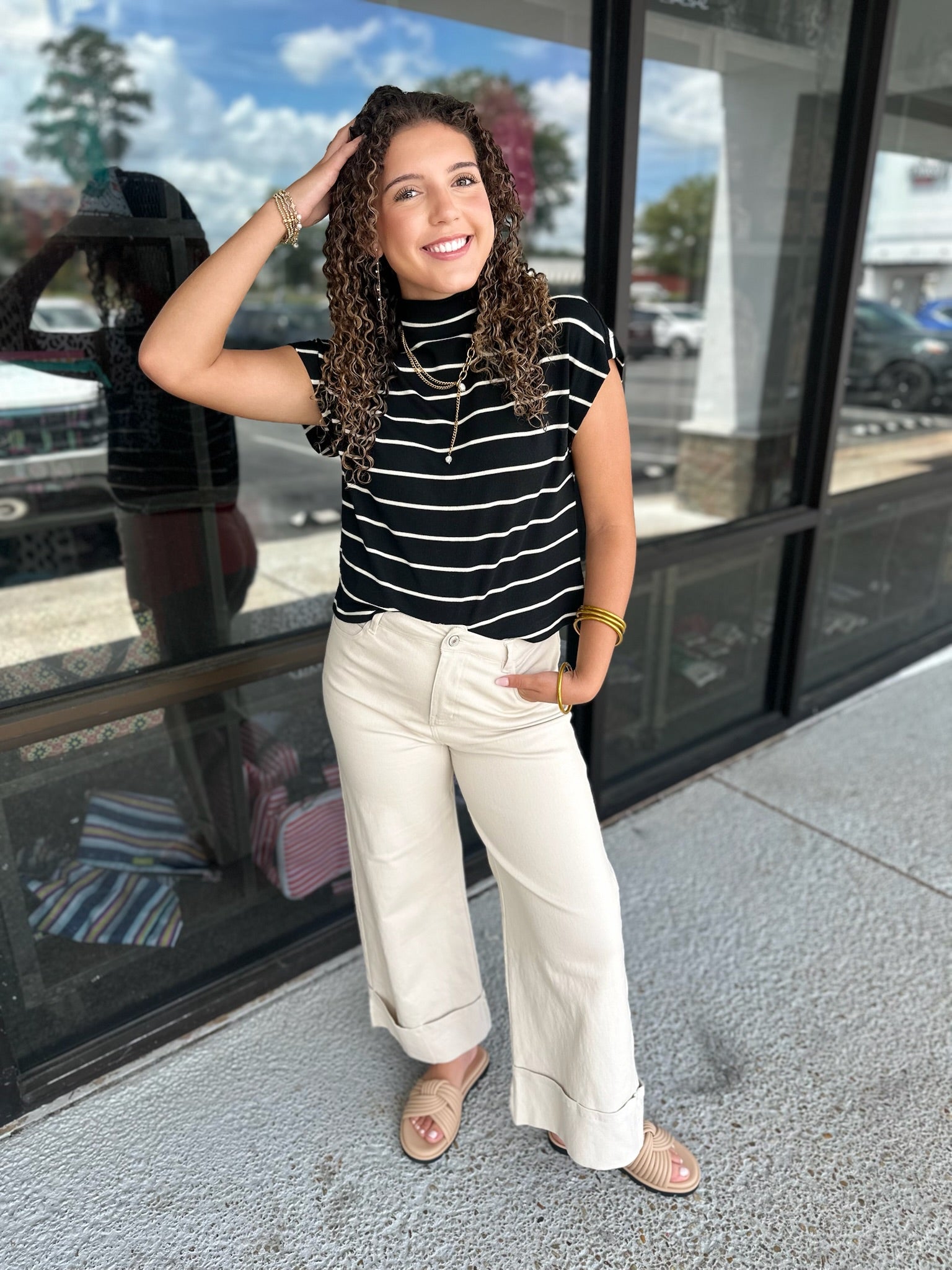 Stripe pattern mock neck jersey knit pullover top. Unlined. Knit. Non-sheer. Lightweight.