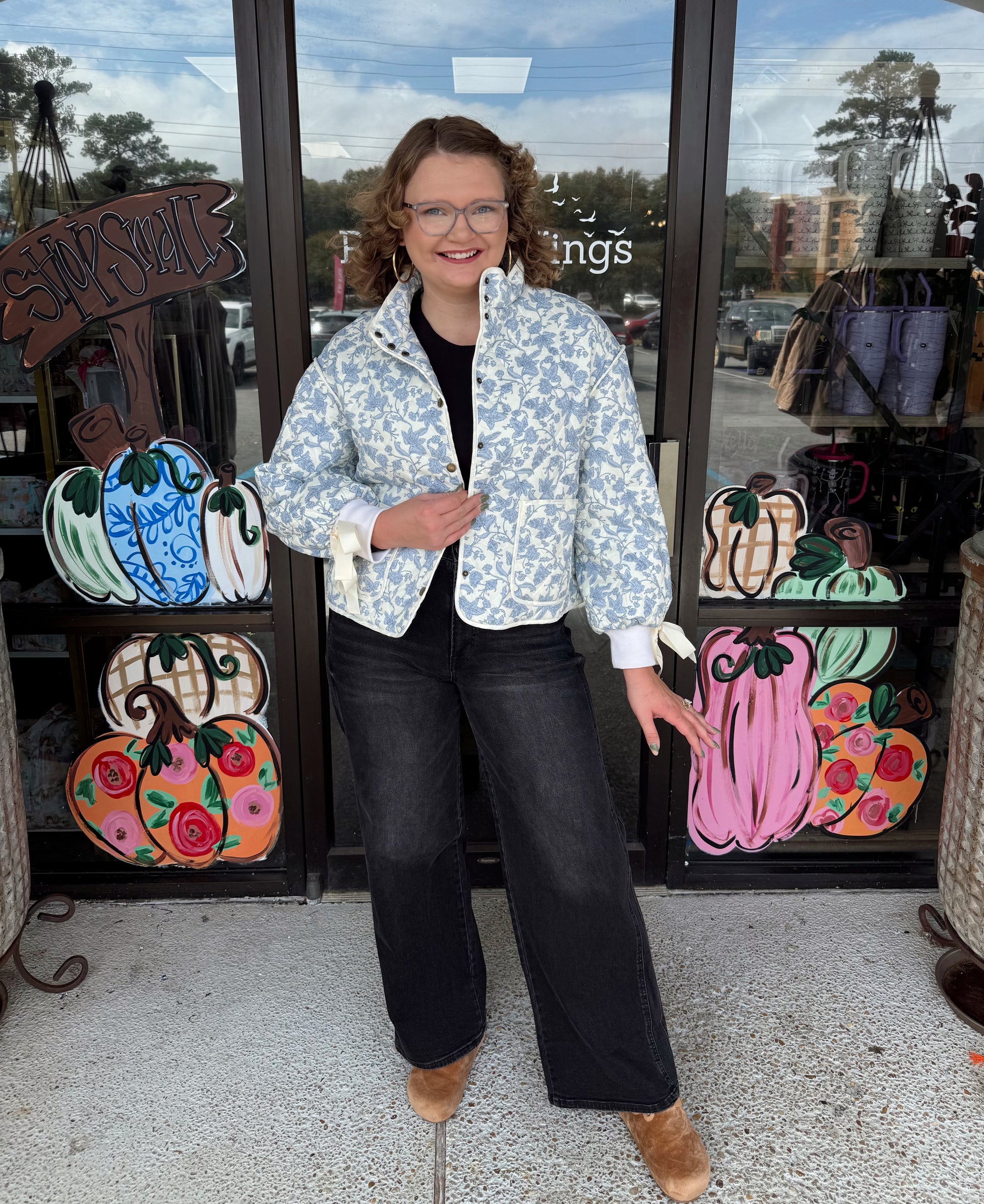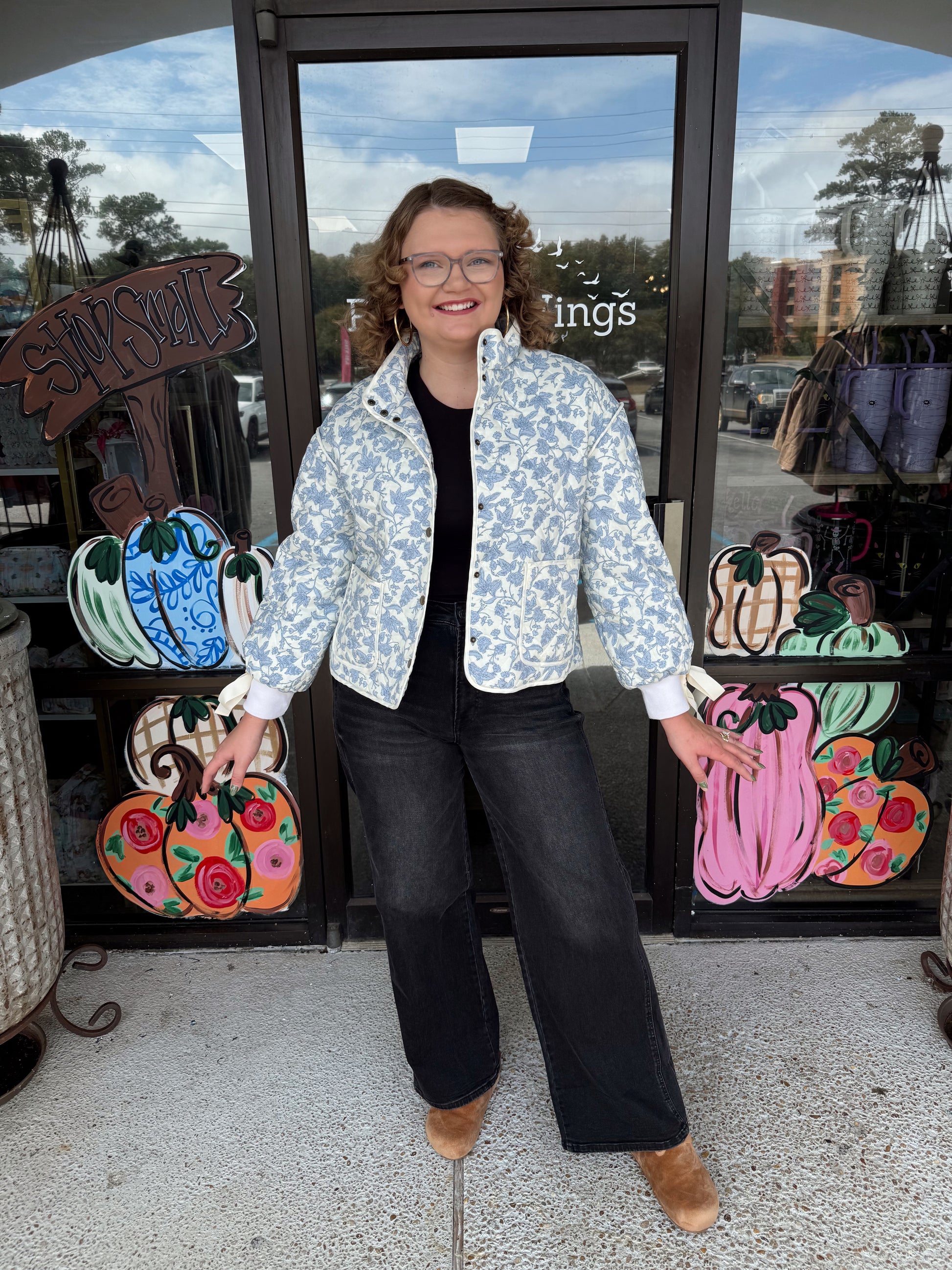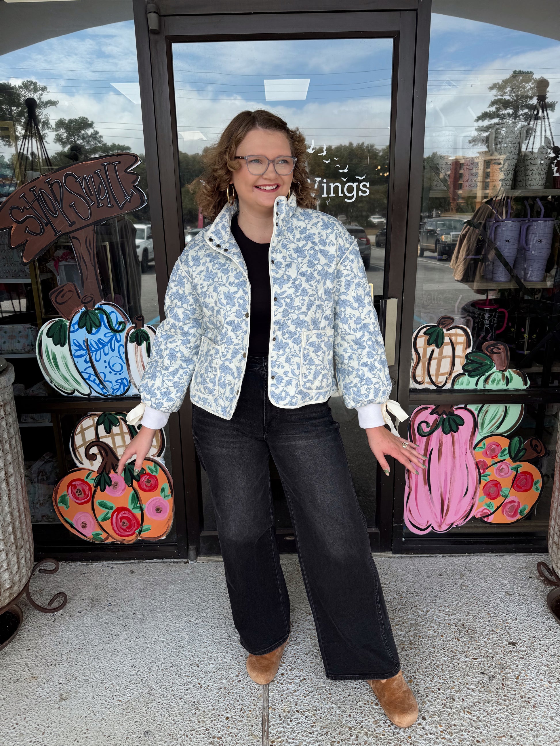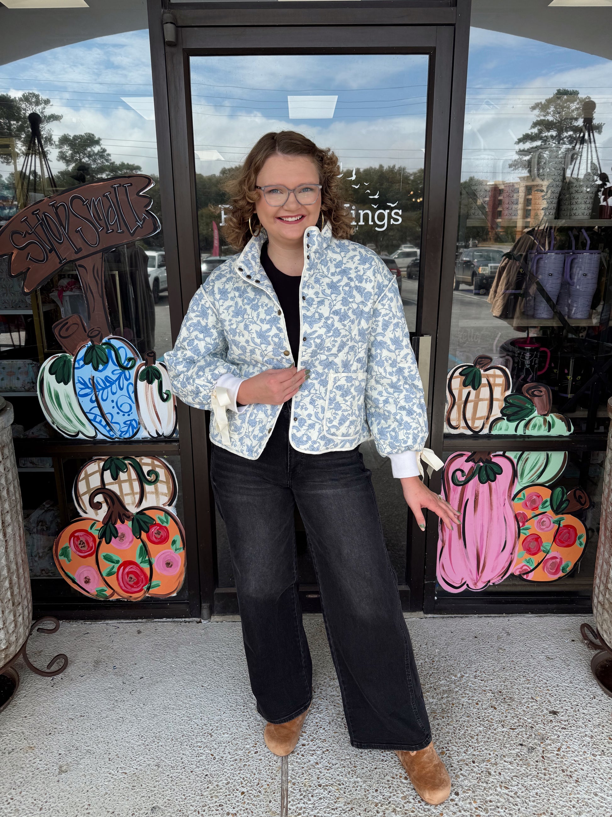 + Floral quilted jacket with ribbon detail + Stand collar + Snap button closure + Contrast binding trim + Drop shoulder long balloon sleeves