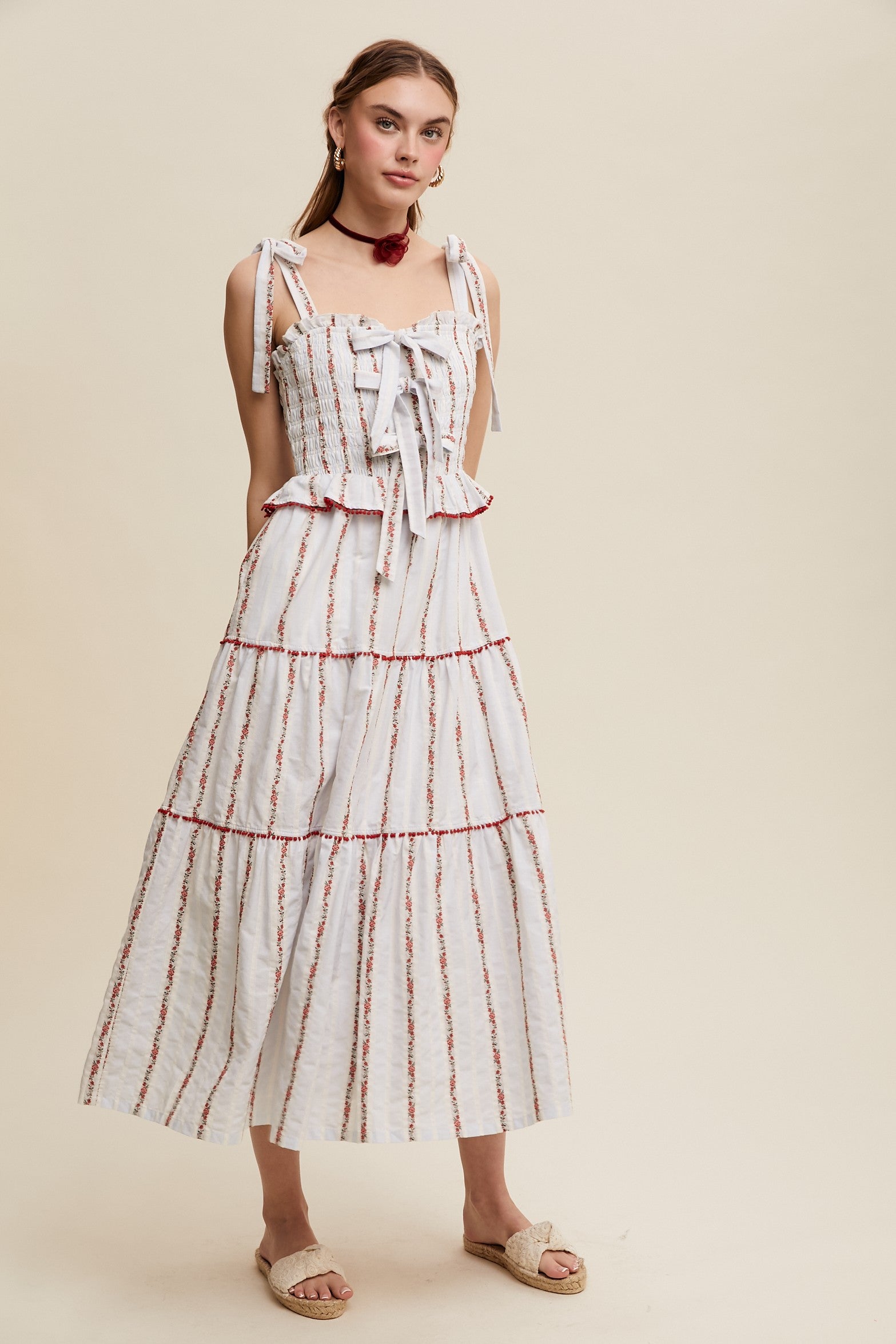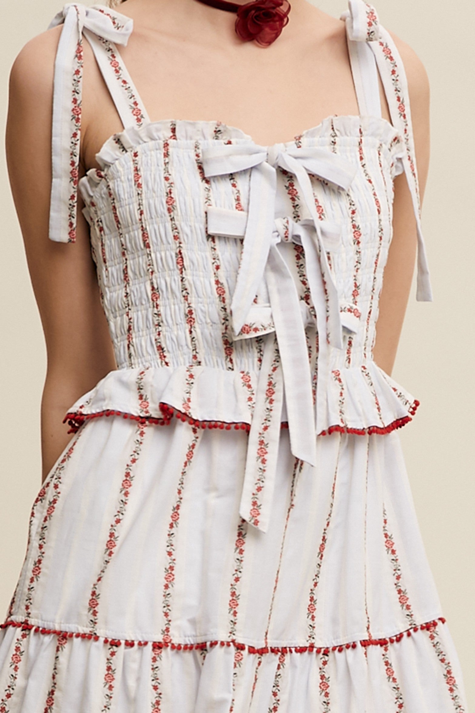 Charming Floral Embroidery: Adorned with intricate floral embroidery in vertical stripes, adding a touch of sophistication and elegance. - Bow Tie Shoulder Straps: Adjustable self-tie straps provide a customizable fit and a playful detail. - Smocked Bodice: Elasticated smocking ensures a snug and flattering fit, while enhancing the textured design. - Tiered Design: Cascading tiers with delicate pom-pom trim create a flowing silhouette full of movement and charm. - Functional Pockets: Side pockets add a practical and stylish element to the dress. - Lightweight with Lining: Fully lined for added comfort and coverage.