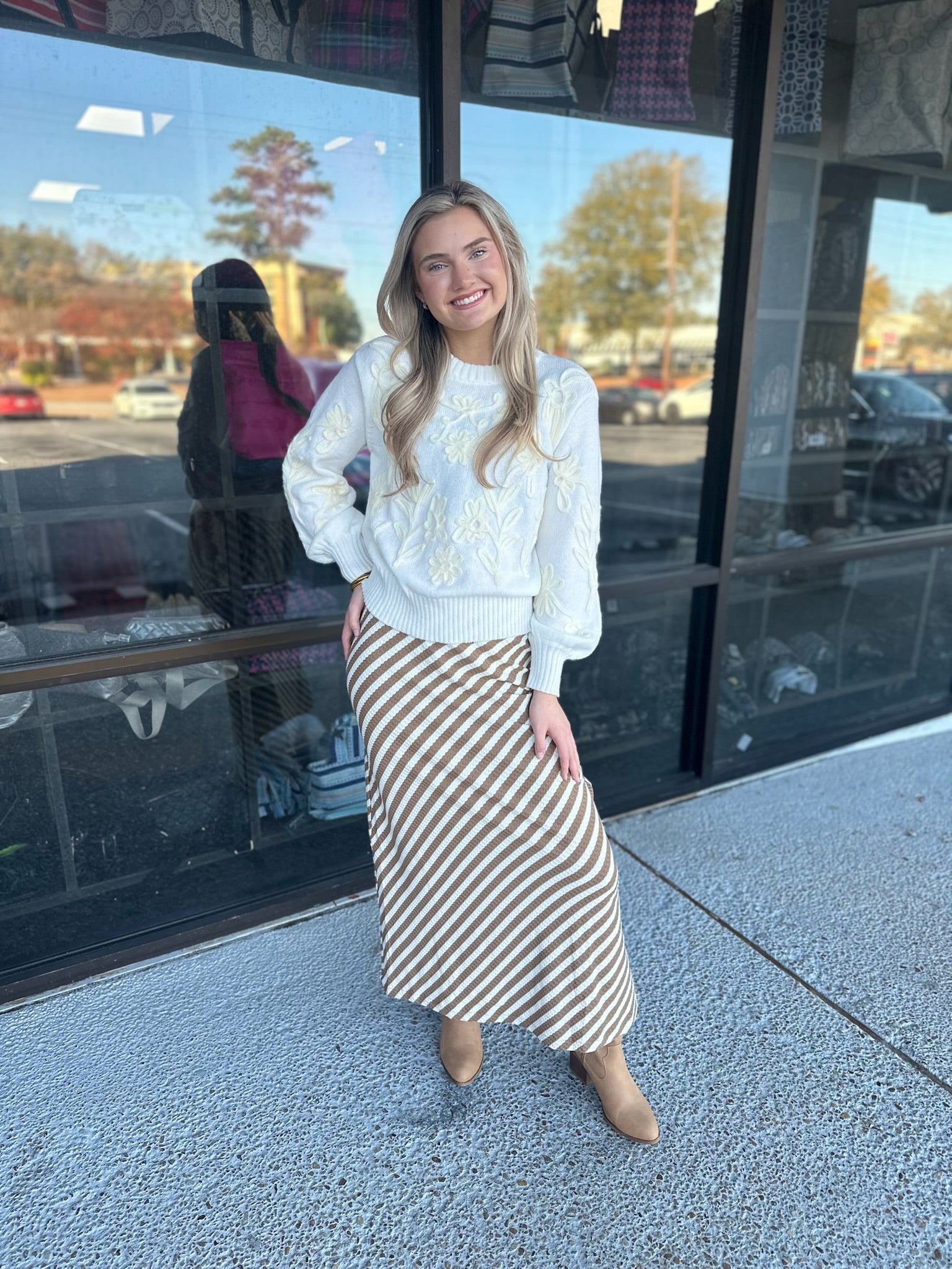 Flower embroidered puff sleeves knit sweater
