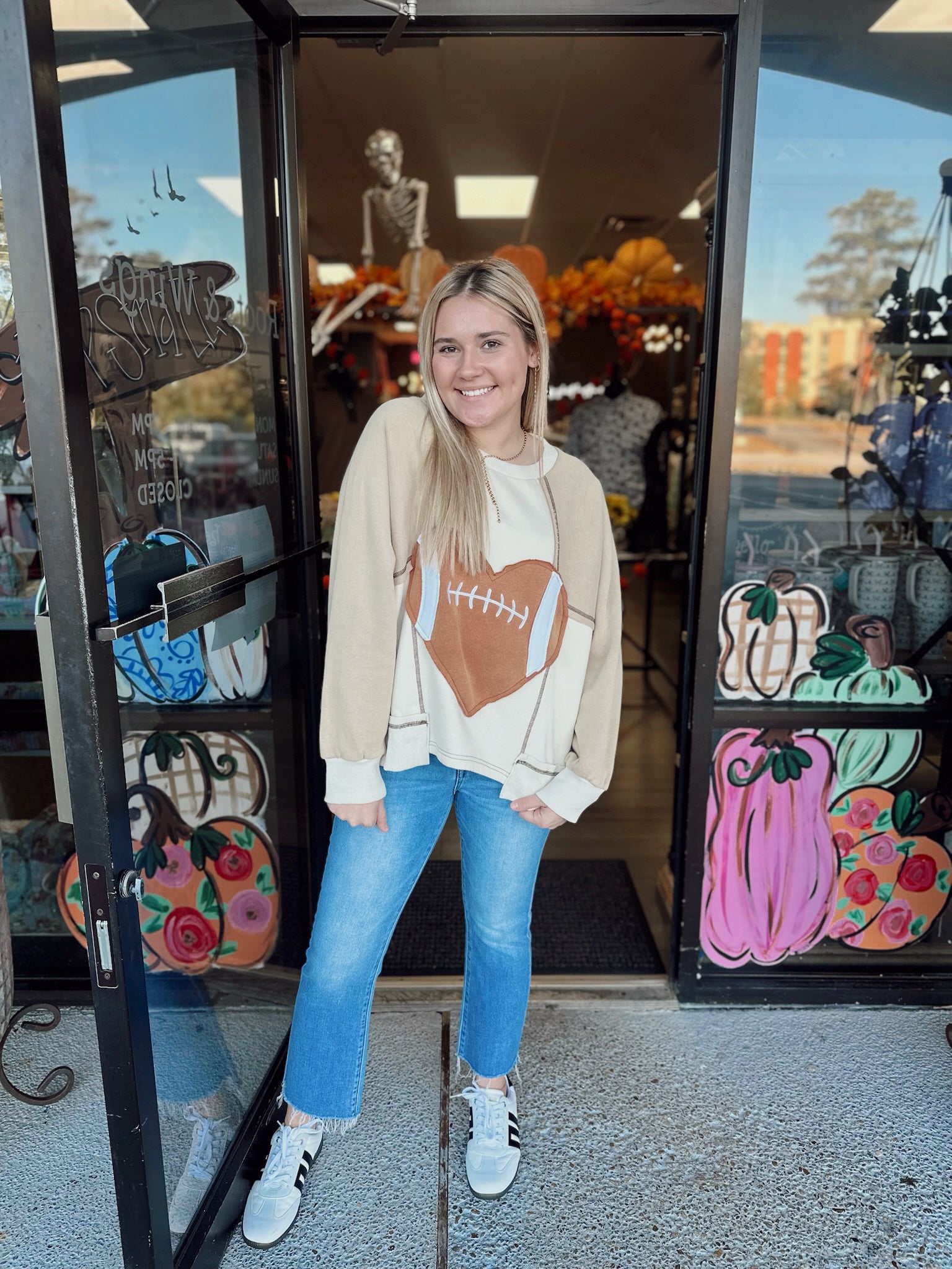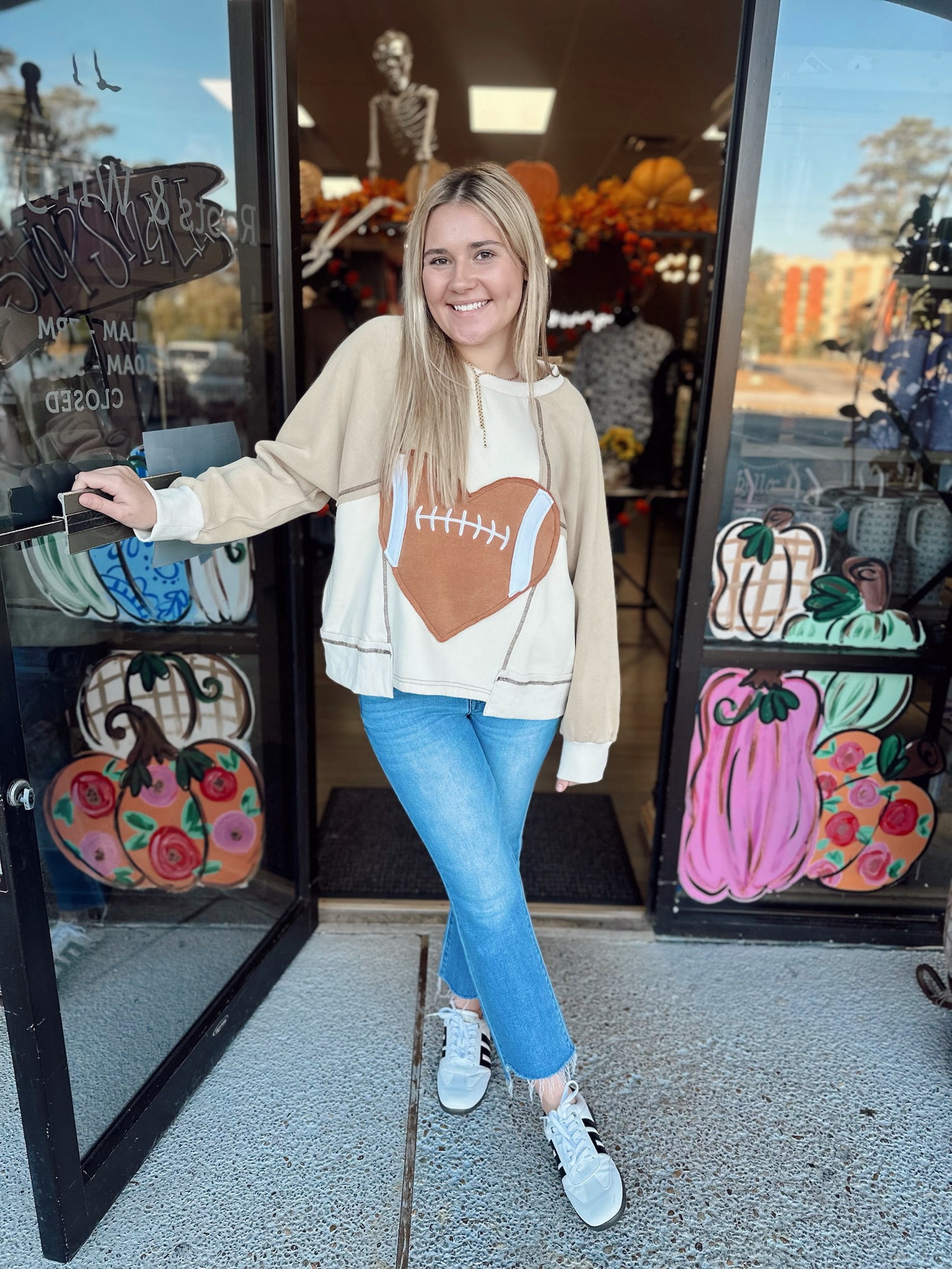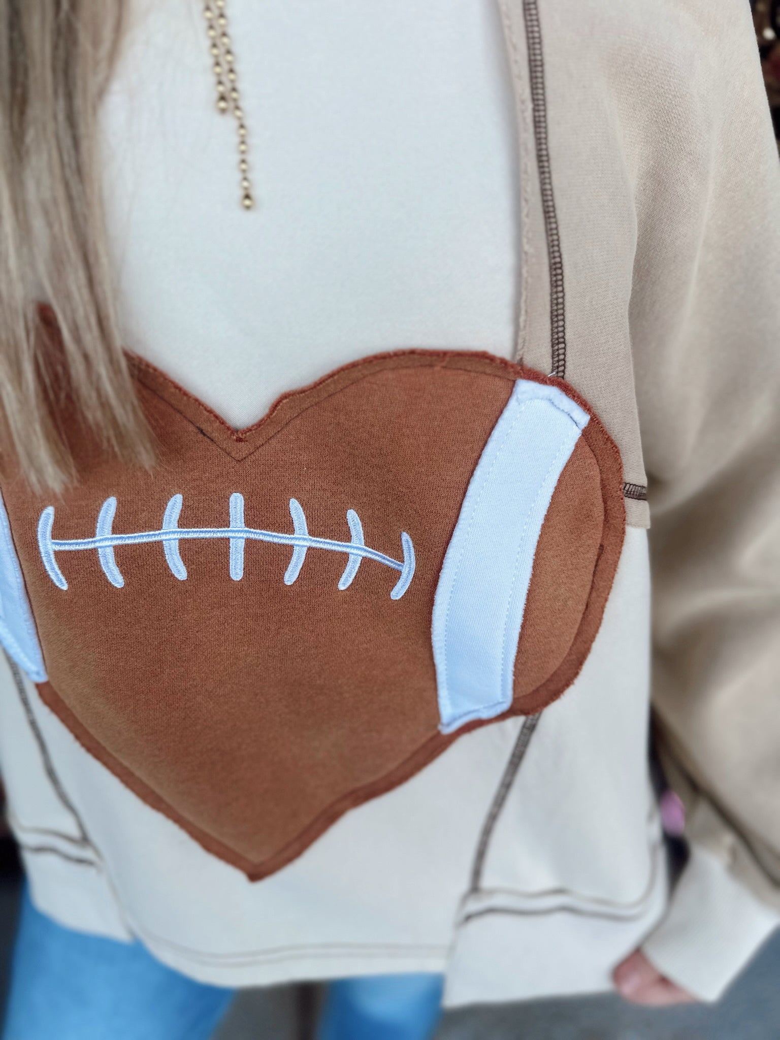 GAMEDAY HEART FOOTBALL PATCHWORK FLEECE SWEATSHIRT WITH SIDE POCKETS