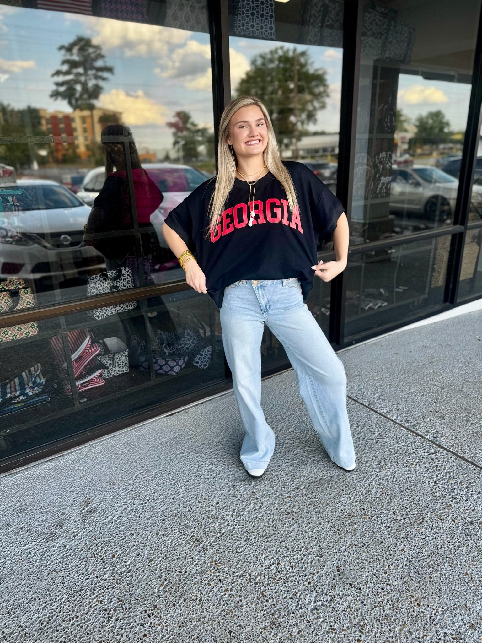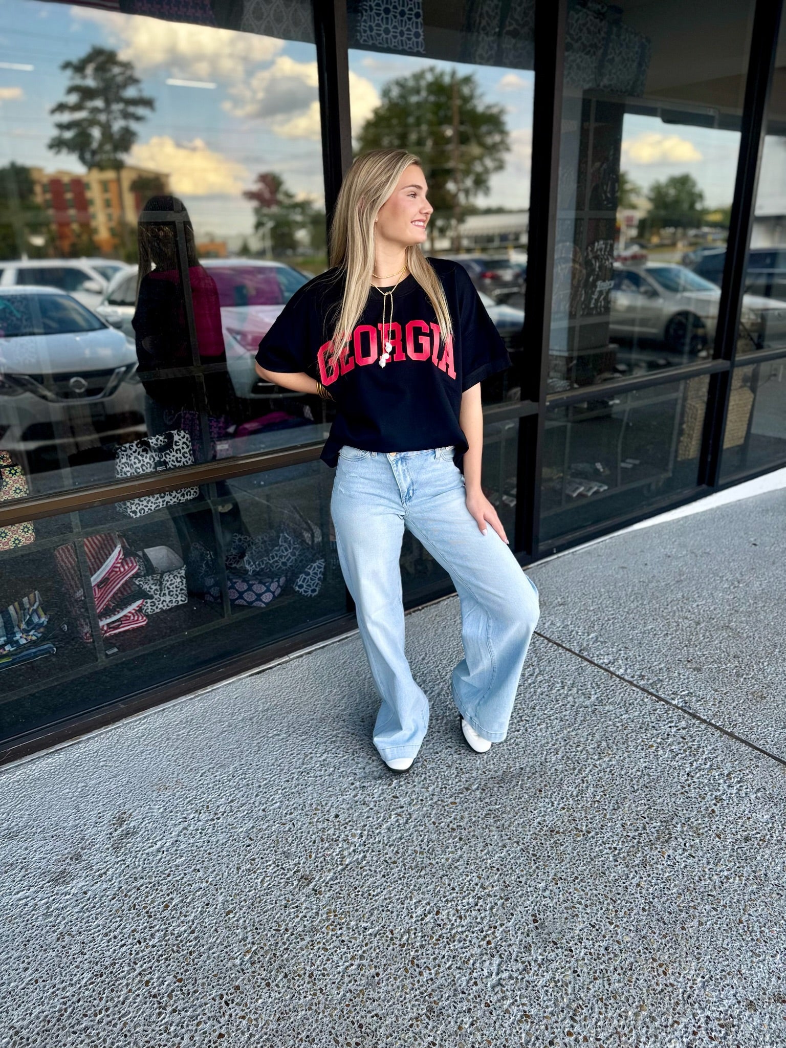 Boxy short-sleeve sweatshirt with bold 'GEORGIA' varsity print and ribbed trims