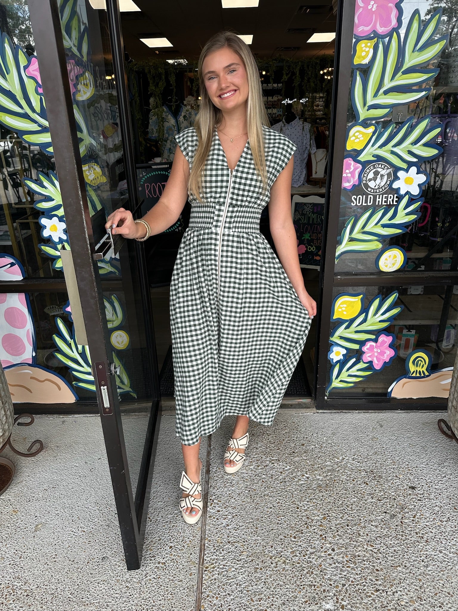 Gingham pattern V-neck sleeveless midi dress featuring zipper closure at front. Smocking at waist. Pocket at sides. Lined. Woven. Non-sheer. Lightweight.