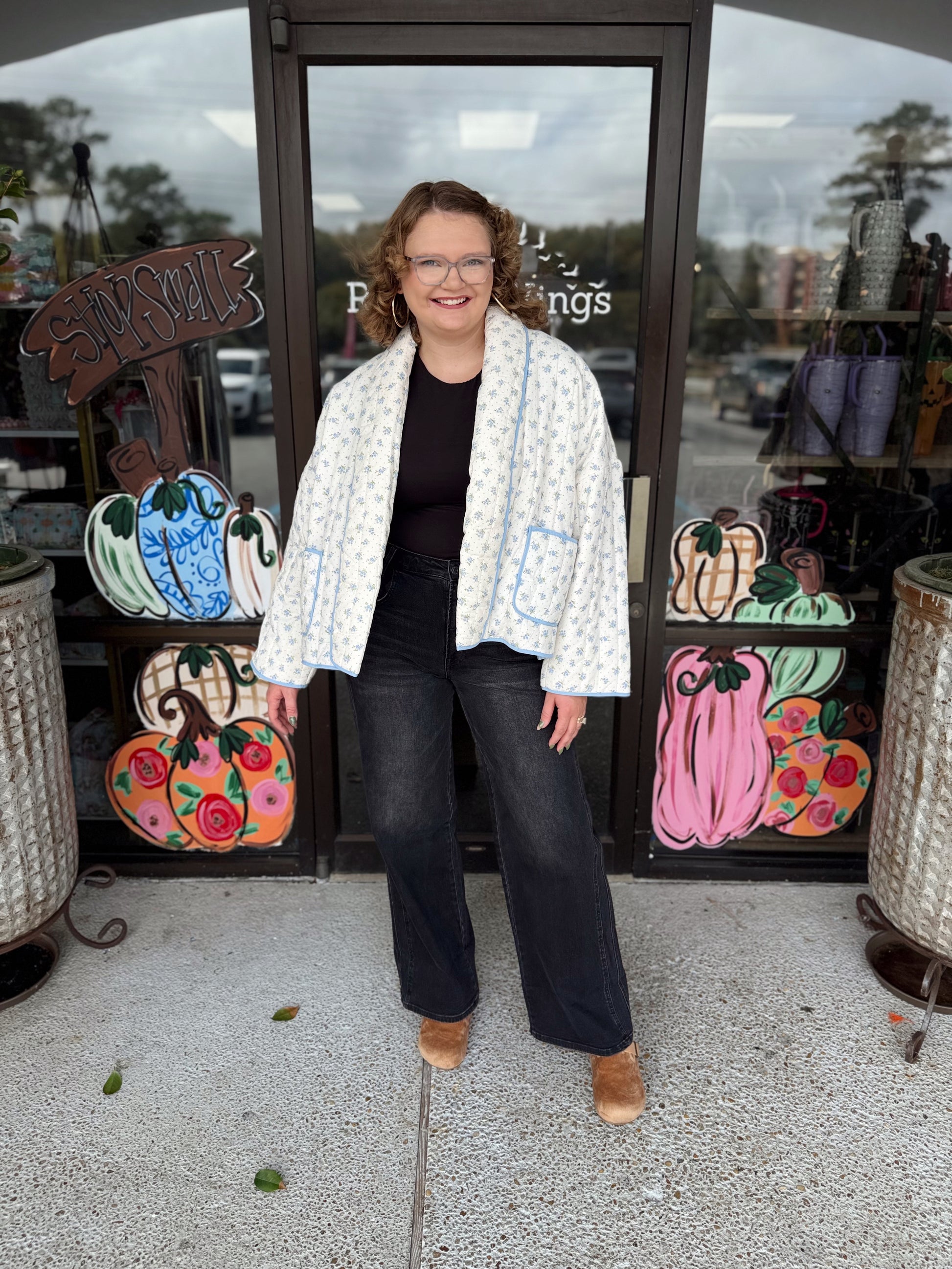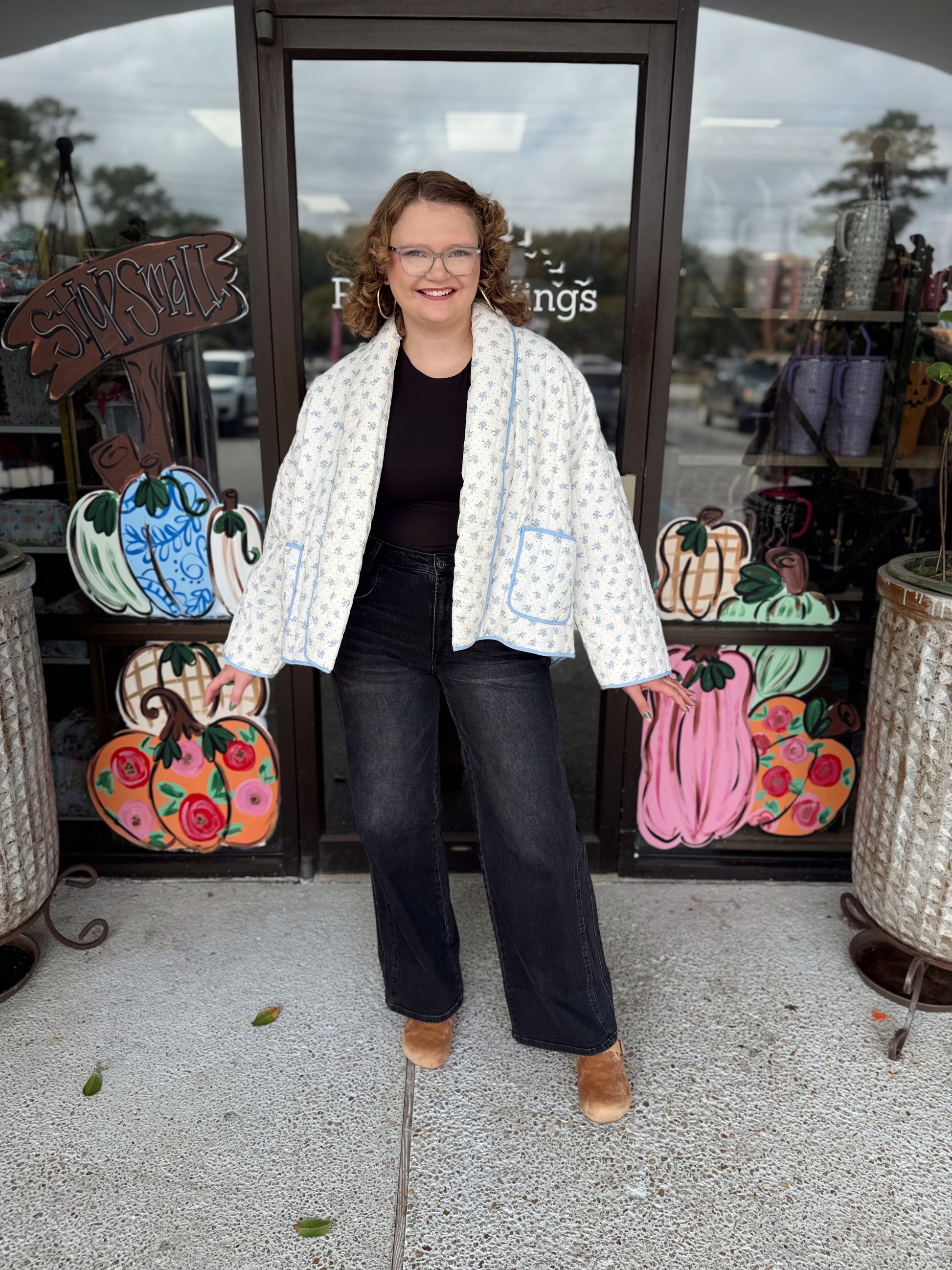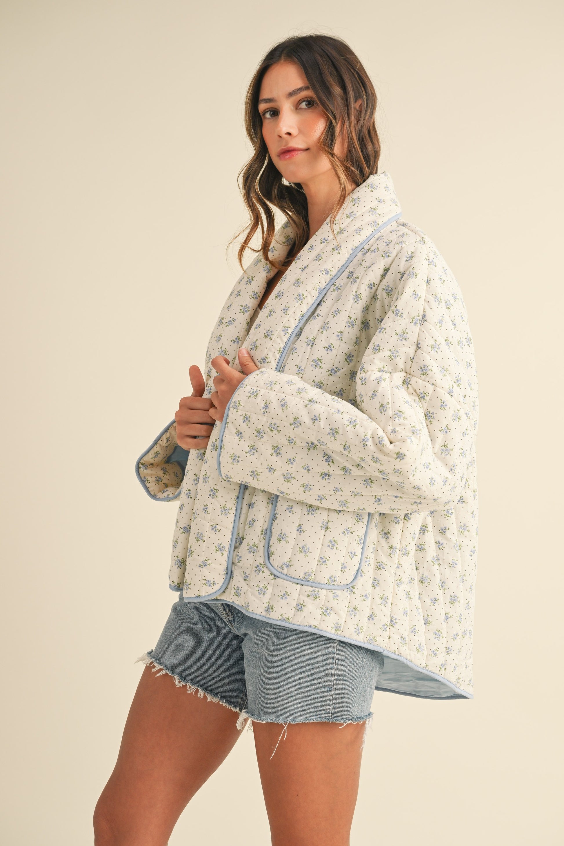 Floral print quilted open front jacket with front pocket and contrast piping detail. Lining