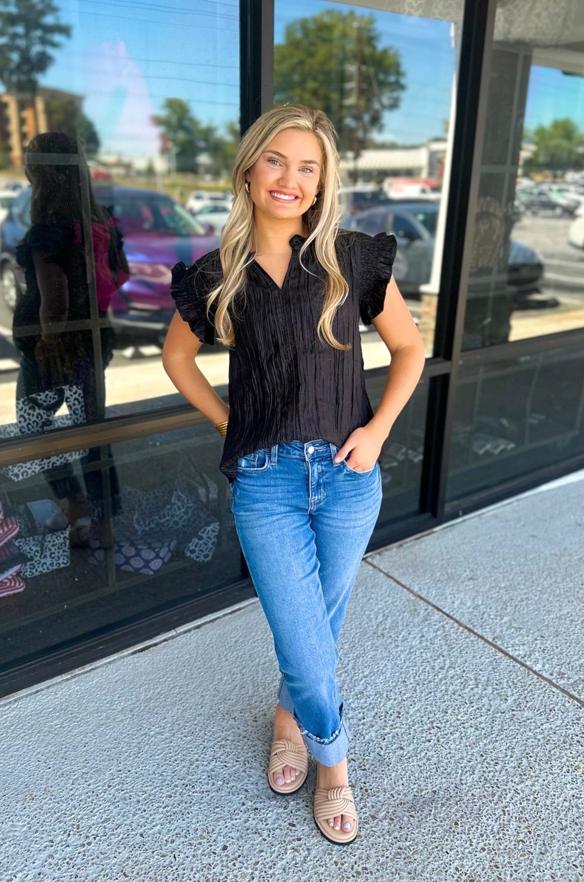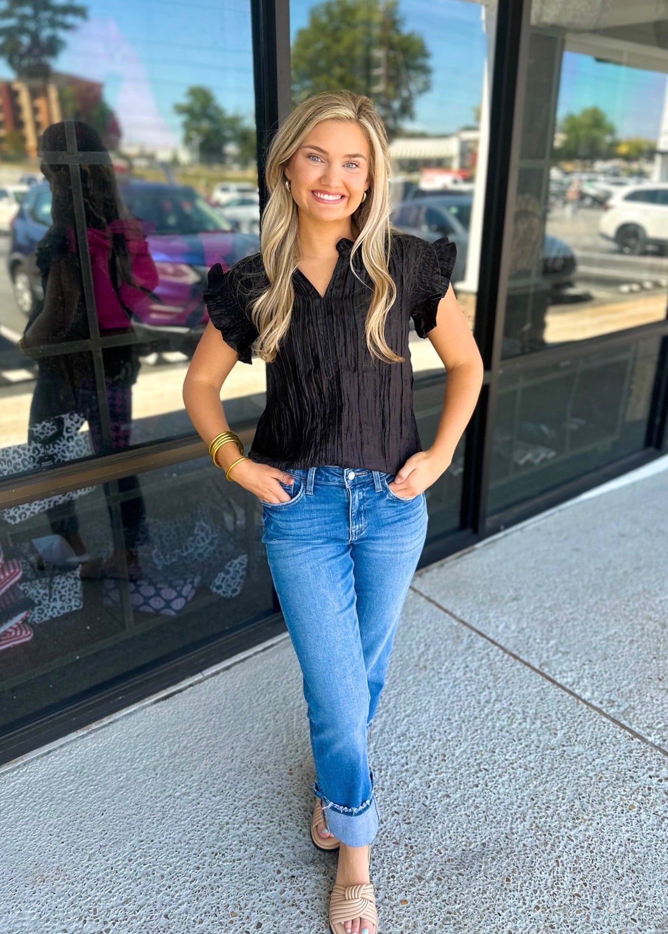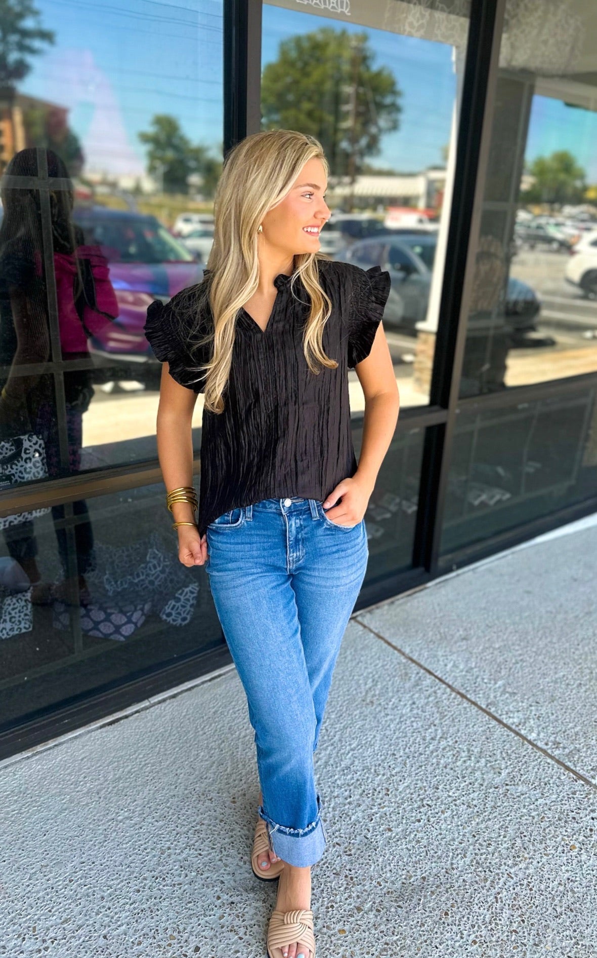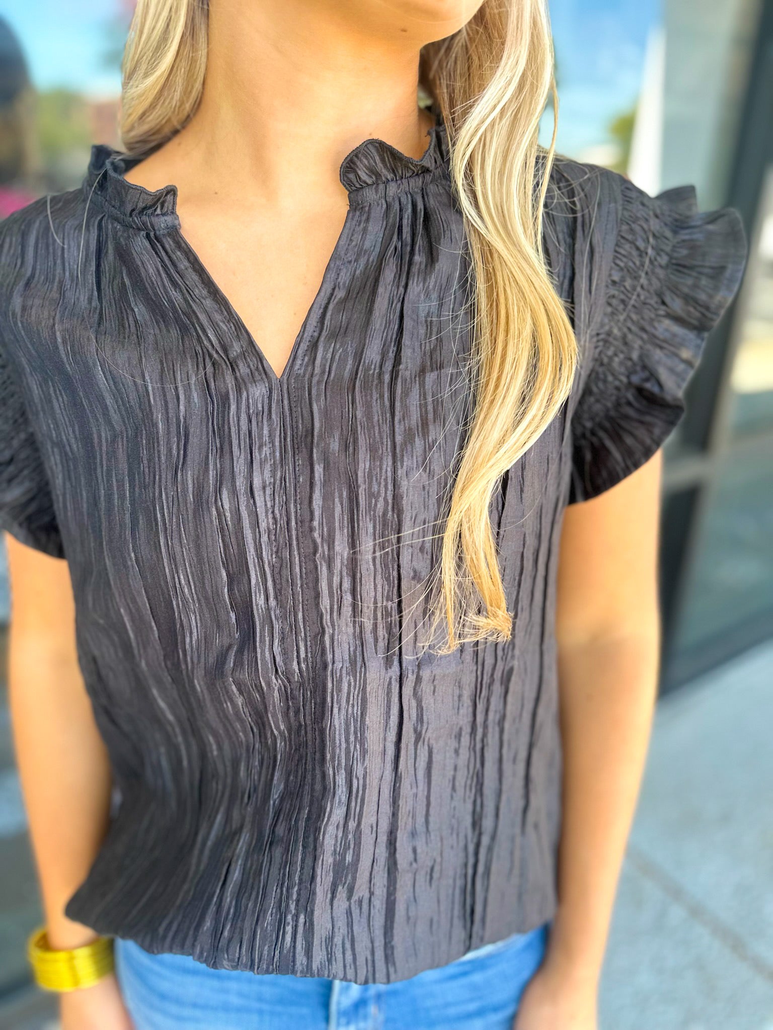 -V-neckline with ruffle - Ruffle sleeves - Smocking details on arm hole -Solid textured woven fabric