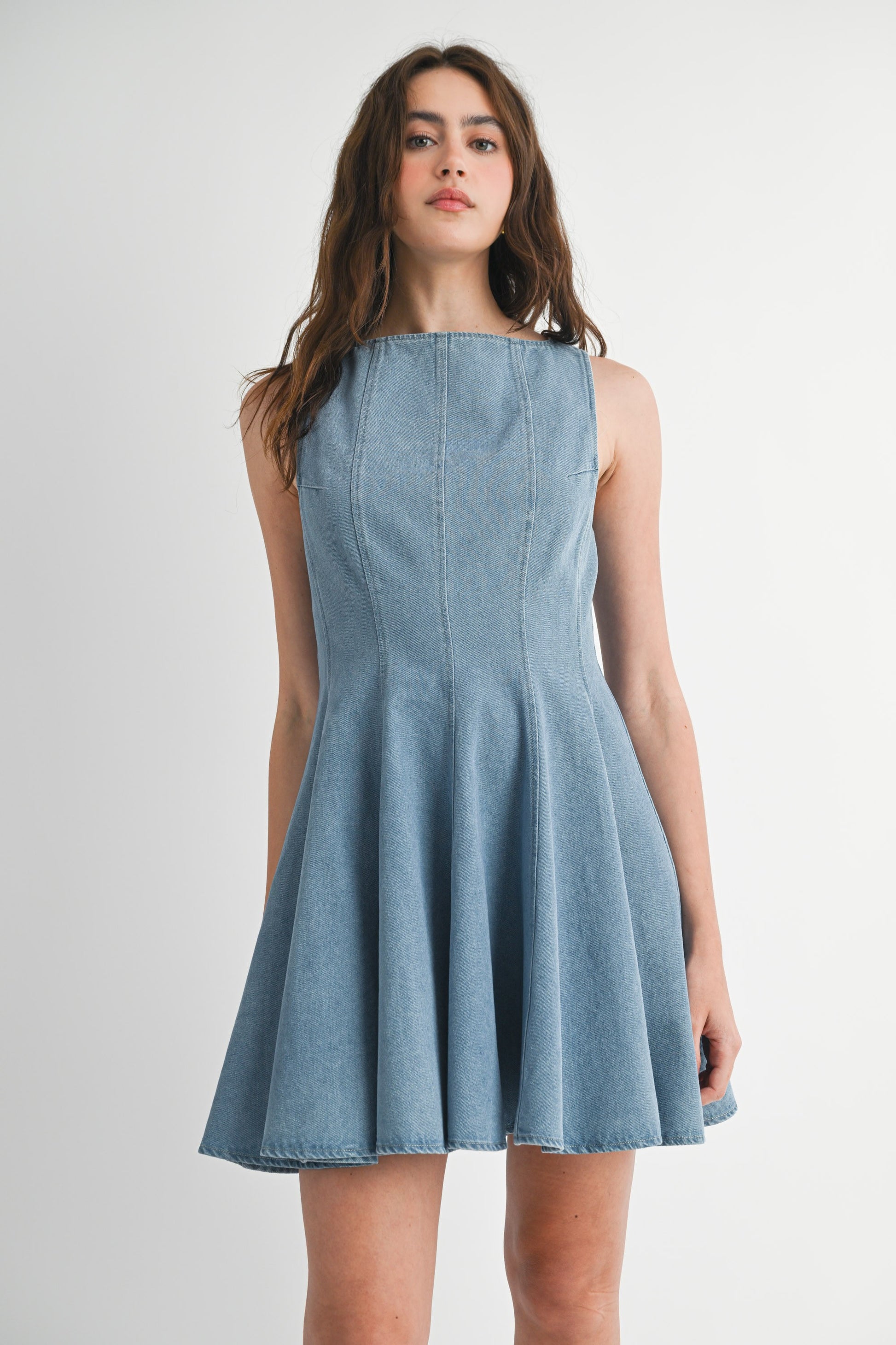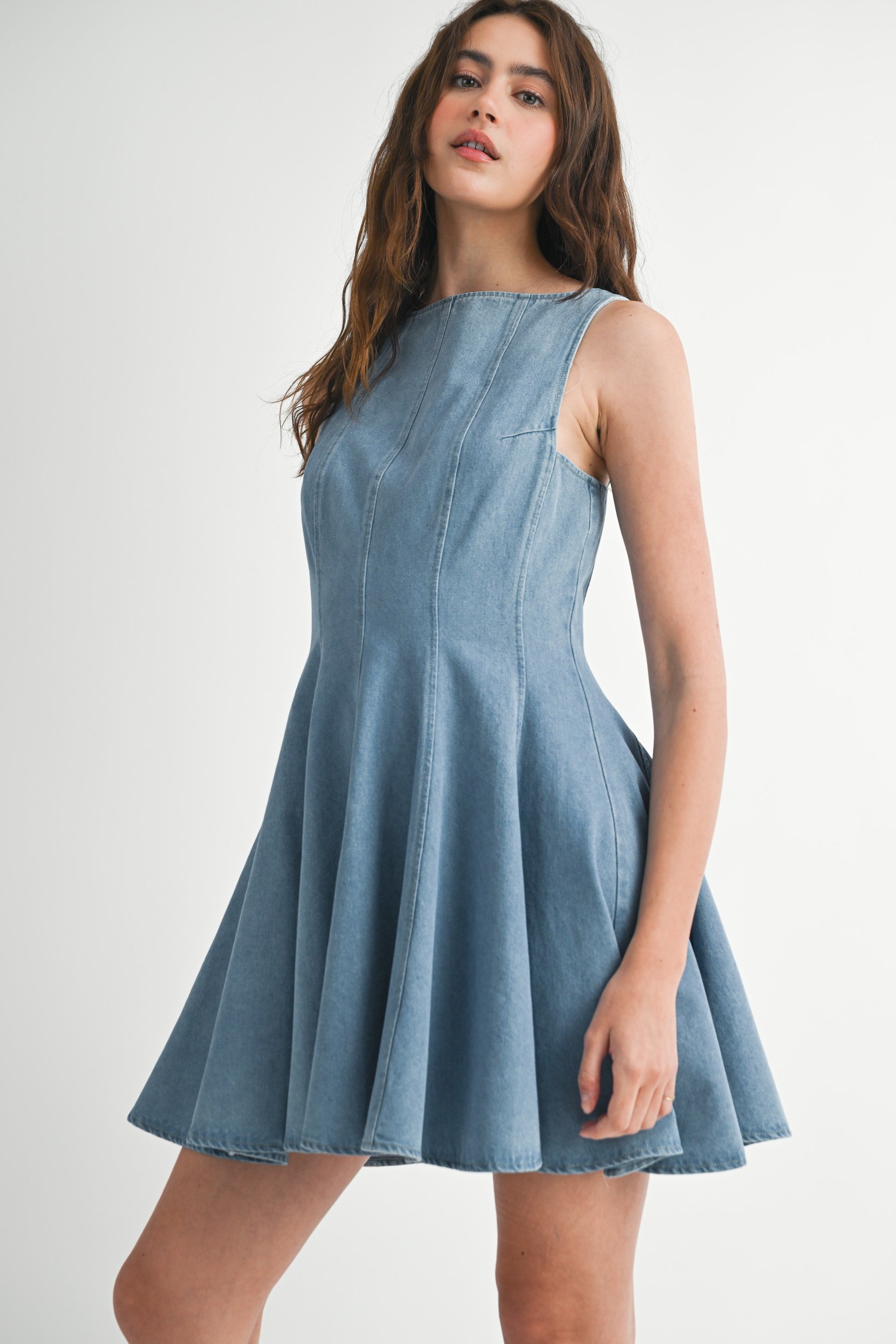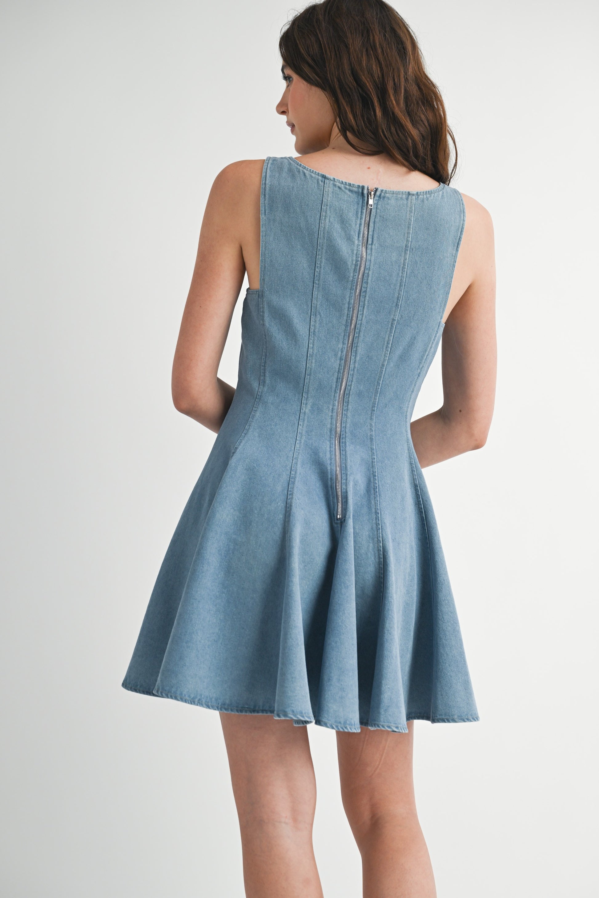 Details: Denim sleeveless a line flare mini dress. Back exposed zipper.