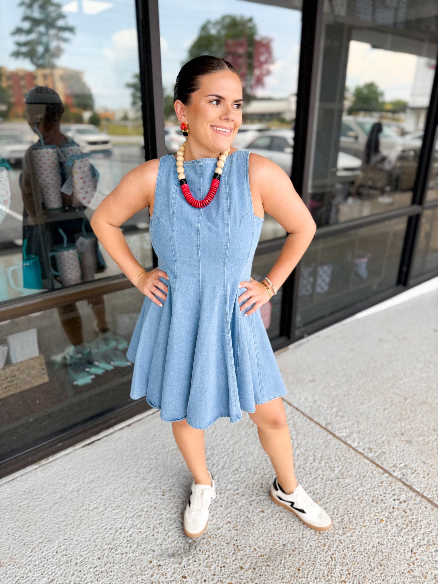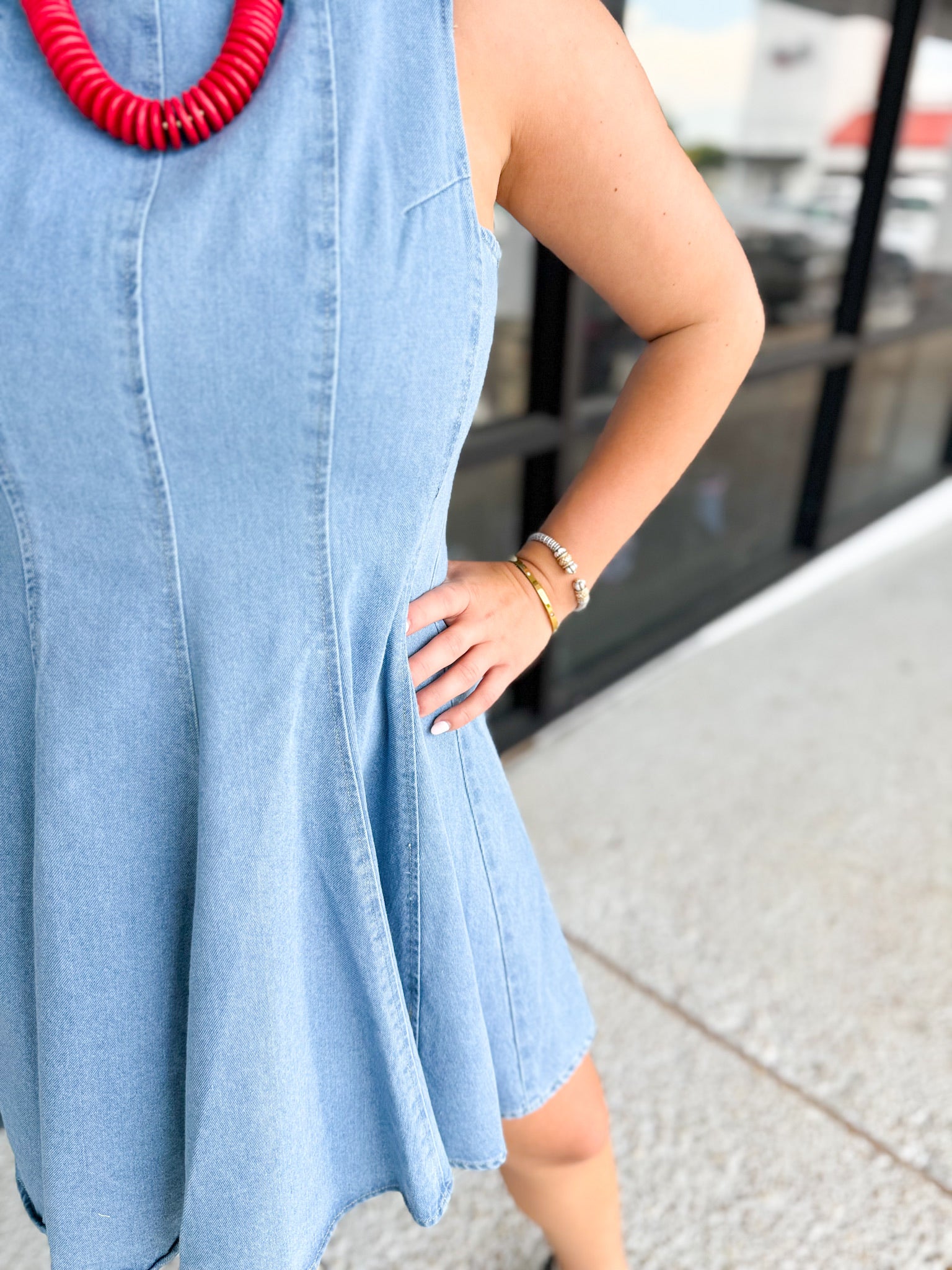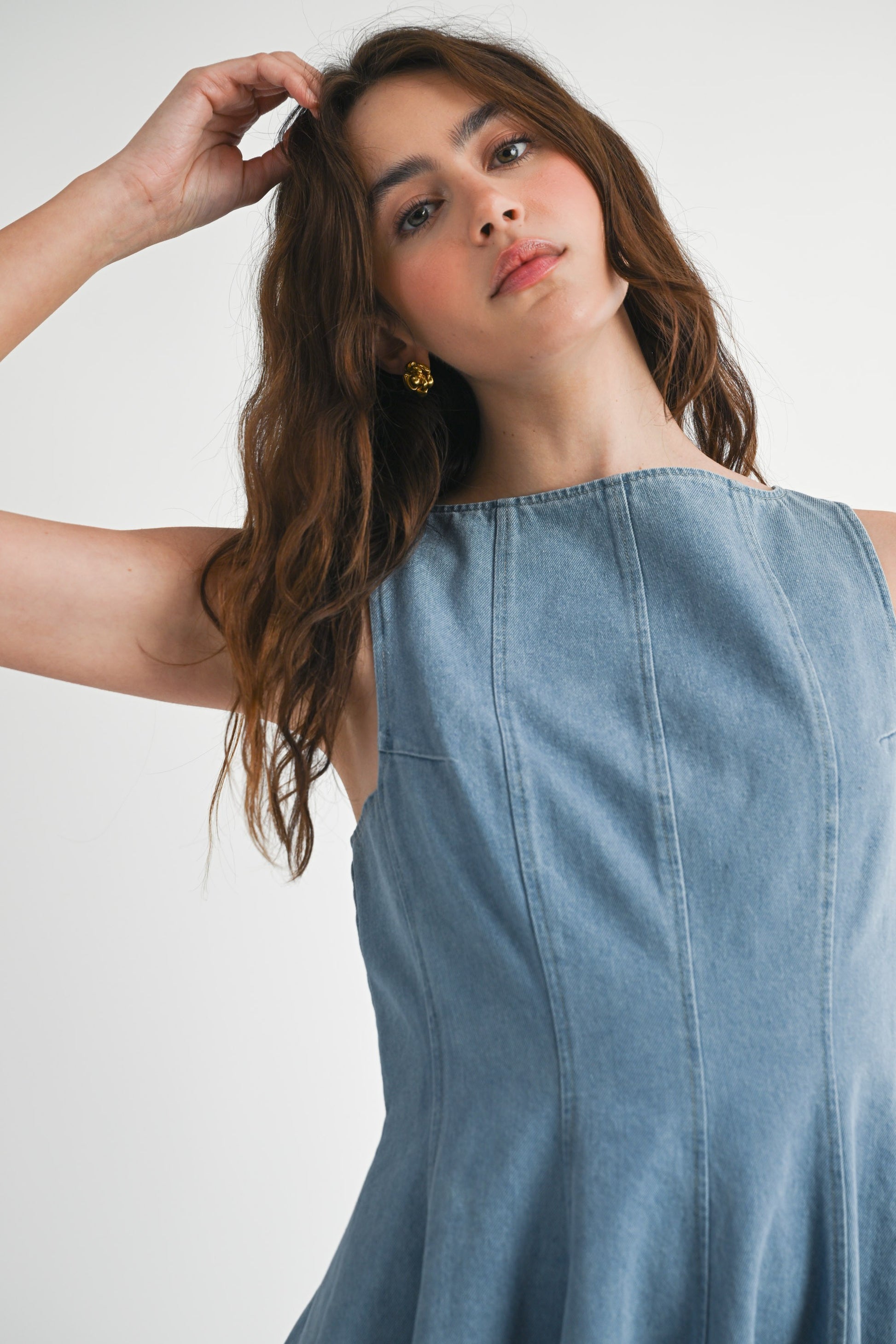Details: Denim sleeveless a line flare mini dress. Back exposed zipper.