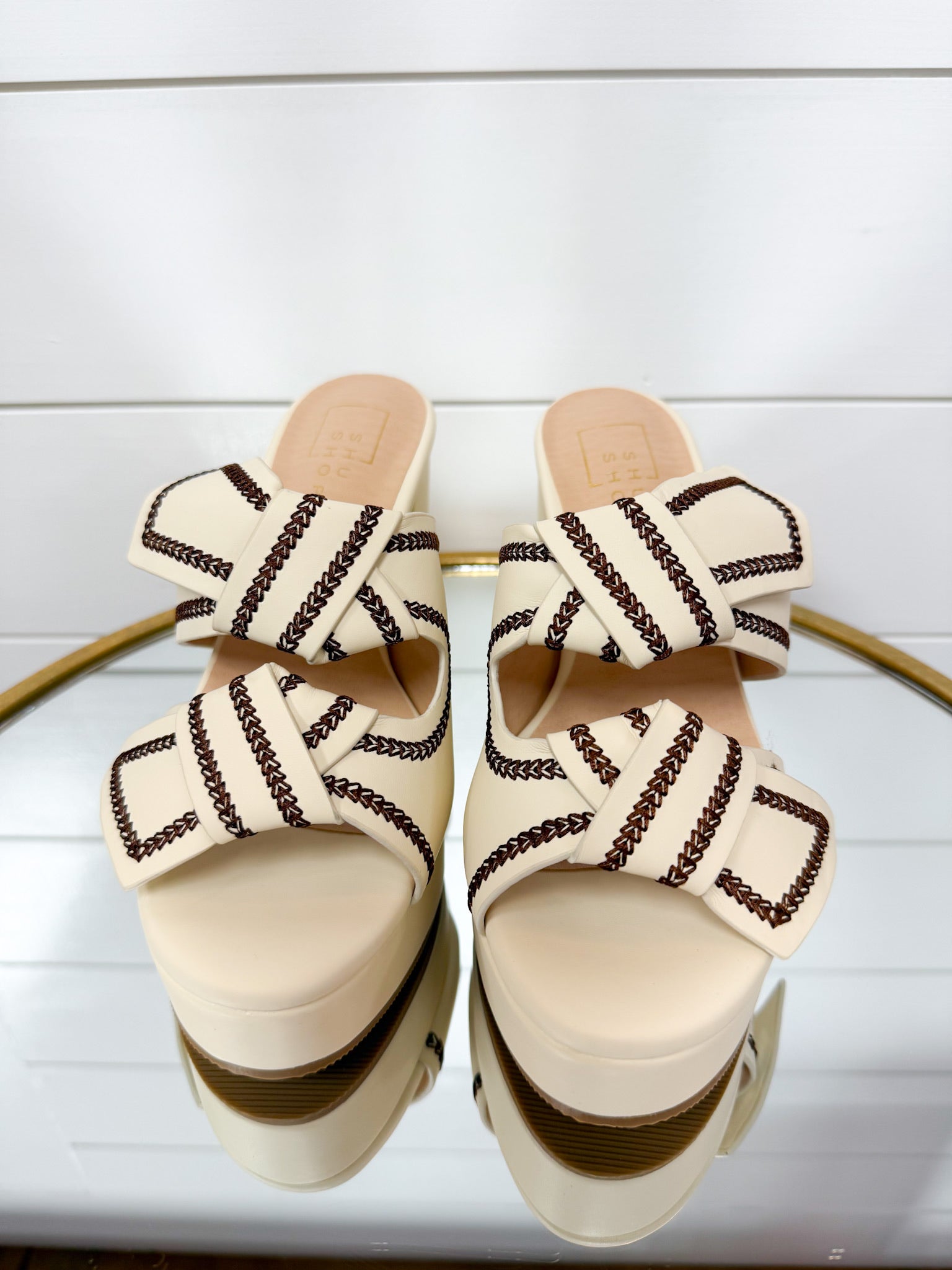 Sweet and striking. The HONEY in Bone brings bold retro energy to your step with oversized double bows, contrast trim, and a chunky block heel that turns heads. Crafted in smooth faux leather and set on a platform sole, this slip-on style is as comfortable as it is eye-catching. It’s the kind of heel that instantly upgrades everything from wide-leg pants to summer dresses. Playful yet polished-just the way we like it.