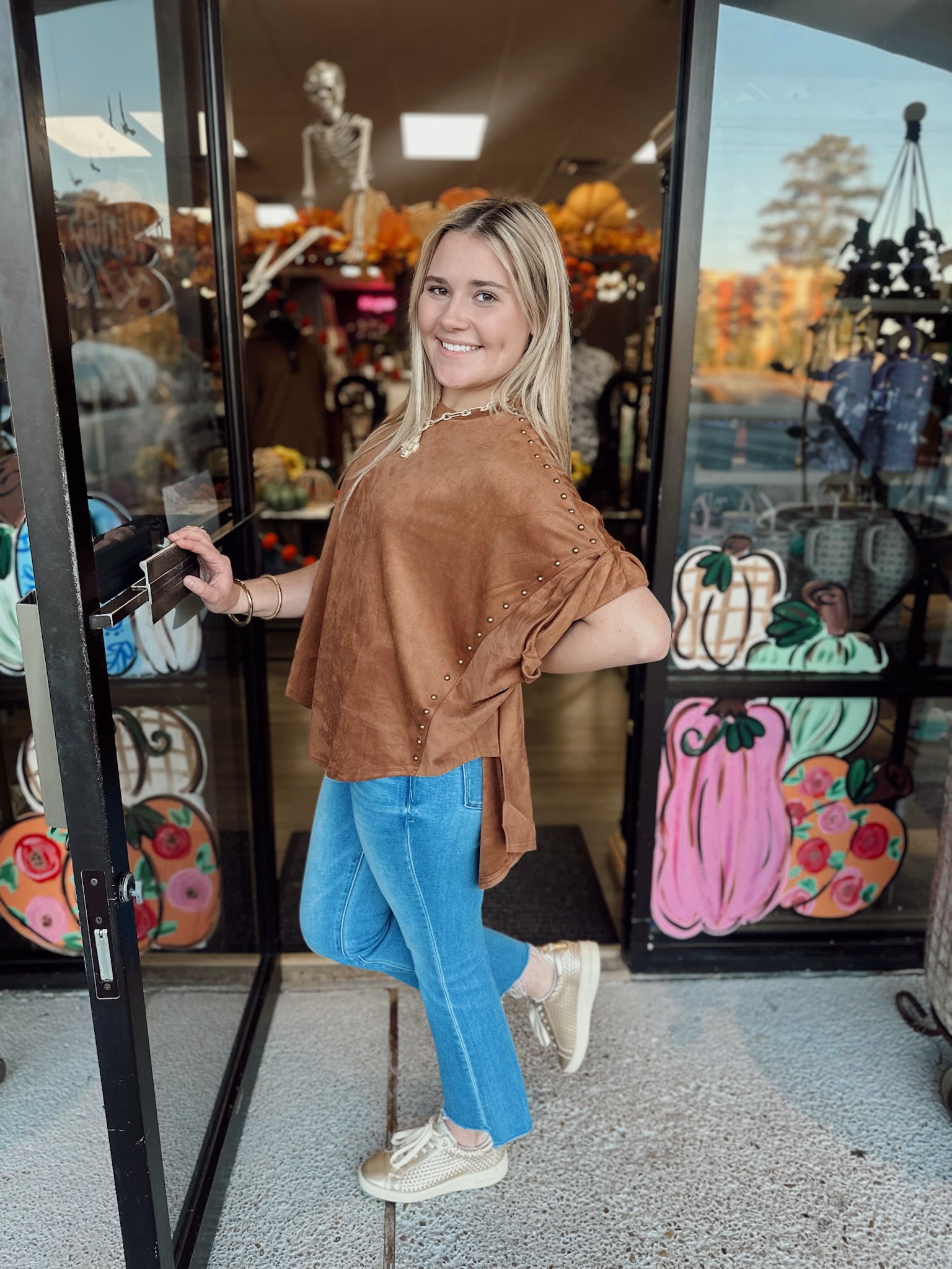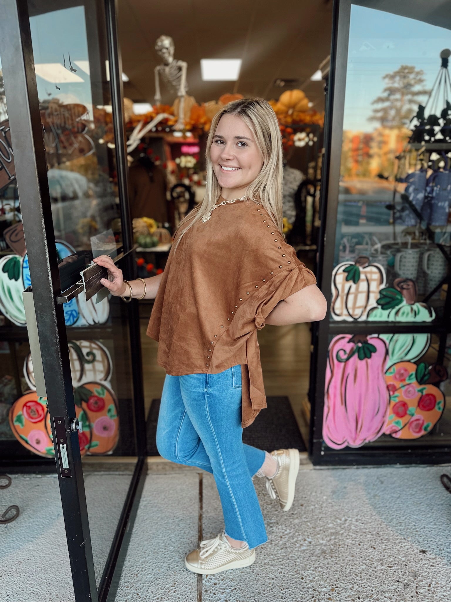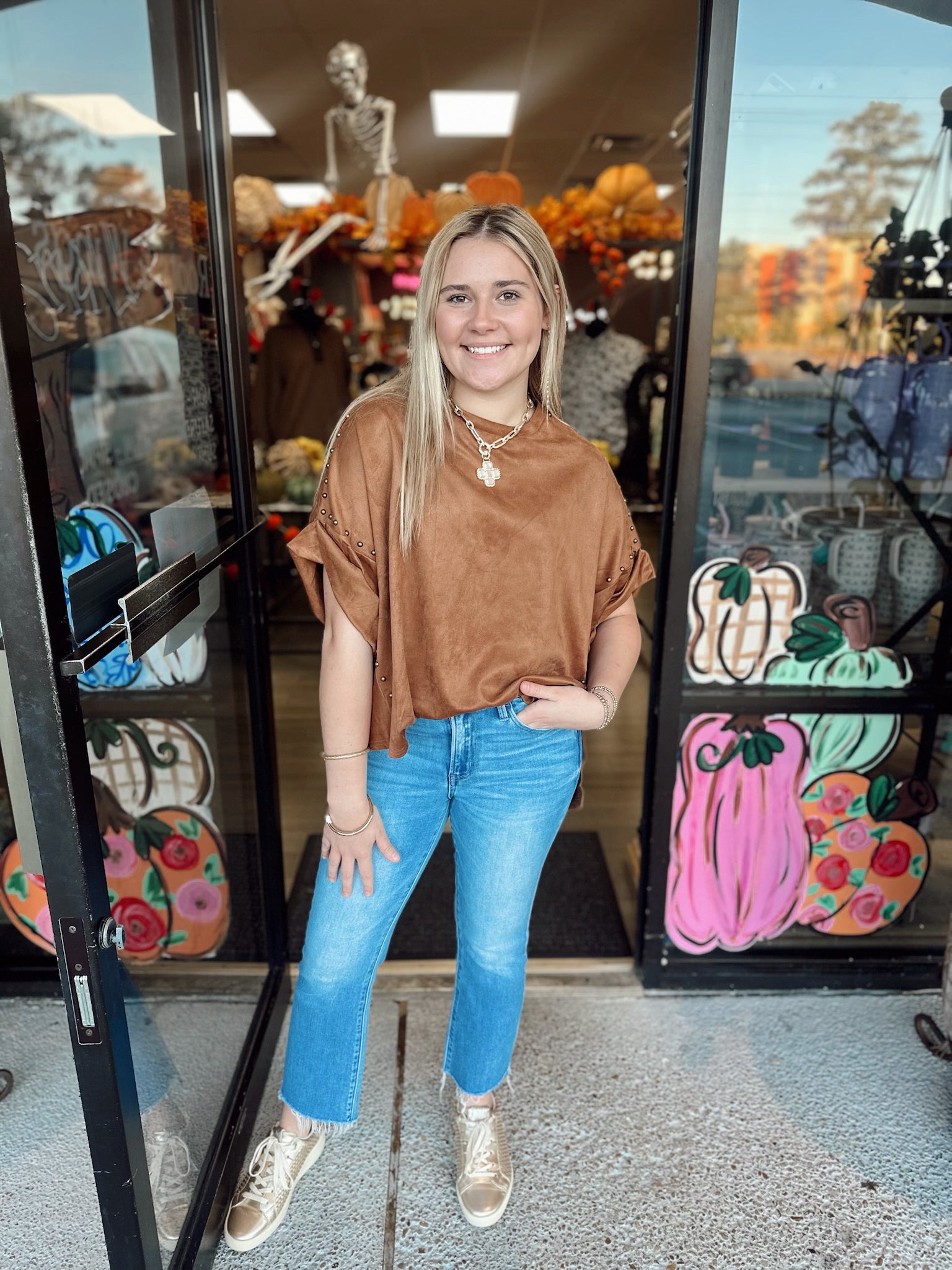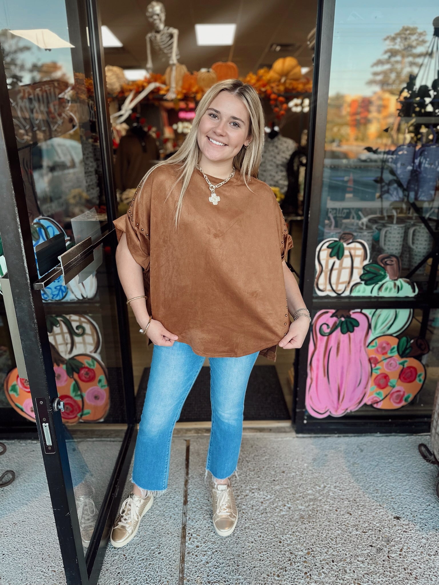 Oversized suede-look tee with side studs, rolled sleeves, and high-low hem for a relaxed western feel 95% Polyester, 5% Spandex