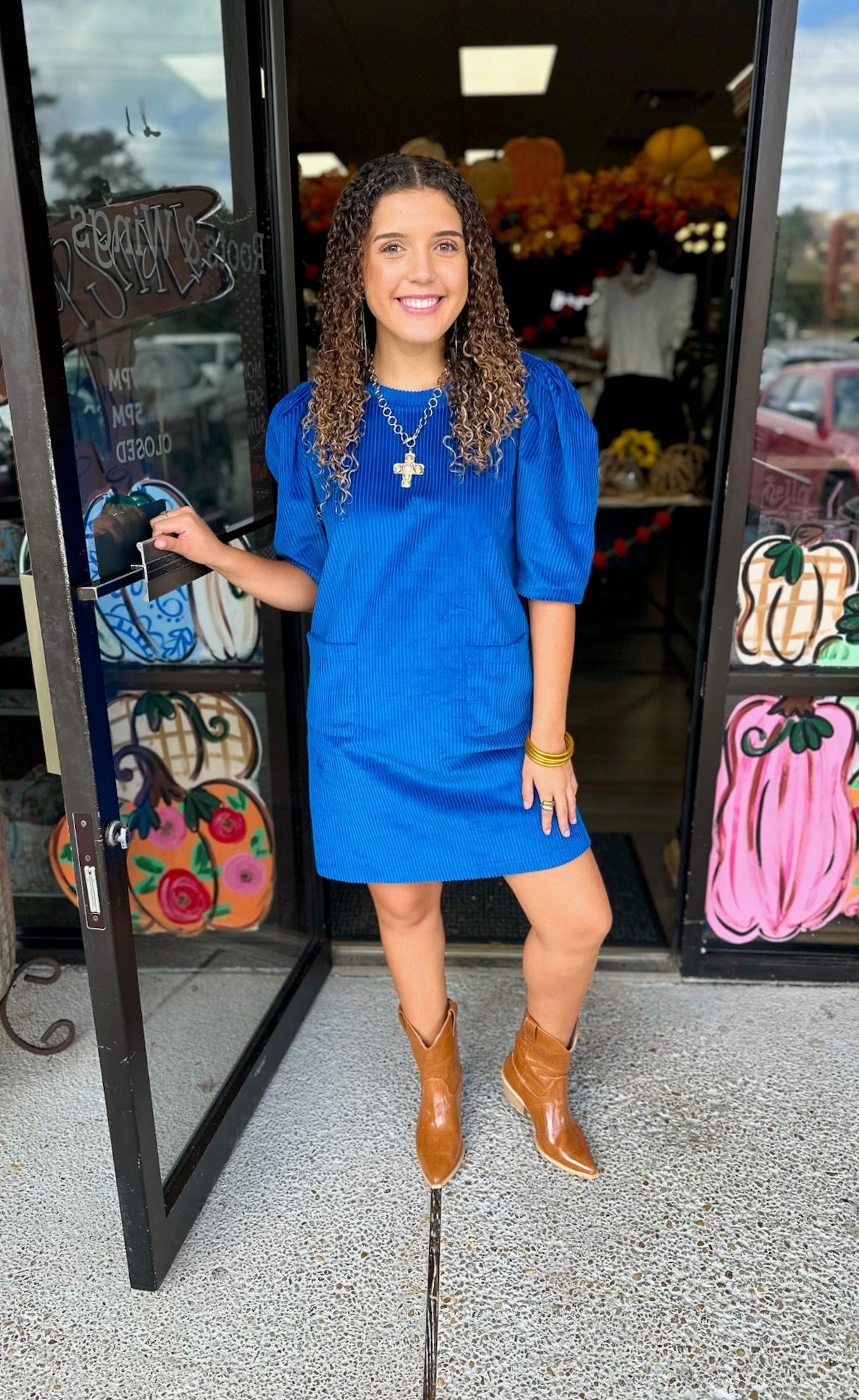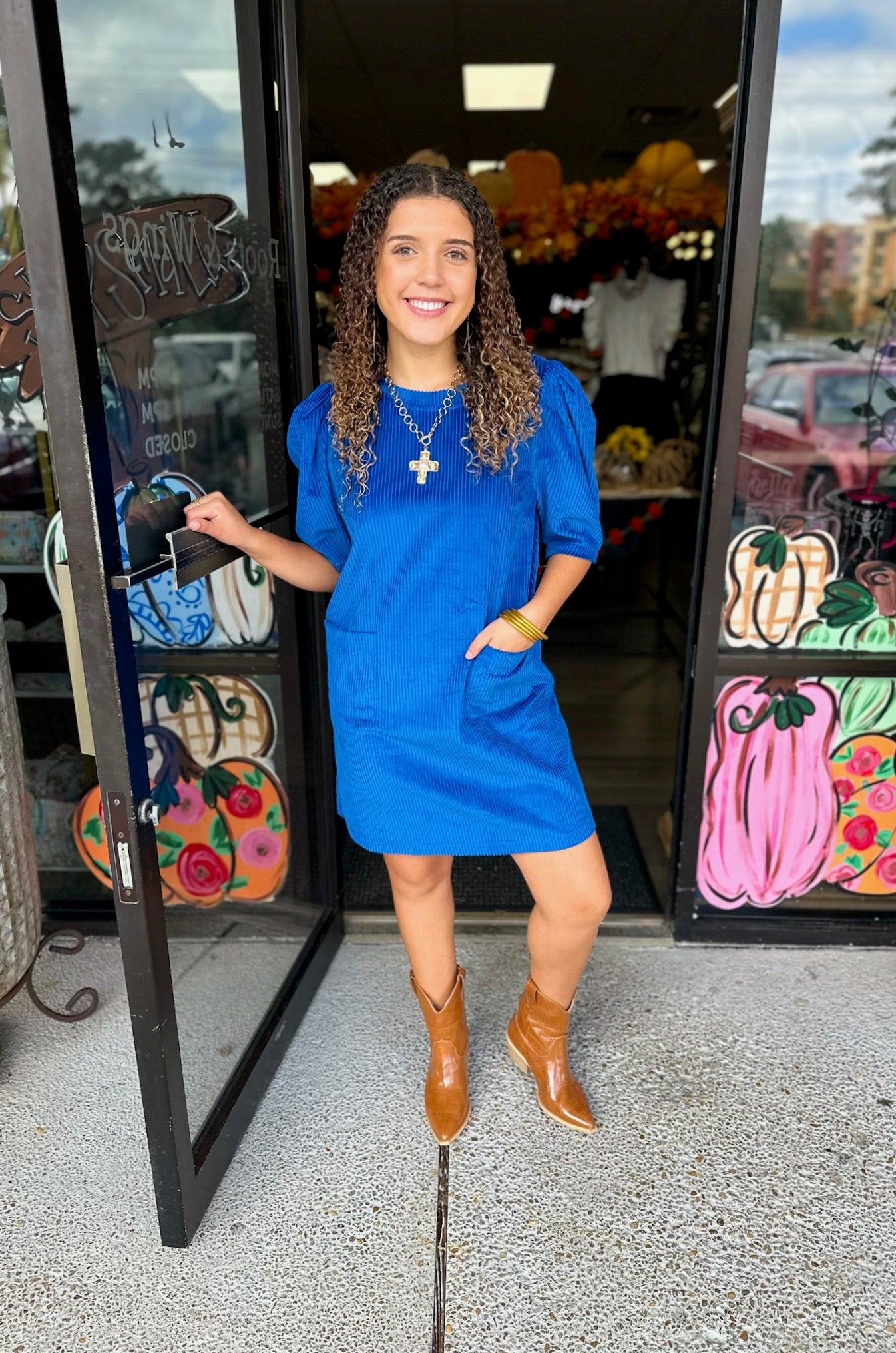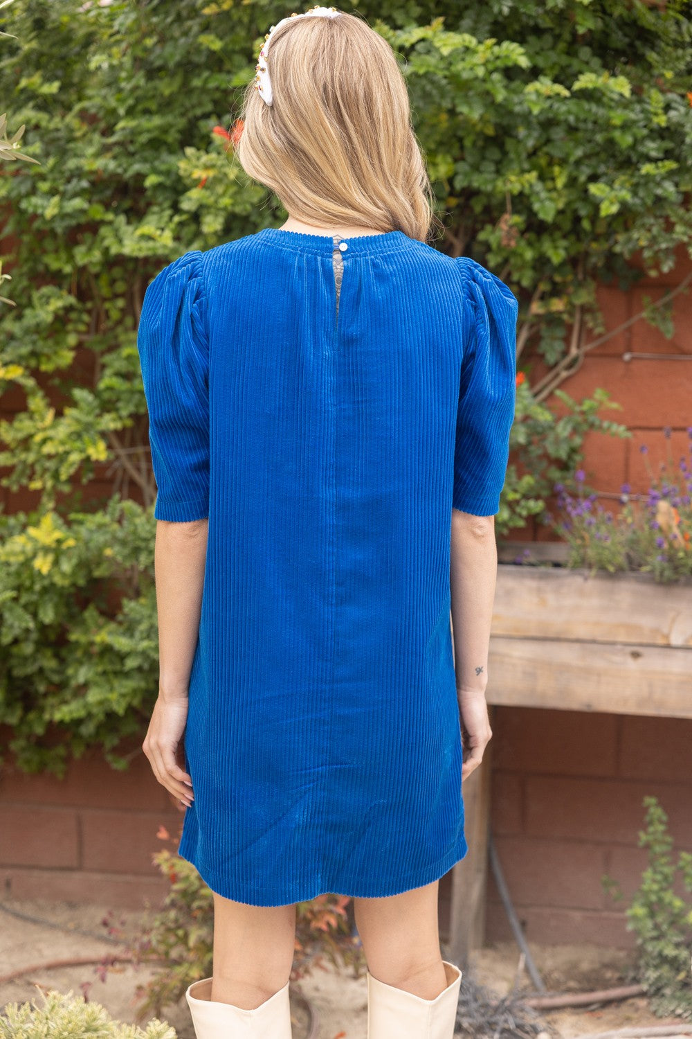 - Round neckline with band - Pleated half puff sleeve - Two front pockets -Back neck button and loop closure -Ribbed corduroy woven fabric