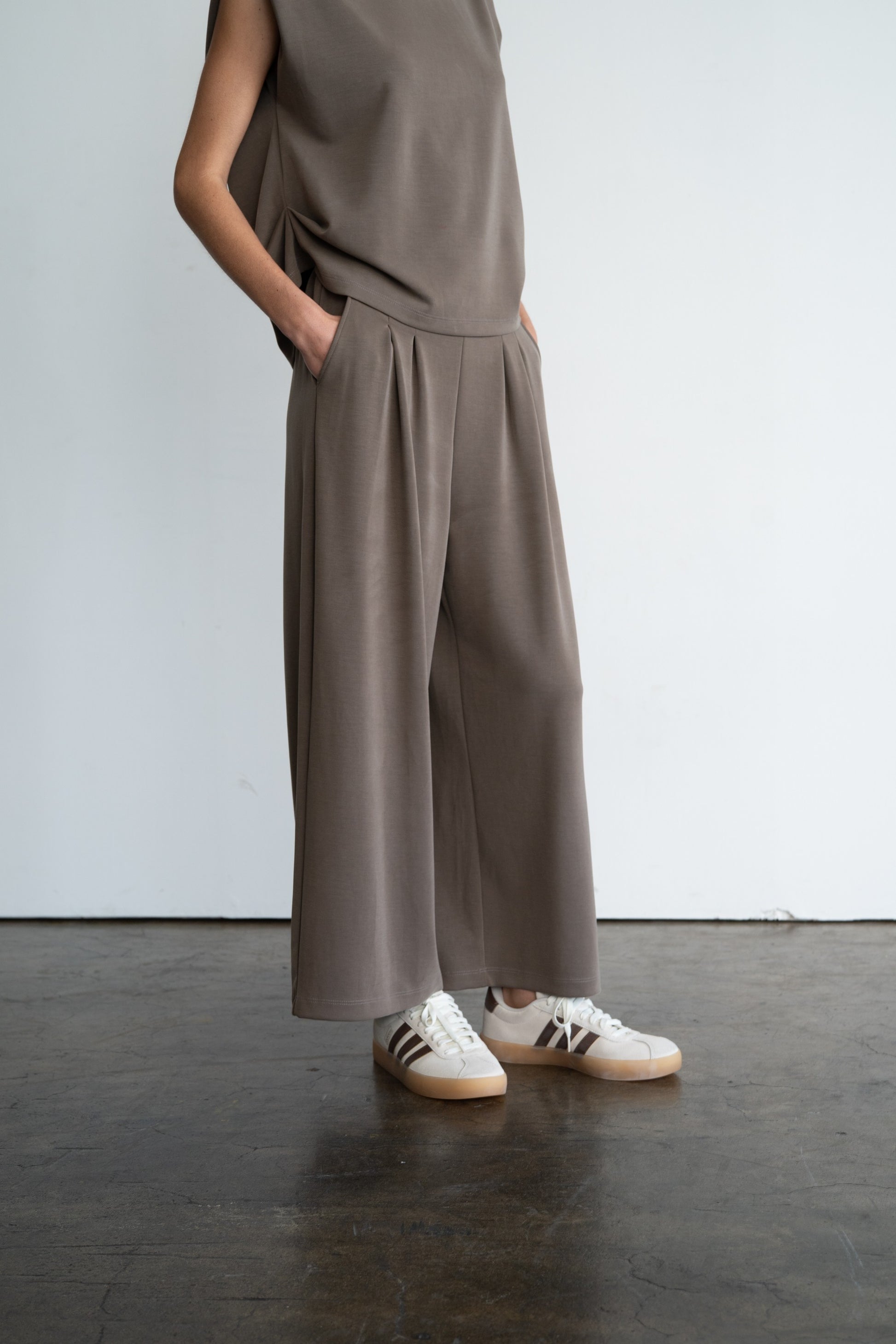 High-rise waist with soft pleats for a flattering fit - Wide leg silhouette for effortless movement - Side pockets for functionality and ease - Smooth, drapey fabric with a polished finish