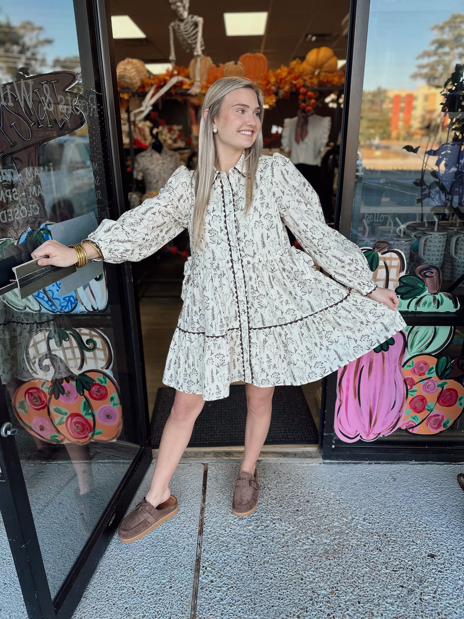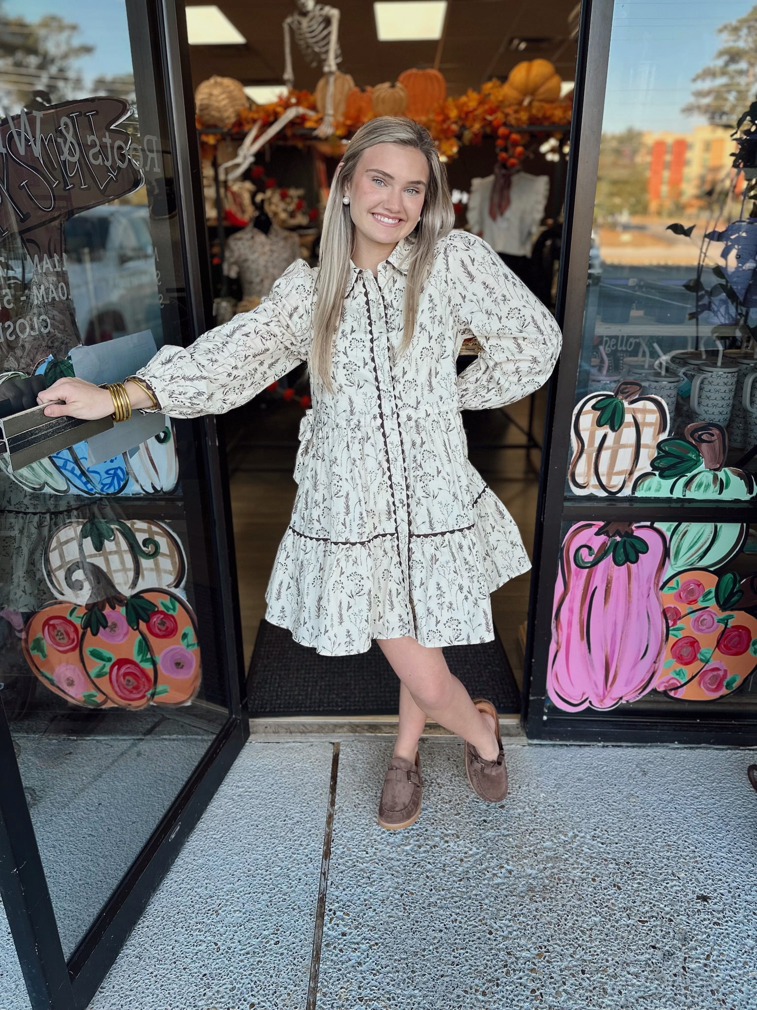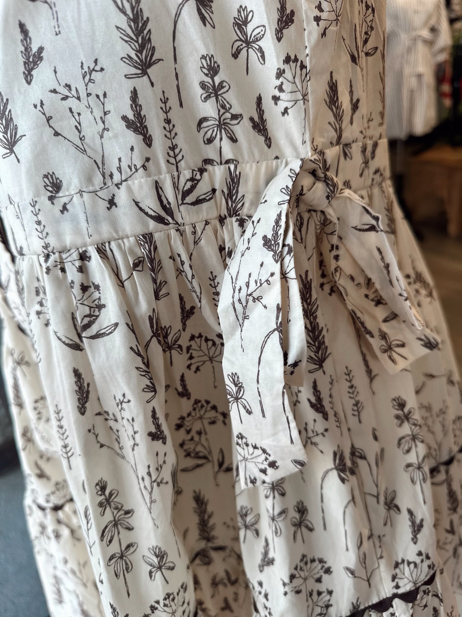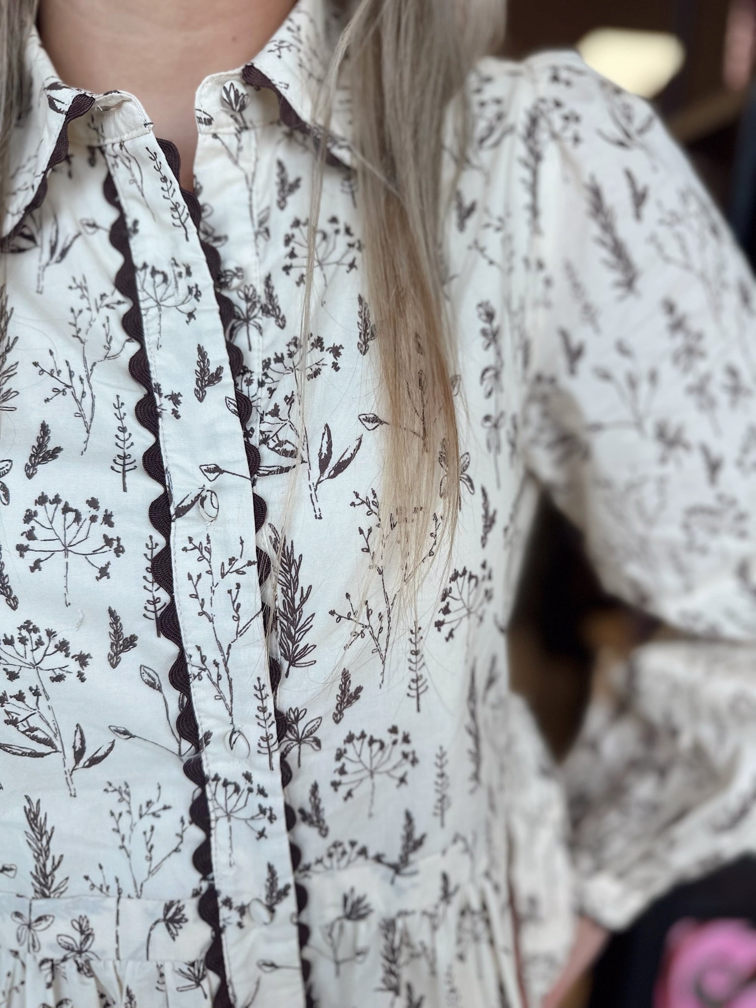 Long sleeves button down floral dress with side pockets, drawstring waist, side waist tie detail, lace trim accent