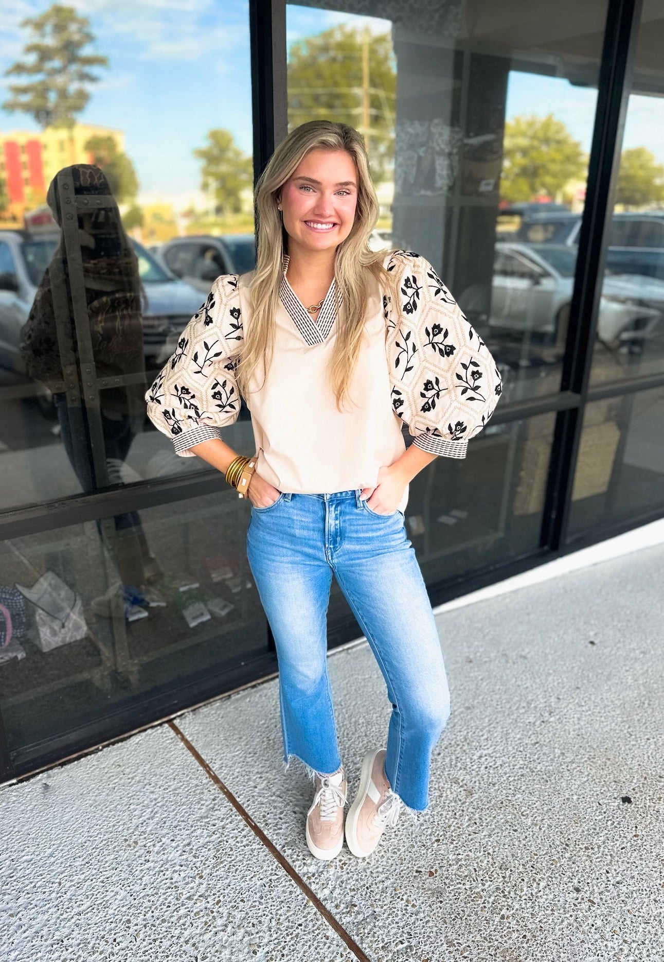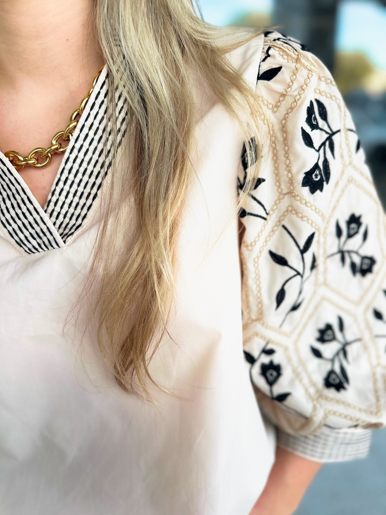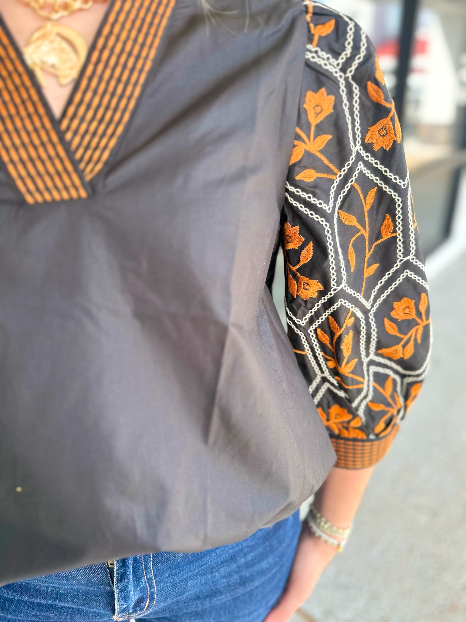 Floral pattern embroidered ¾ sleeve top featuring embroidered stitch embellished band. Unlined. Woven. Non-sheer. Lightweight.