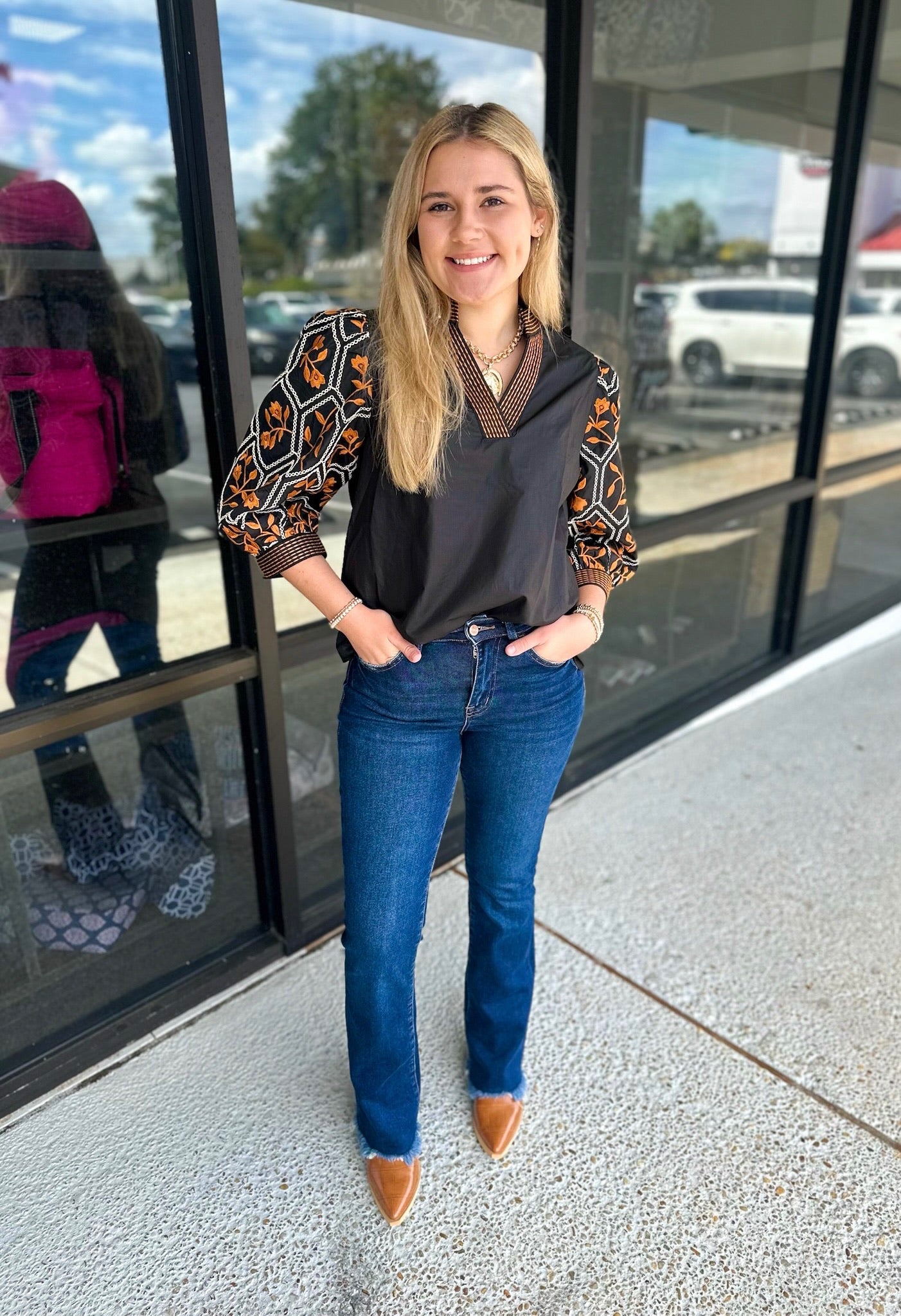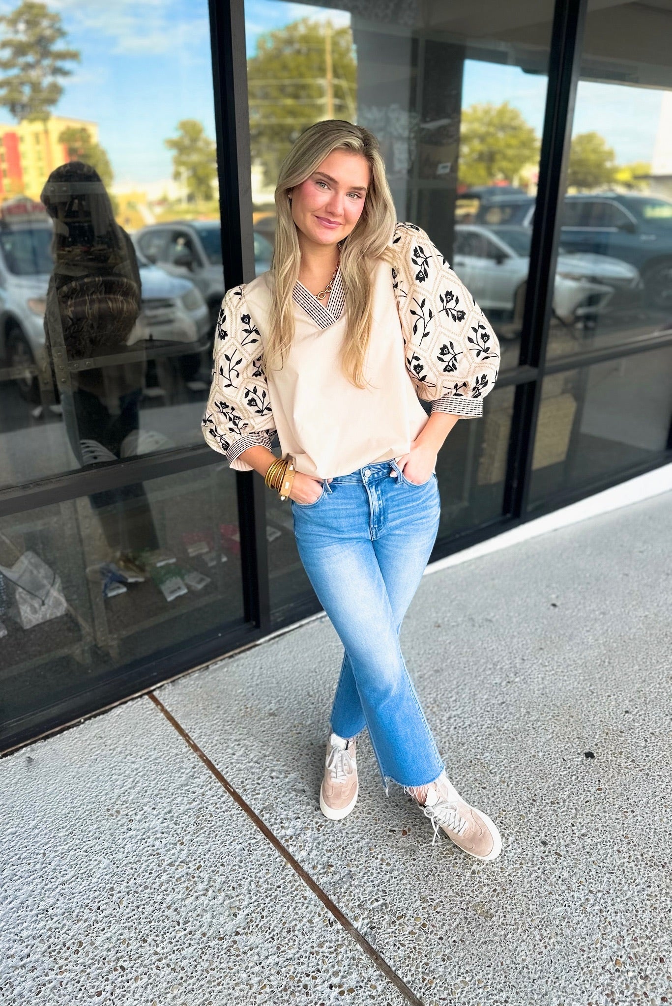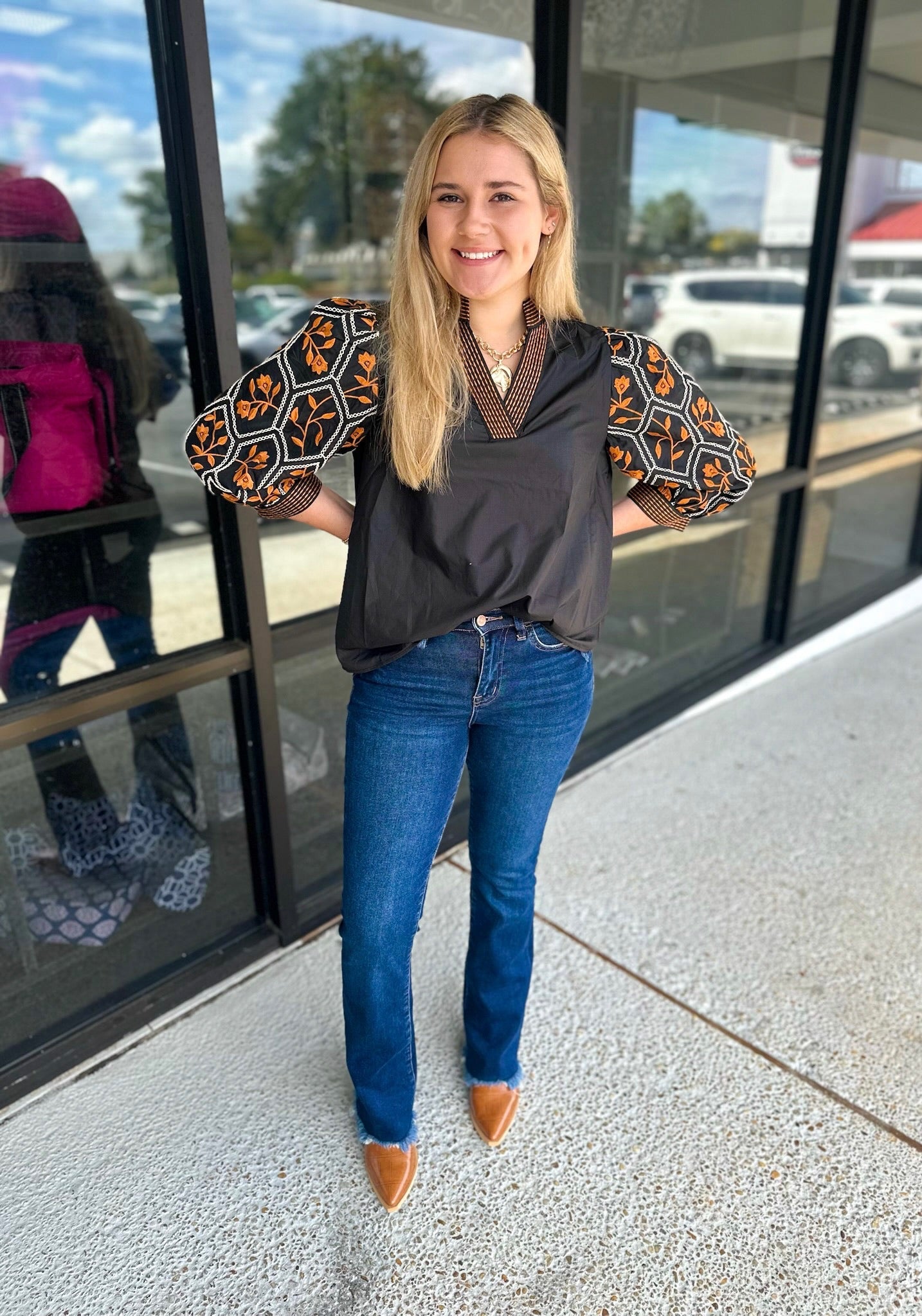 Floral pattern embroidered ¾ sleeve top featuring embroidered stitch embellished band. Unlined. Woven. Non-sheer. Lightweight.