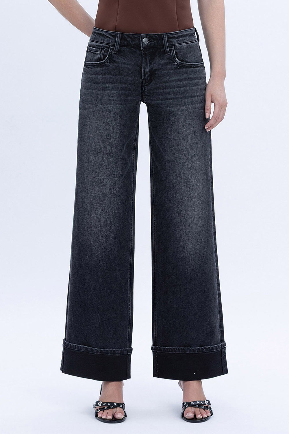 LOW RISE CUFFED BAGGY WIDE JEANS COMFORT STRETCH DENIM, LOW RISE WAIST, SINGLE CUFF HEM, FULL LENGTH, BAGGY WIDE JEANS