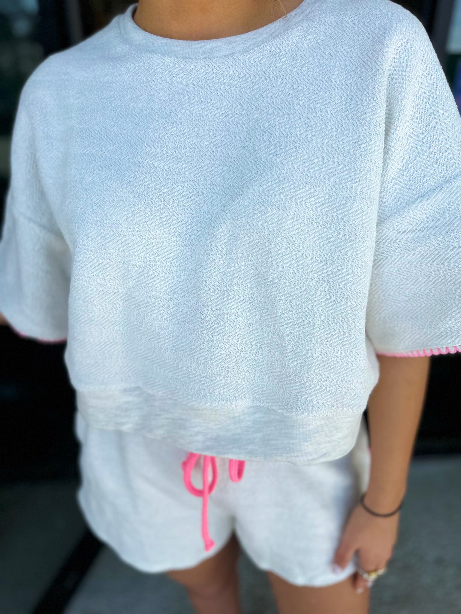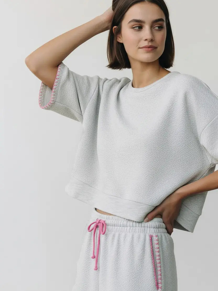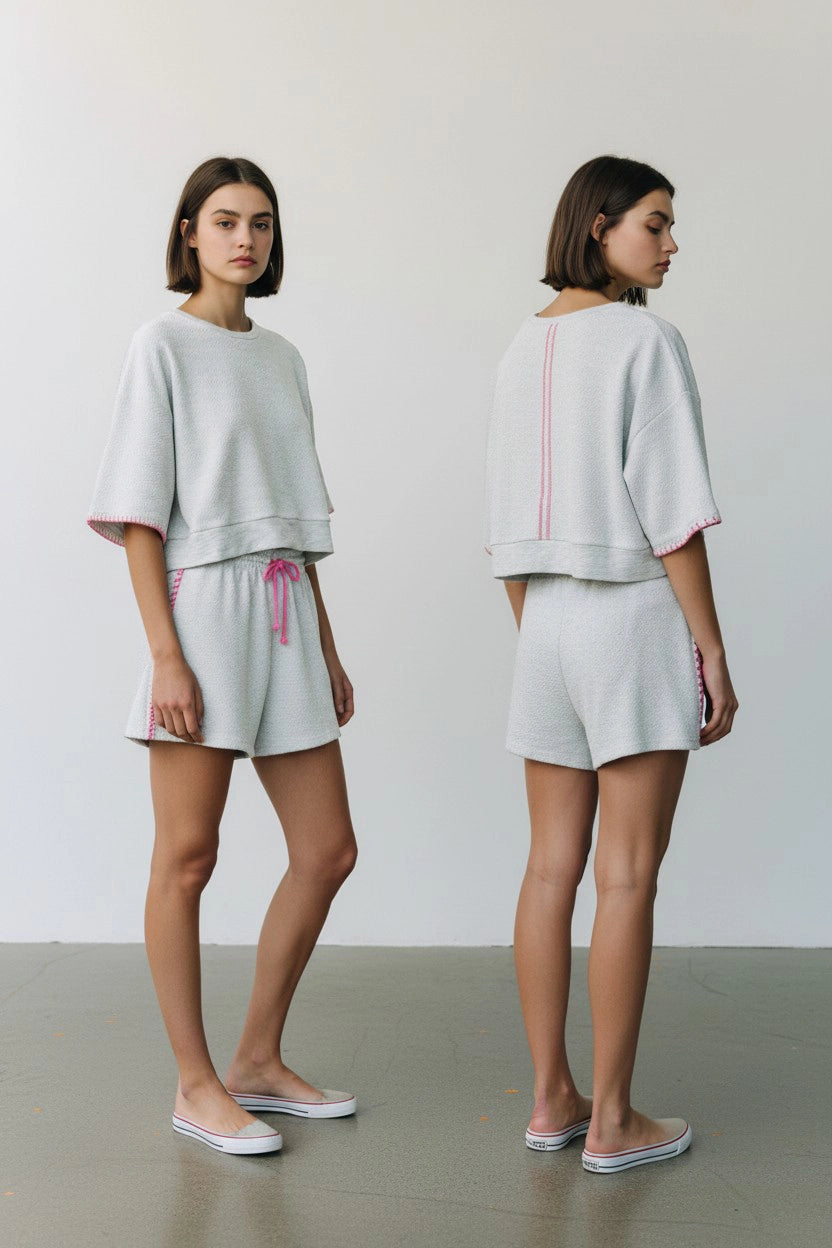 Oversized Cropped Sweatshirt & Bow Tie Shorts Set 𝐓𝐨𝐩 • Crew neck • Dropped shoulder, long sleeves • Cropped silhouette • Scallop trim detail on cuffs • Oversized fit 𝐒𝐡𝐨𝐫𝐭𝐬 • Elastic waistband • Drawstring self tie • Scallop trim detail on side • Relaxed fit
