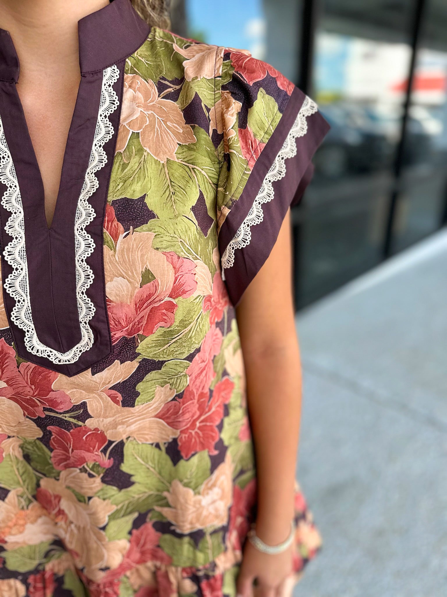 Floral print flutter sleeve mini dress featuring scallop inset contrast accent V-neck band. Pockets at sides. Lined. Woven. Non-sheer. Lightweight.