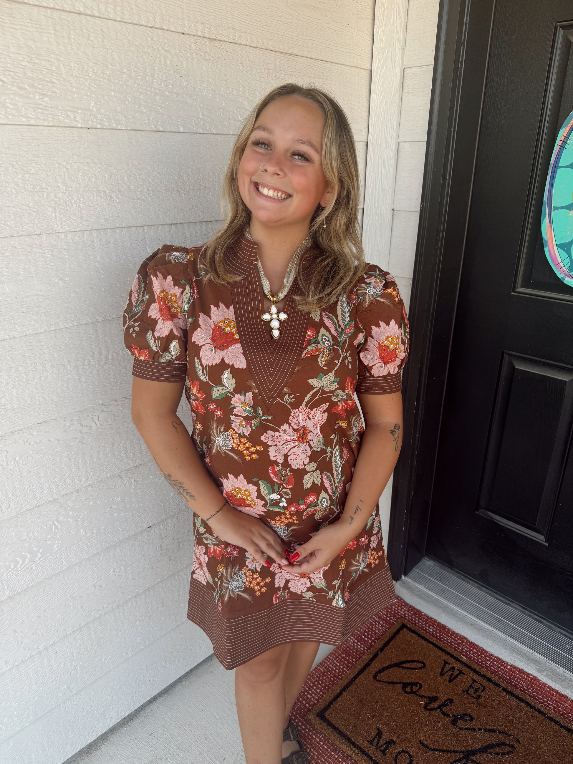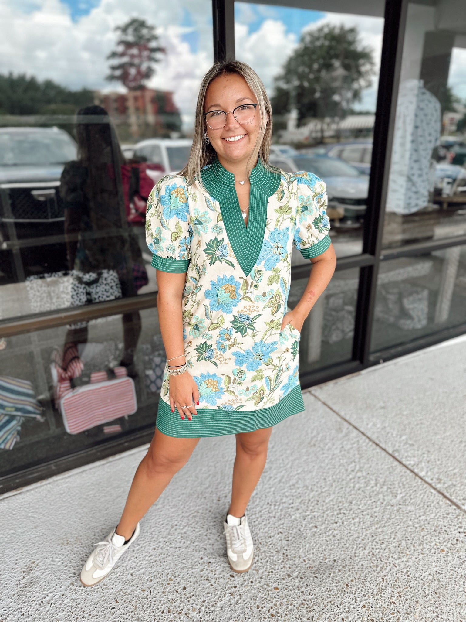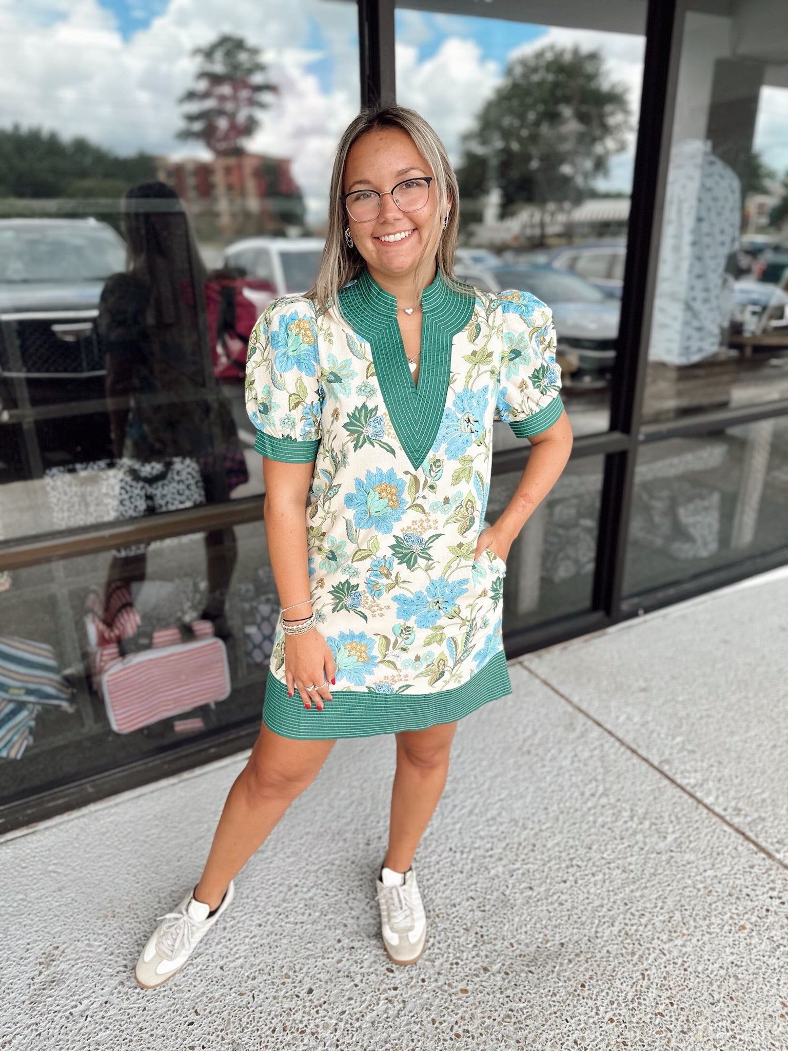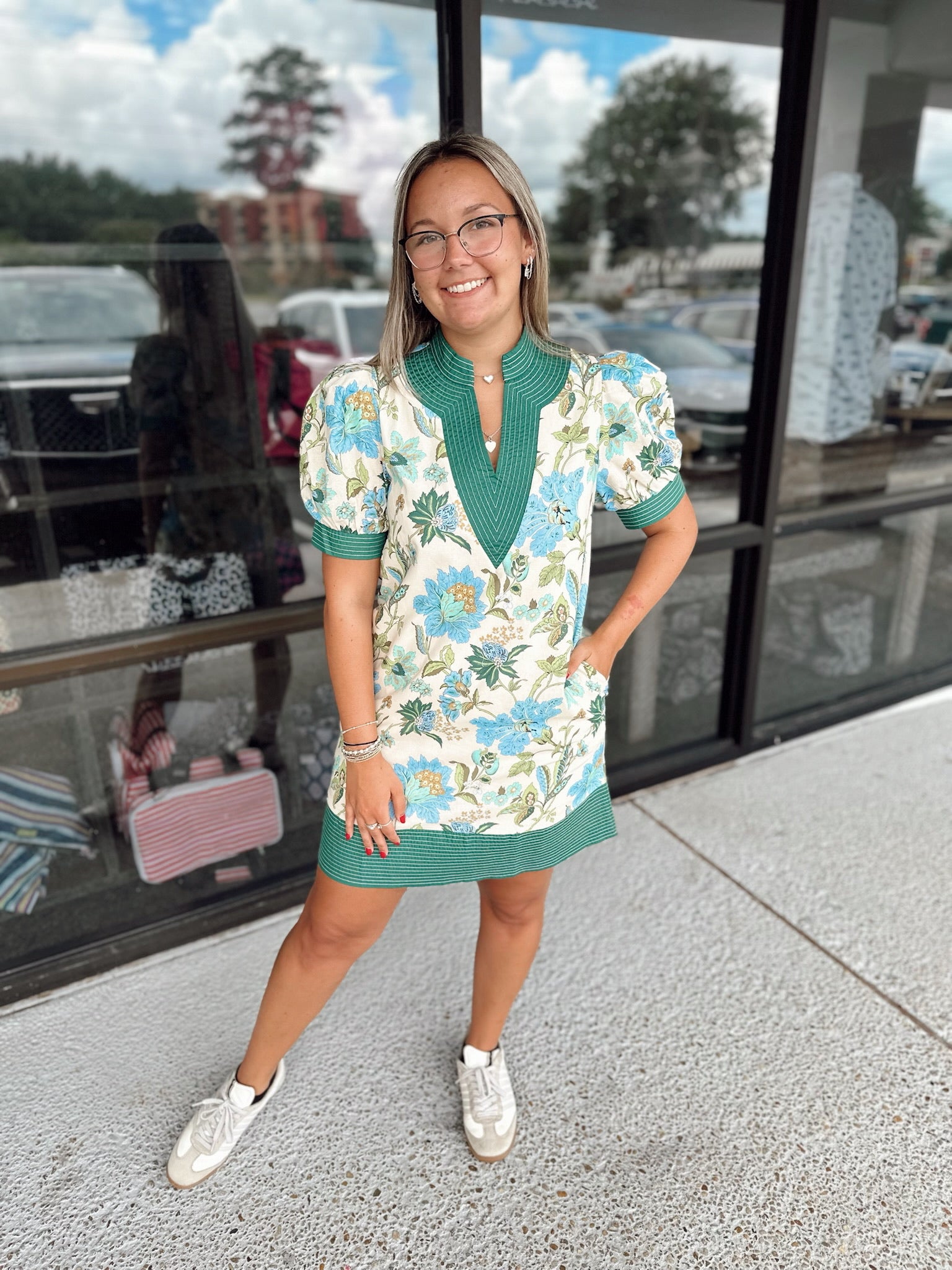 Floral print short puff sleeve pullover mini dress featuring stitch accent contrast band. Pockets at sides. Lined. Woven. Non-sheer. Lightweight.
