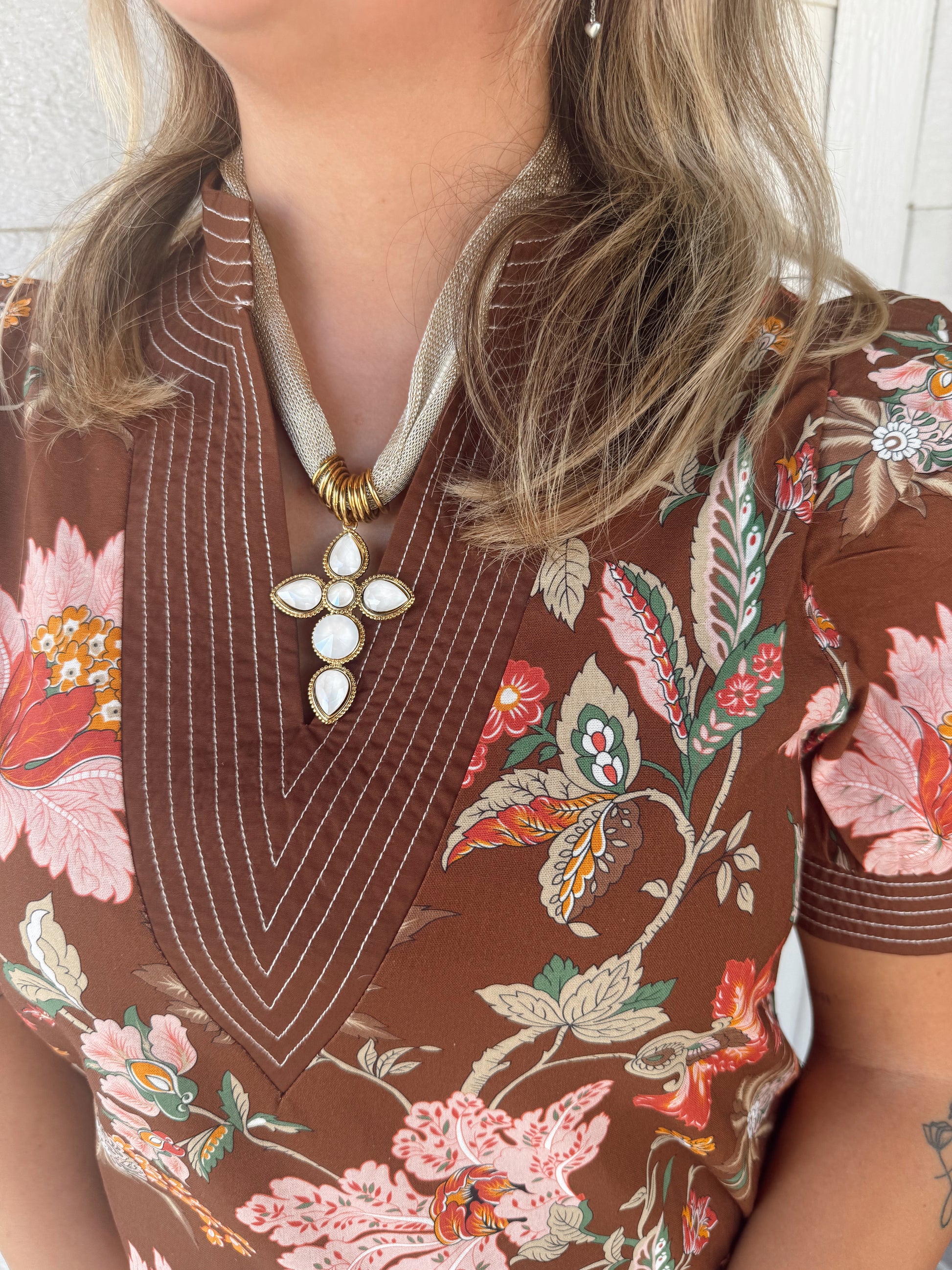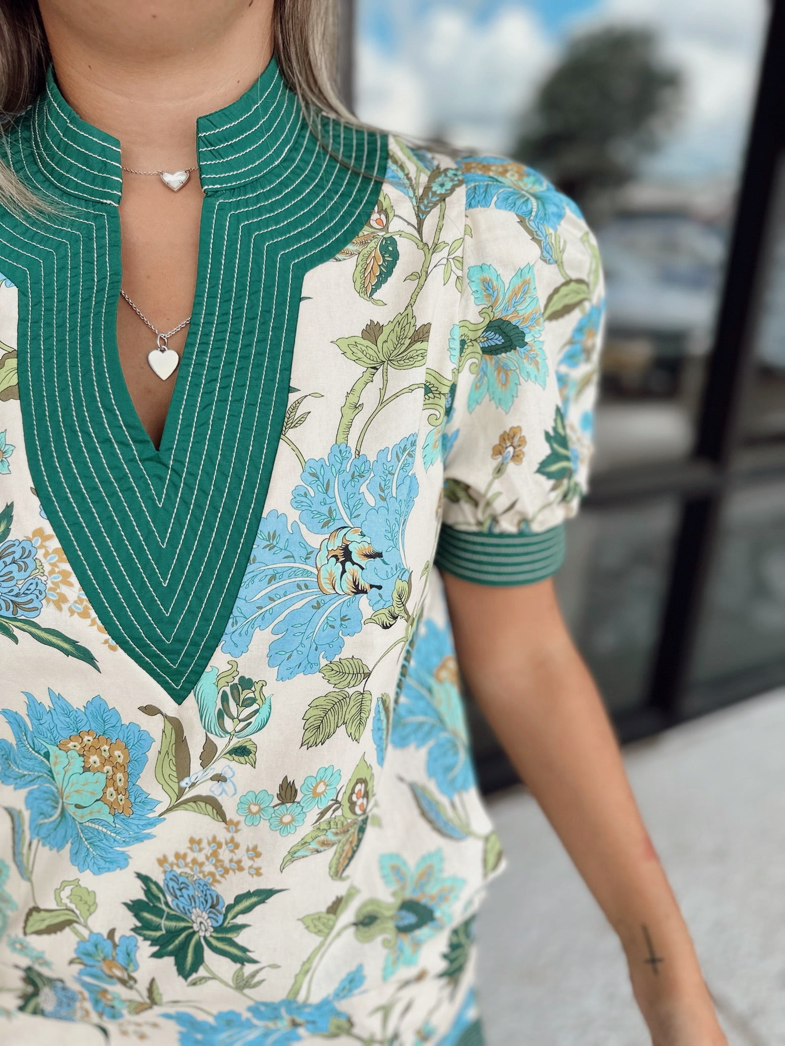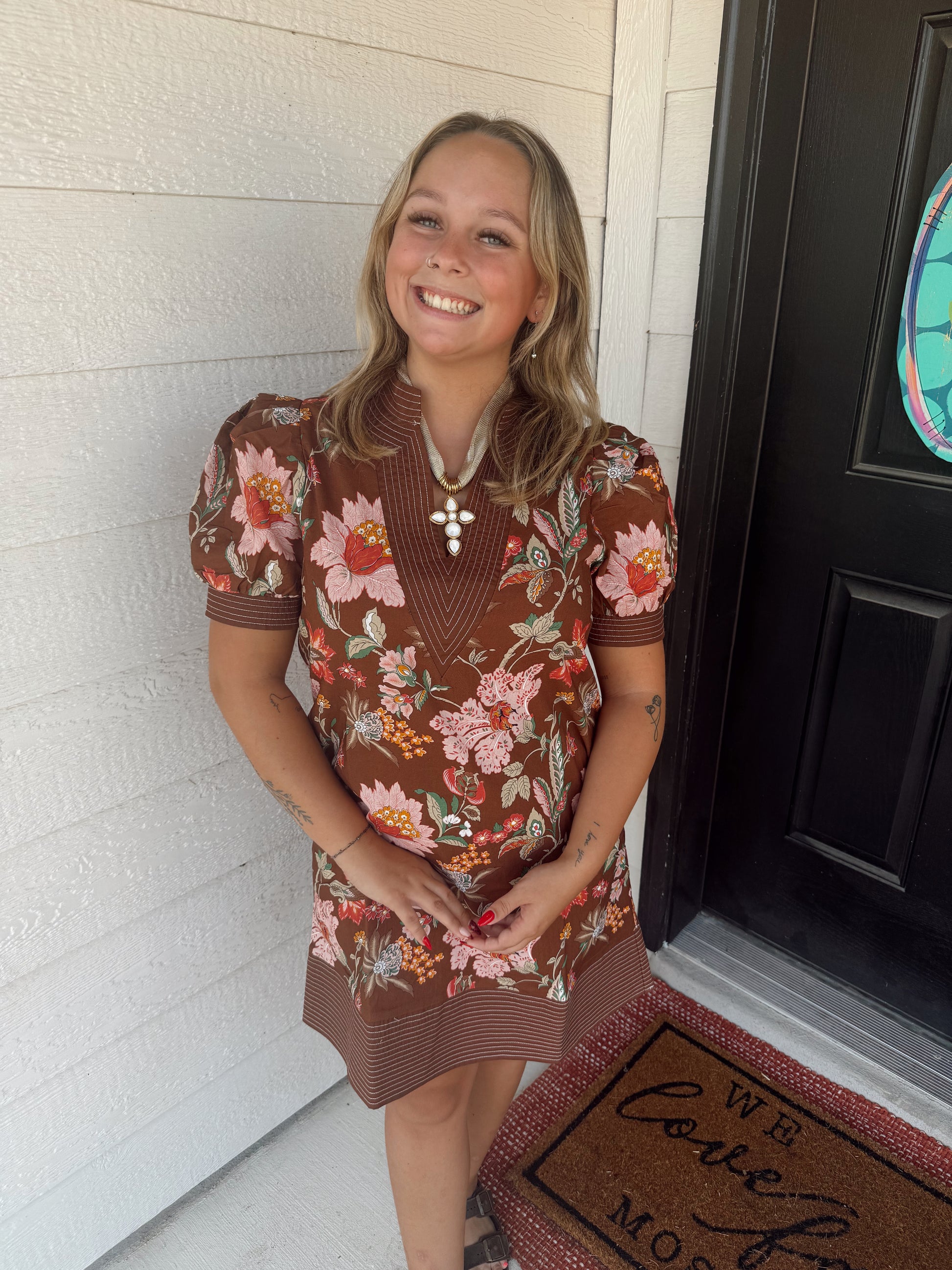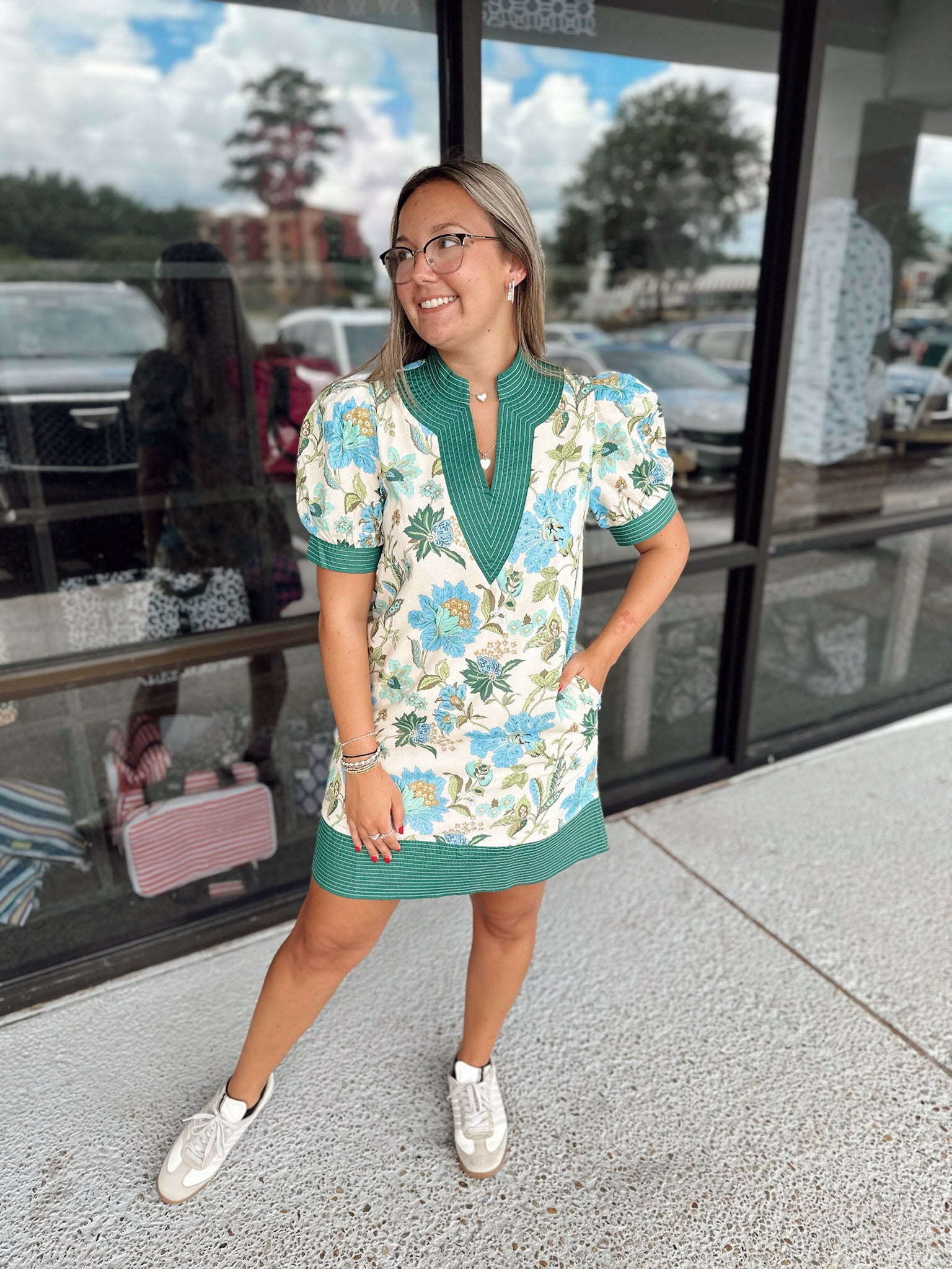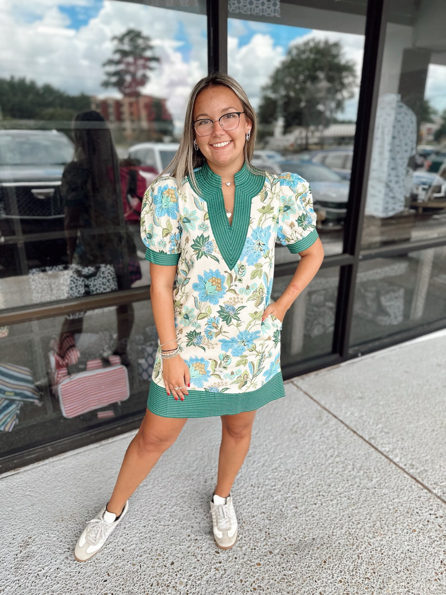Floral print short puff sleeve pullover mini dress featuring stitch accent contrast band. Pockets at sides. Lined. Woven. Non-sheer. Lightweight.