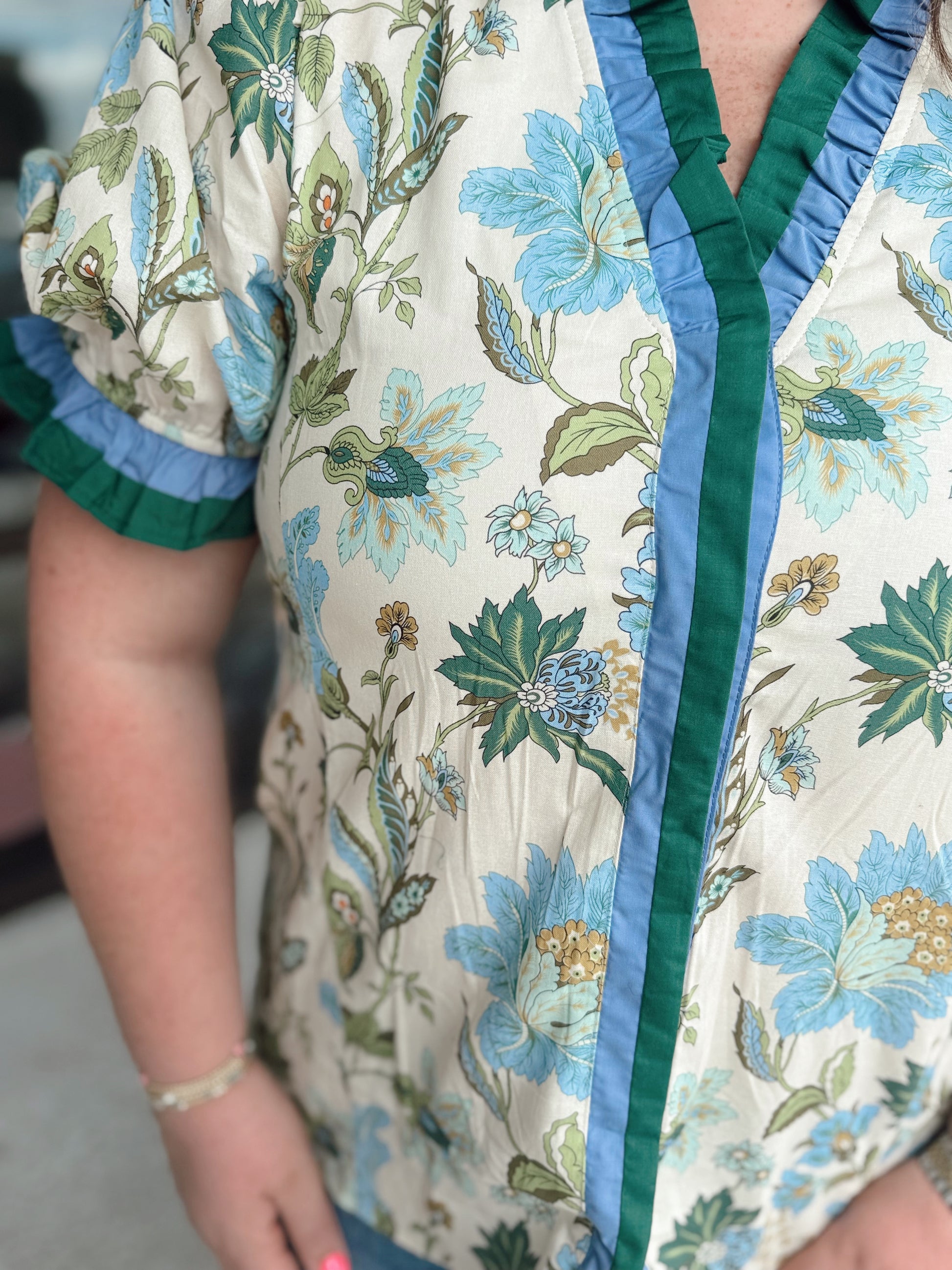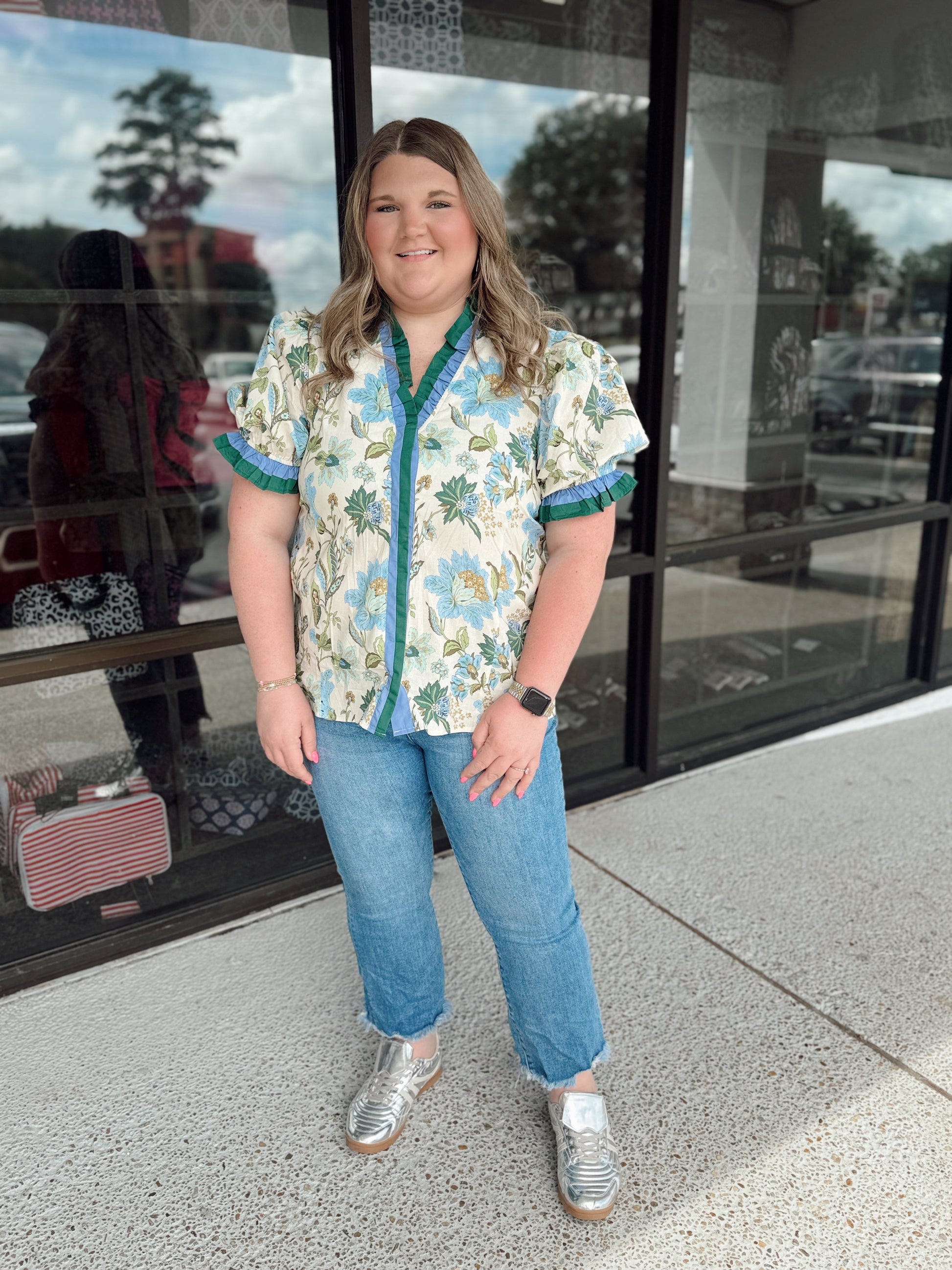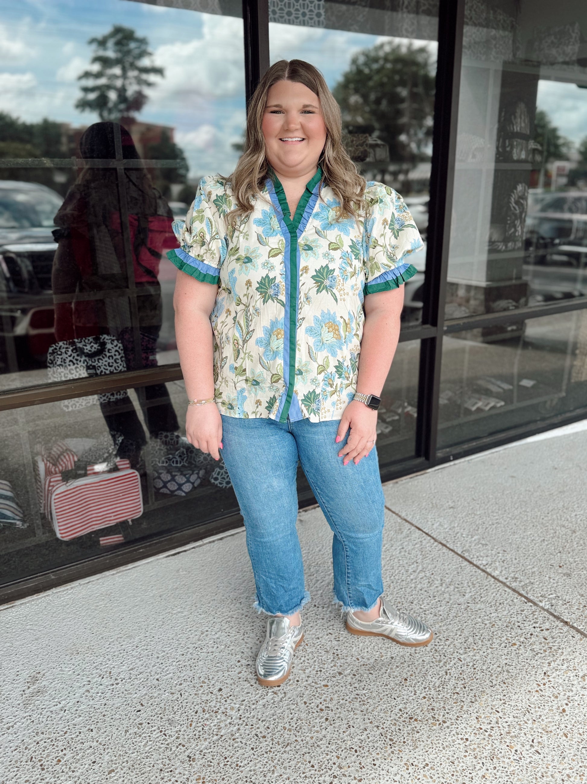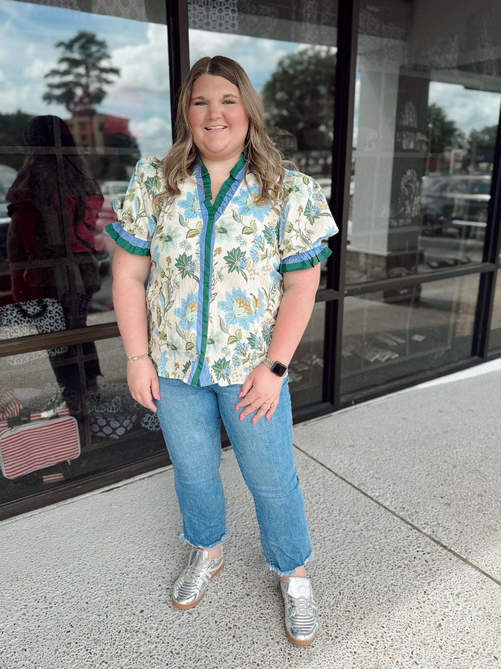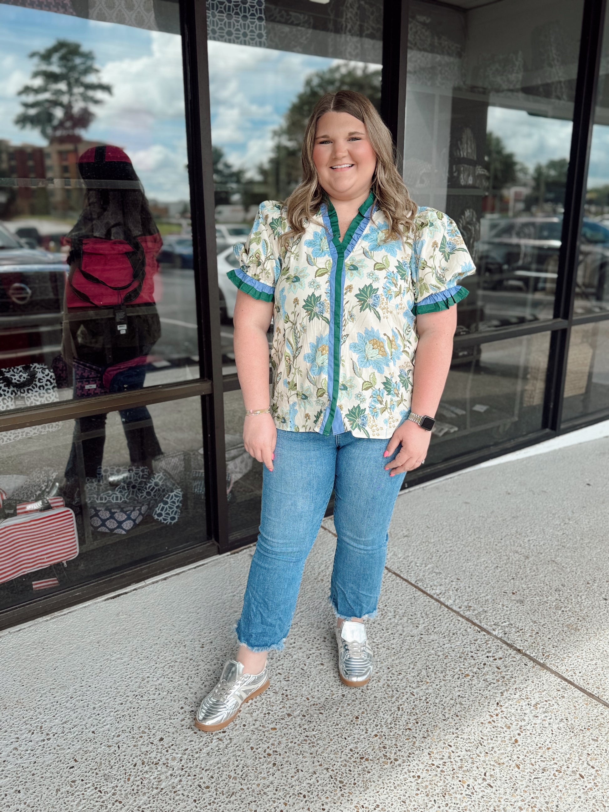 Floral print shoulder puff sleeve top featuring mulitcolor accent ruffle band detail. Unlined. Woven. Non-sheer. Lightweight.