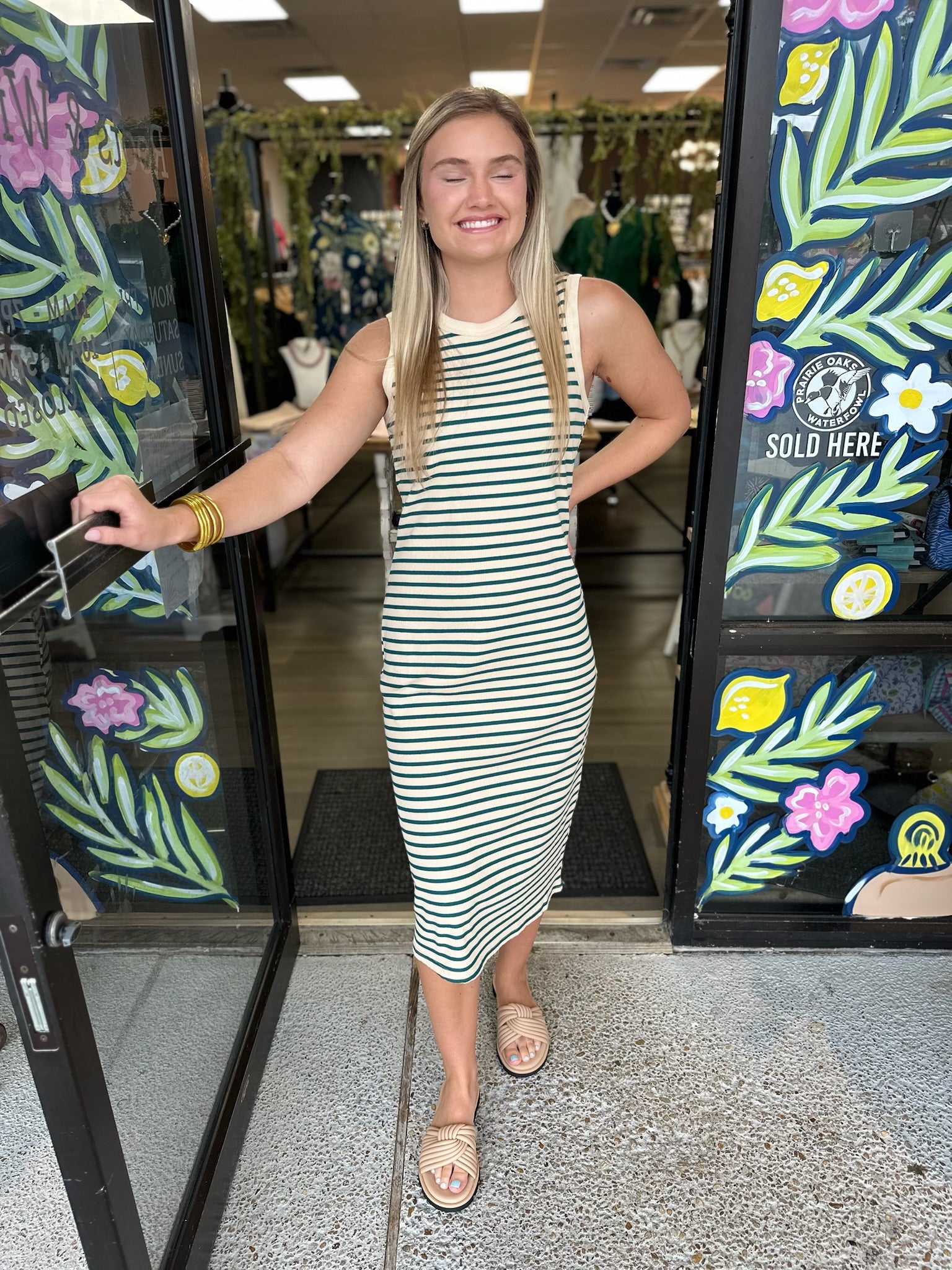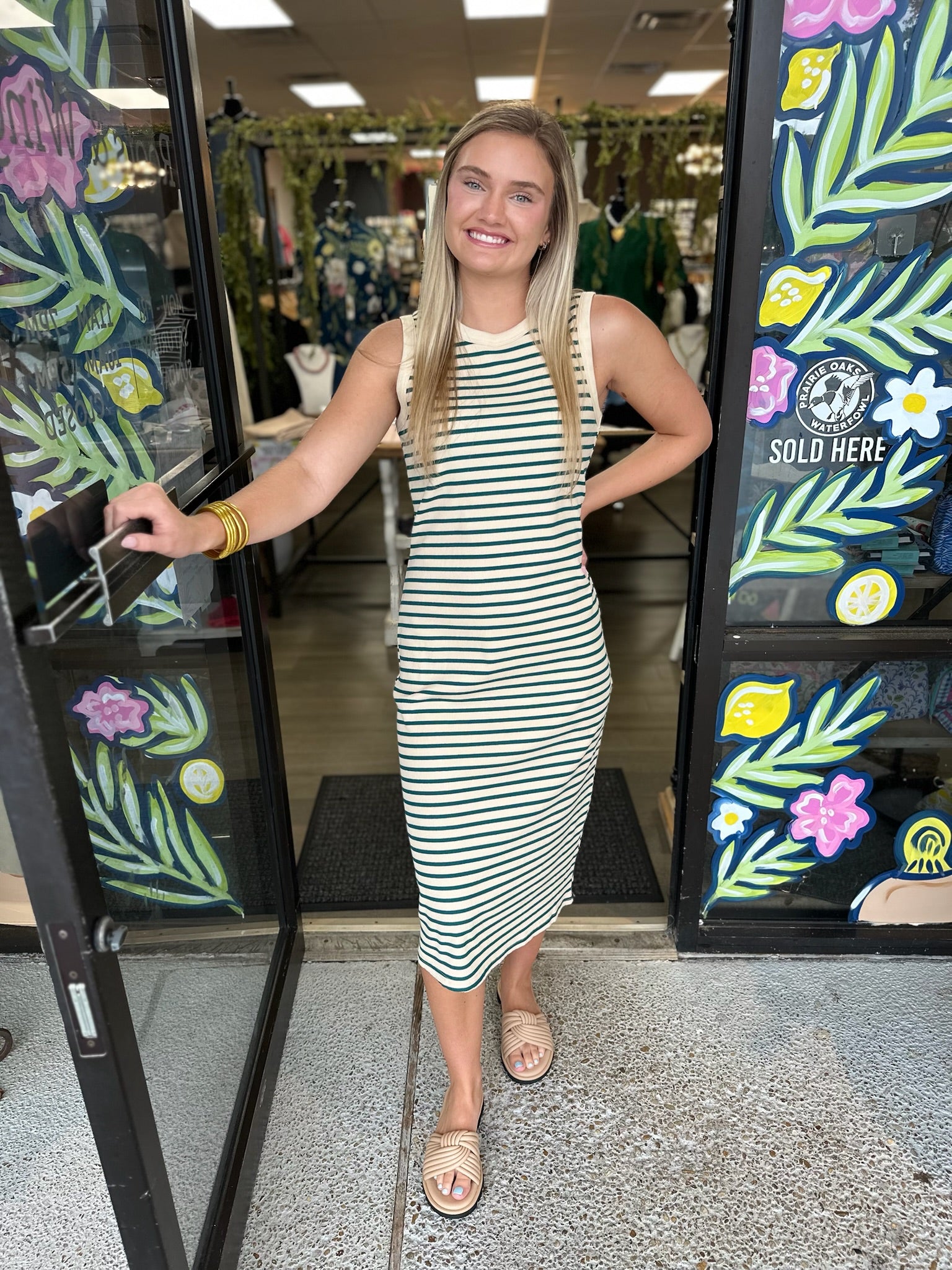 Details: STRIPED MIDI RIBBED KNIT DRESS - SLEEVELESS, ROUND NECK, COMFORTABLE, EASY, SPRING, SUMMER, CASUAL, EVERYDAY SMALL: TOTAL LENGTH - 43 1/2" 95% COTTON, 5% SPANDEX * Due to lighting and differences in monitors, actual colors may vary slightly from what appears online.