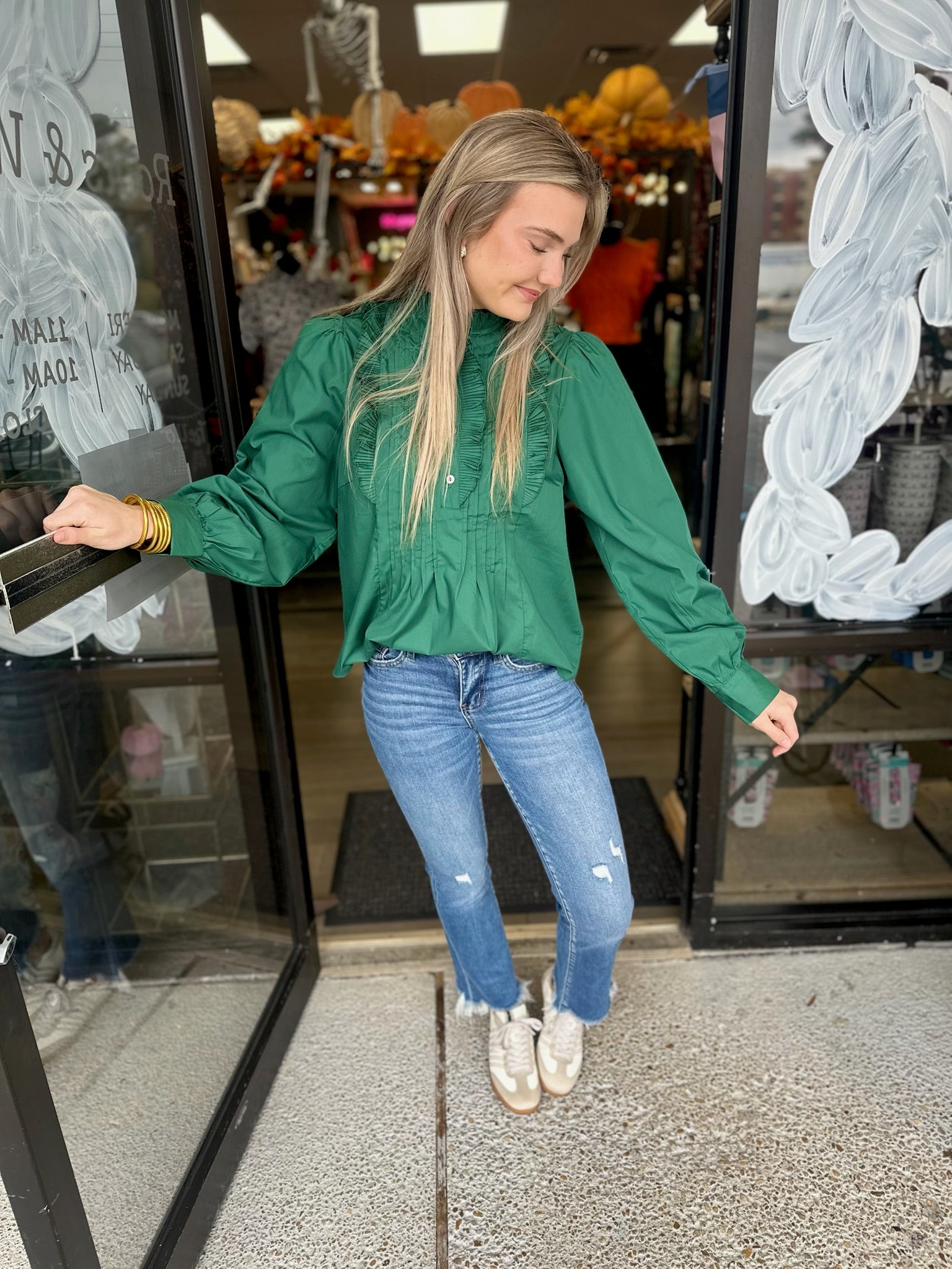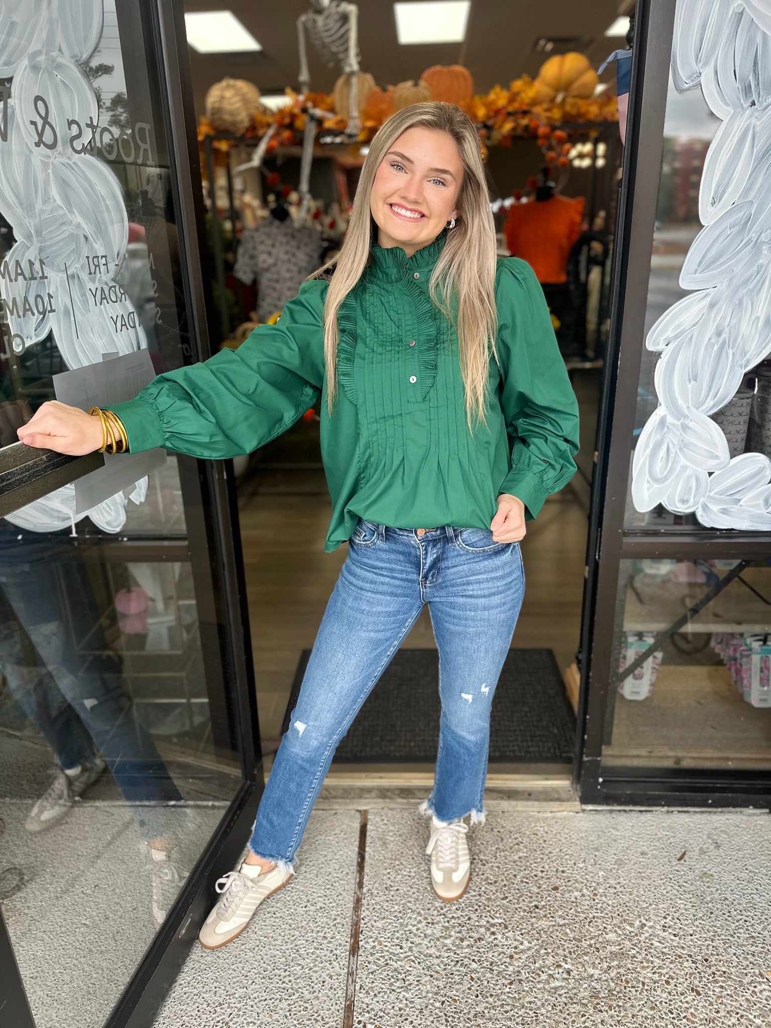 Solid long shirt sleeve pintuck top featuring frill accent band collar button closure at front. Unlined. Woven. Non-sheer. Lightweight.