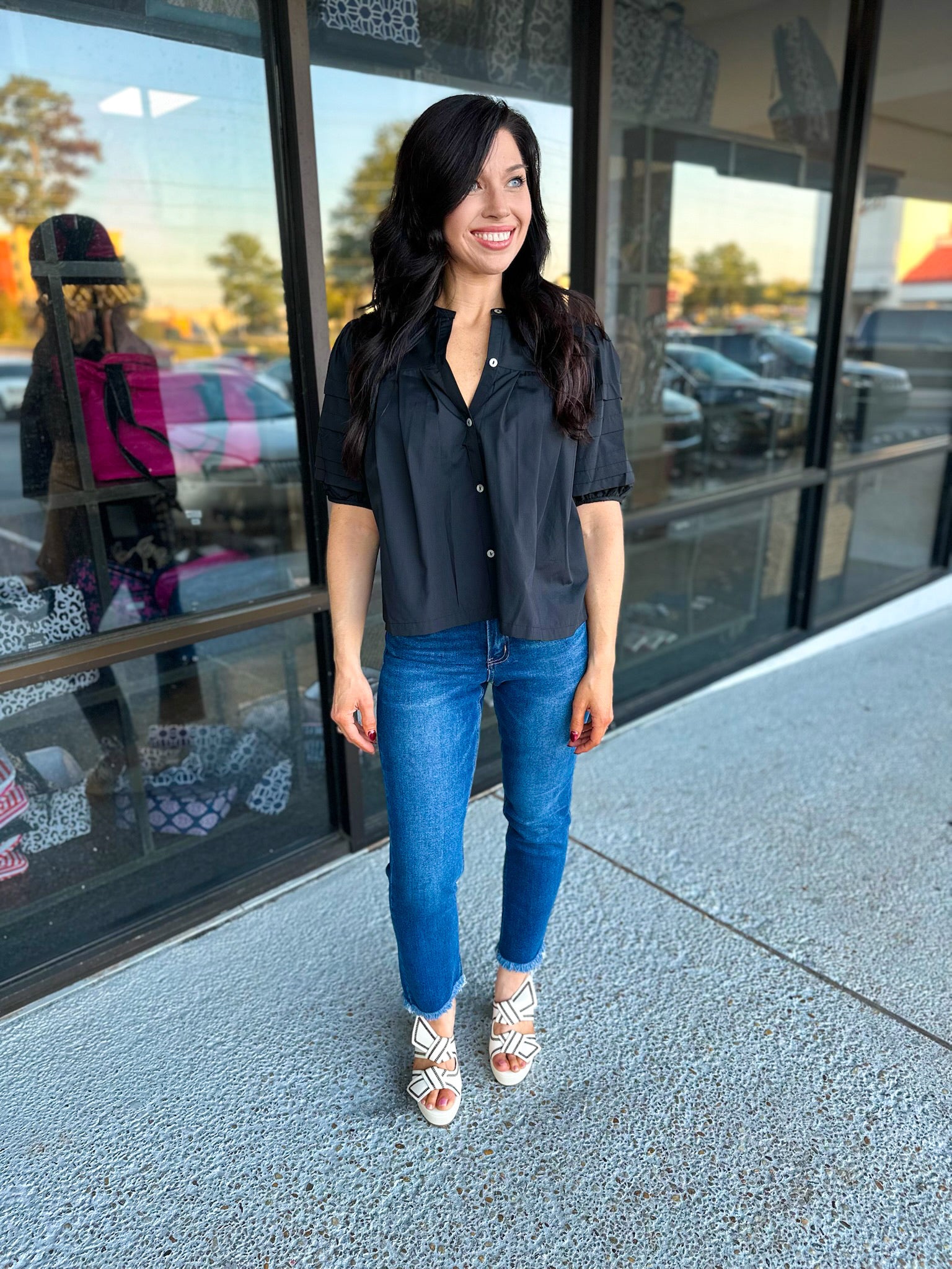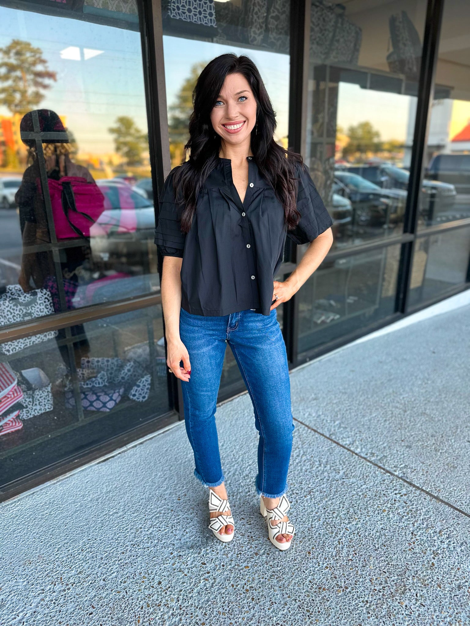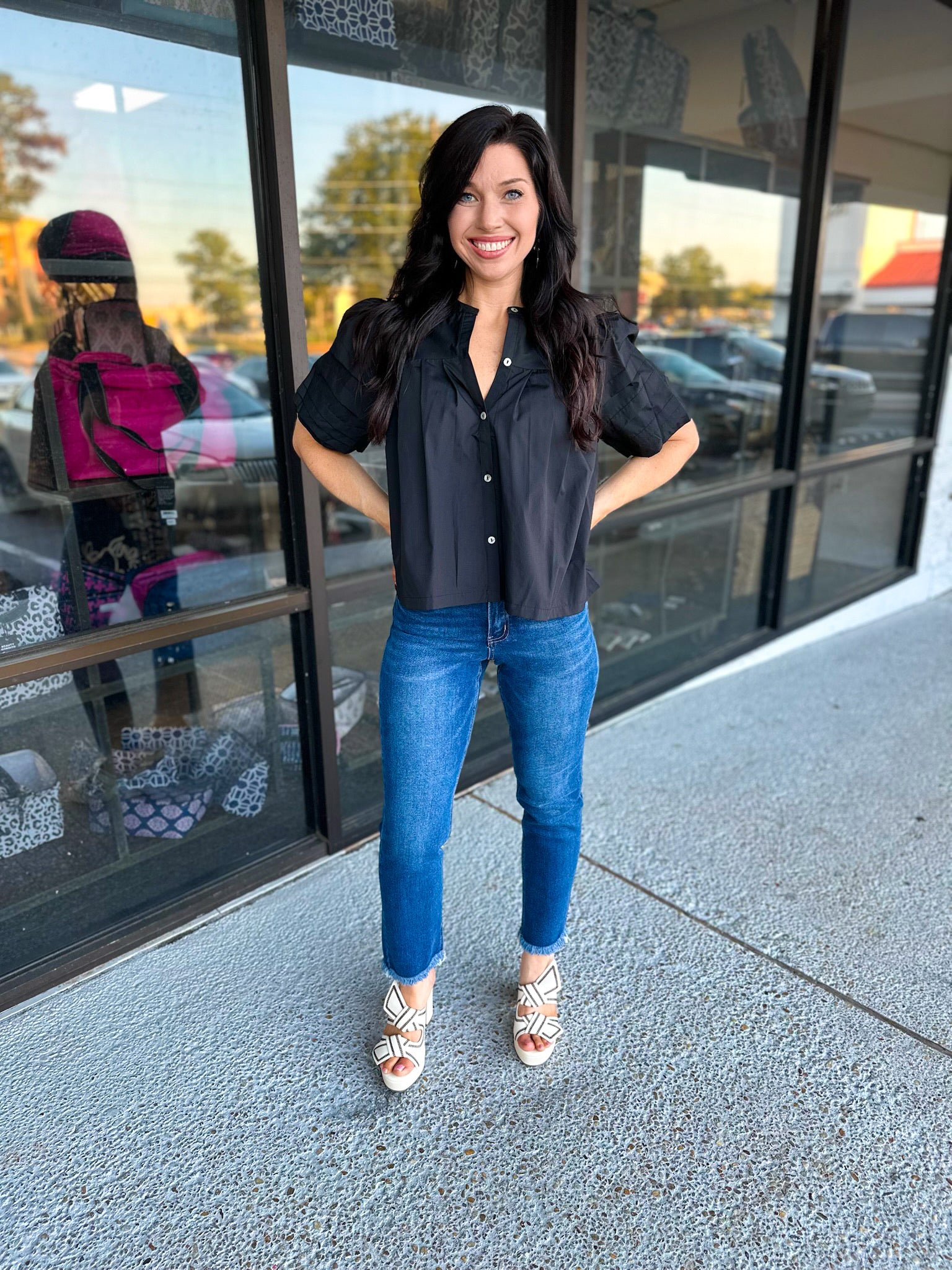 Solid pintuck short puff sleeve top featuring pleated front. Button closure at front. Unlined. Woven. Non-sheer. Lightweight.