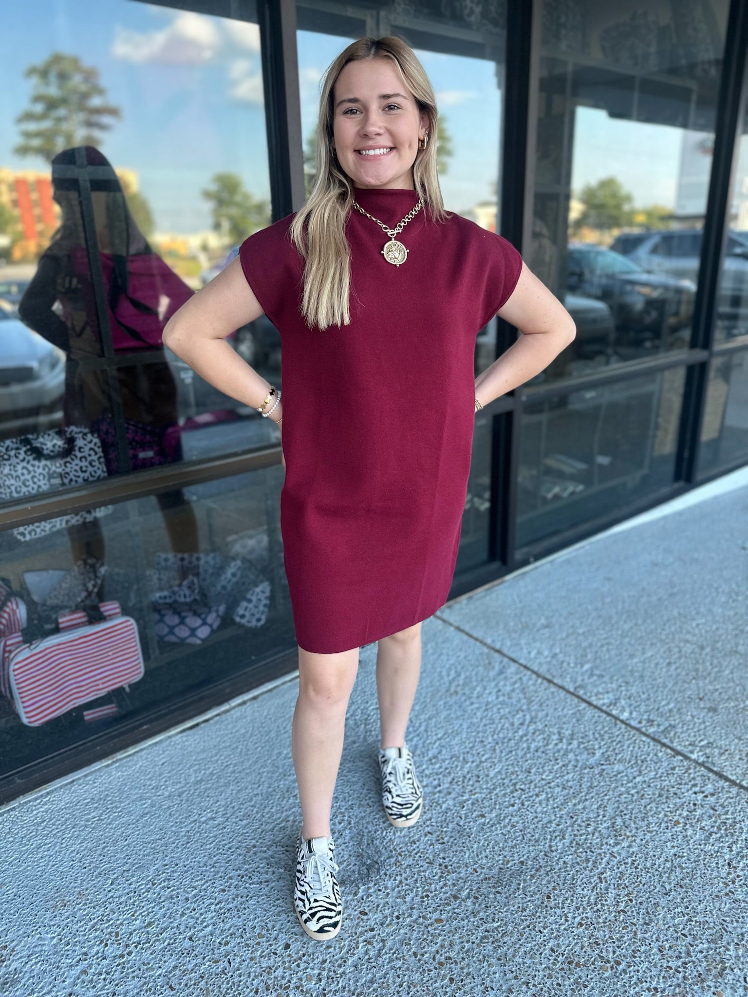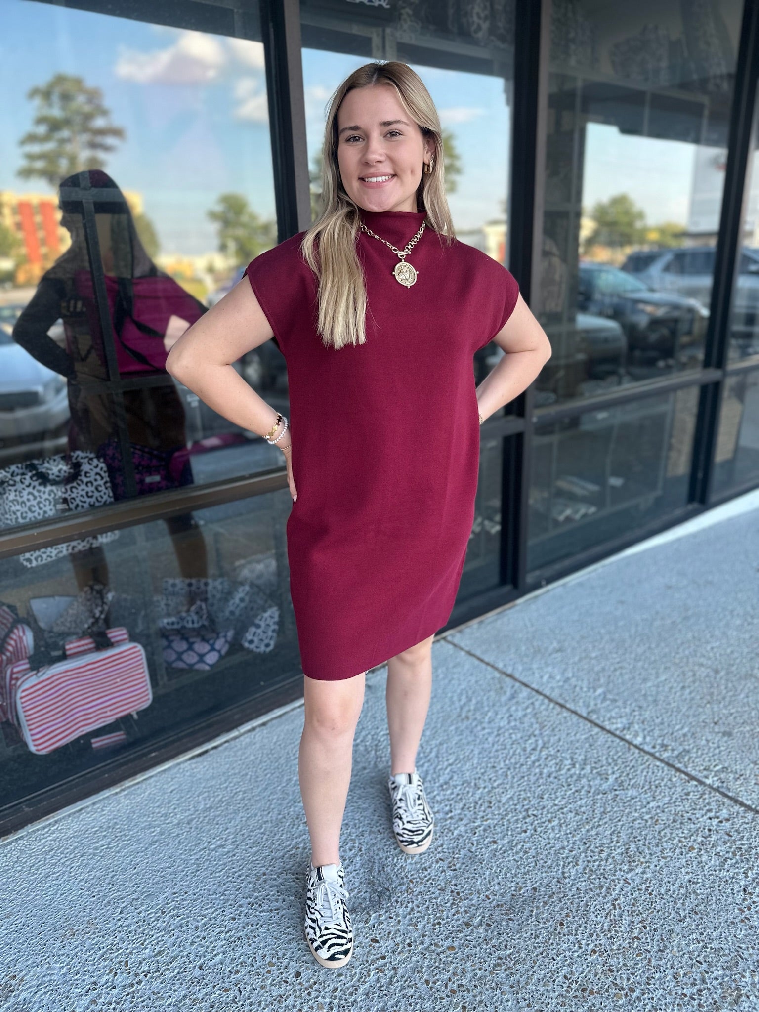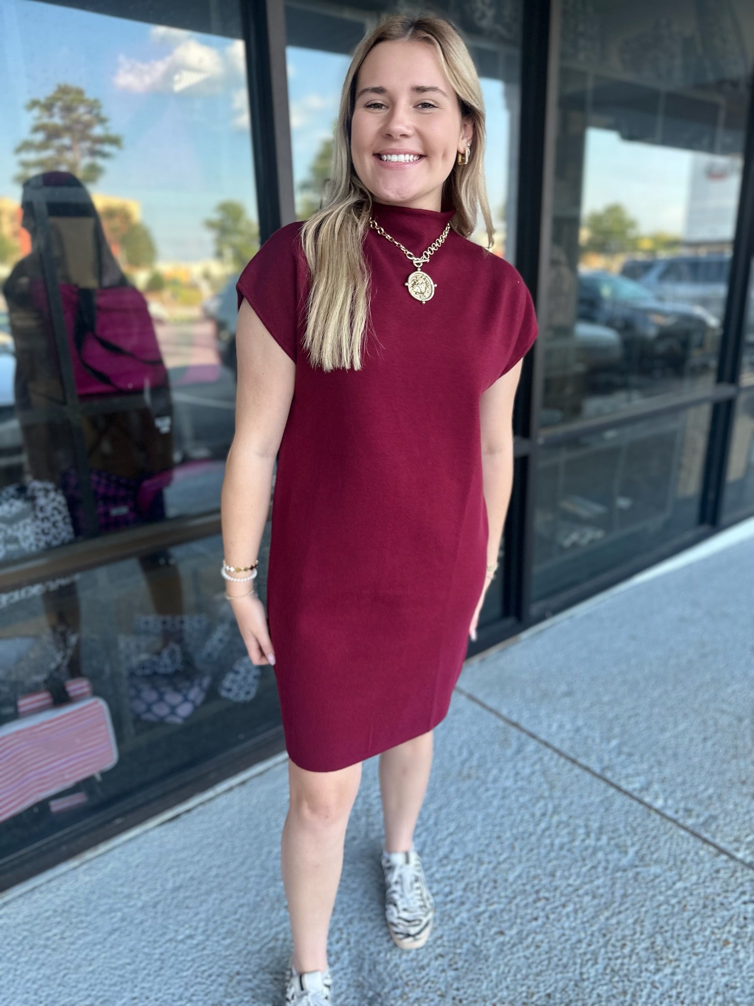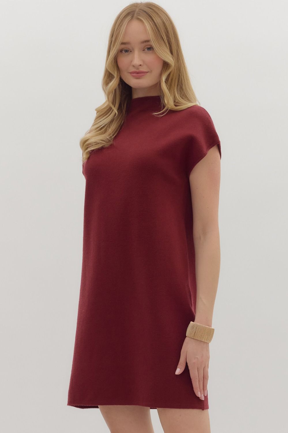 Solid mock neck sweater knit mini pullover dress. Unlined. Knit. Non-sheer. Lightweight.