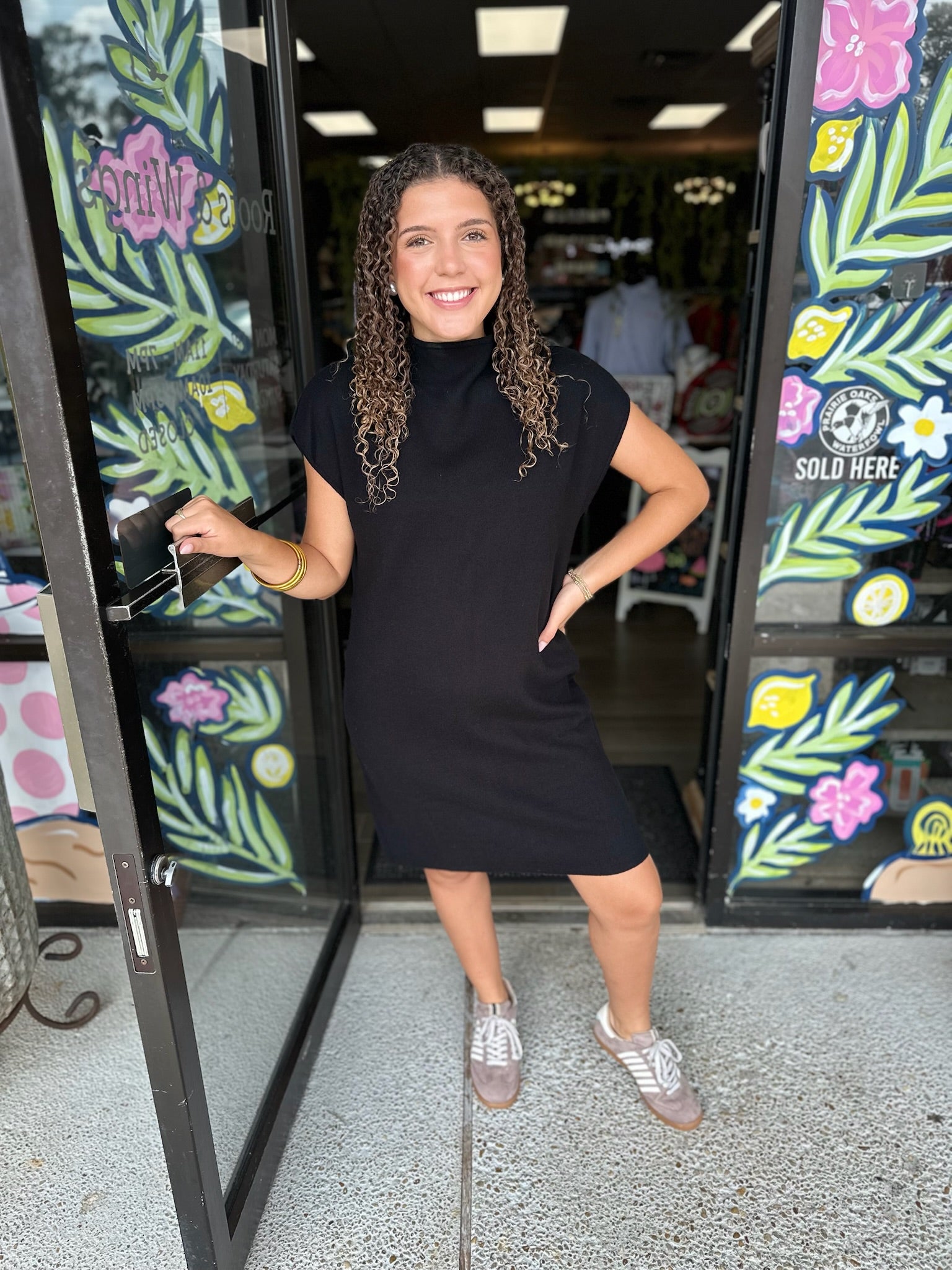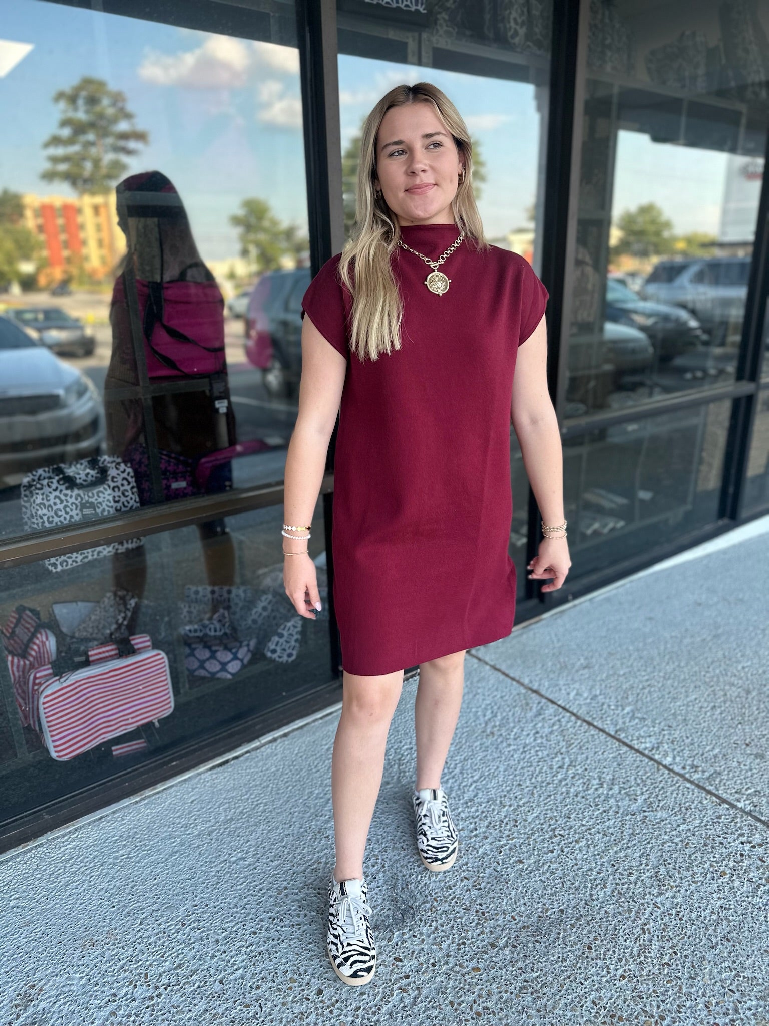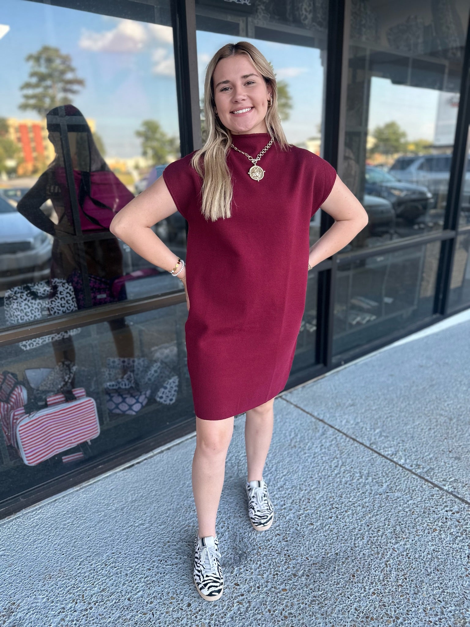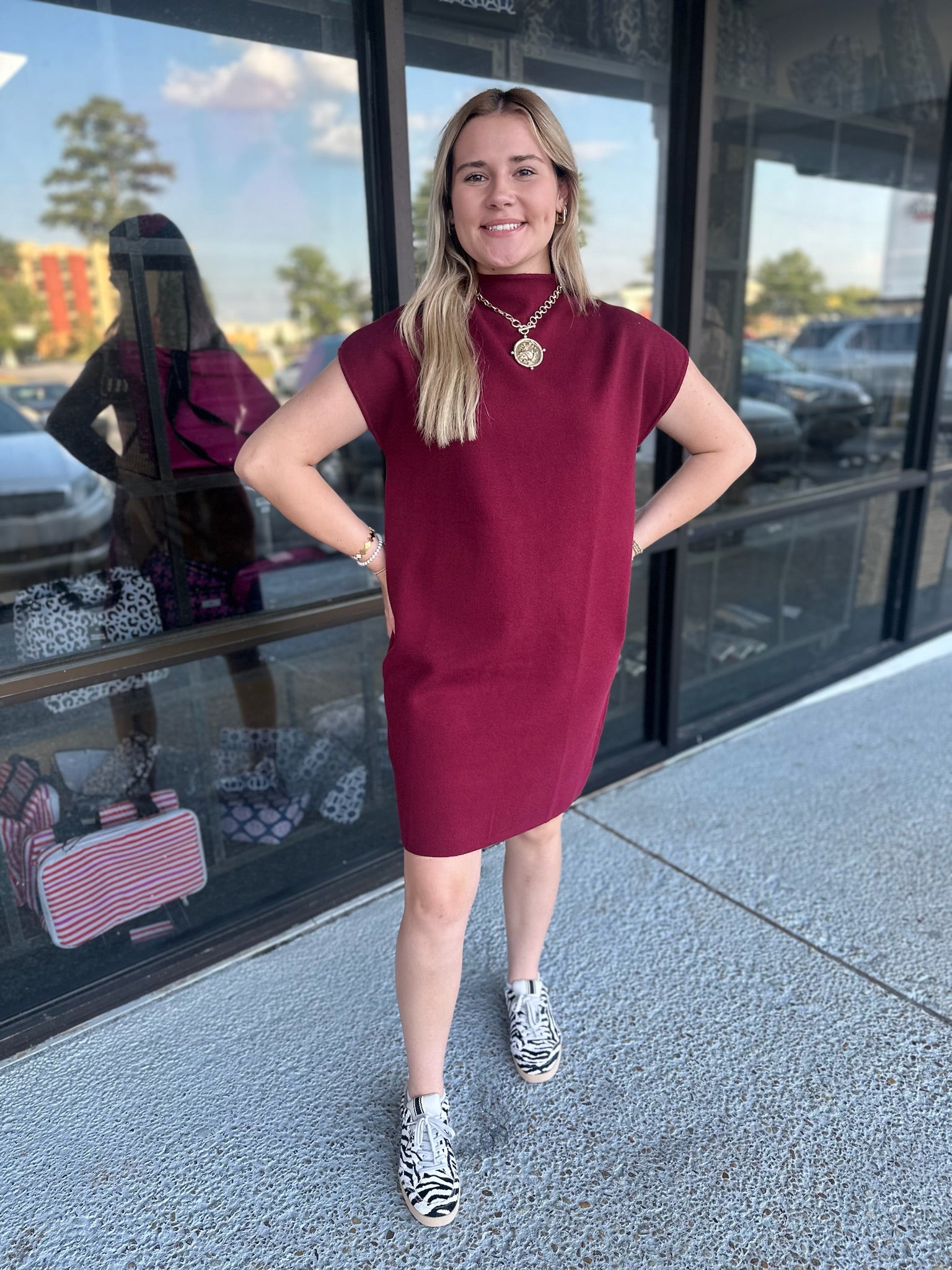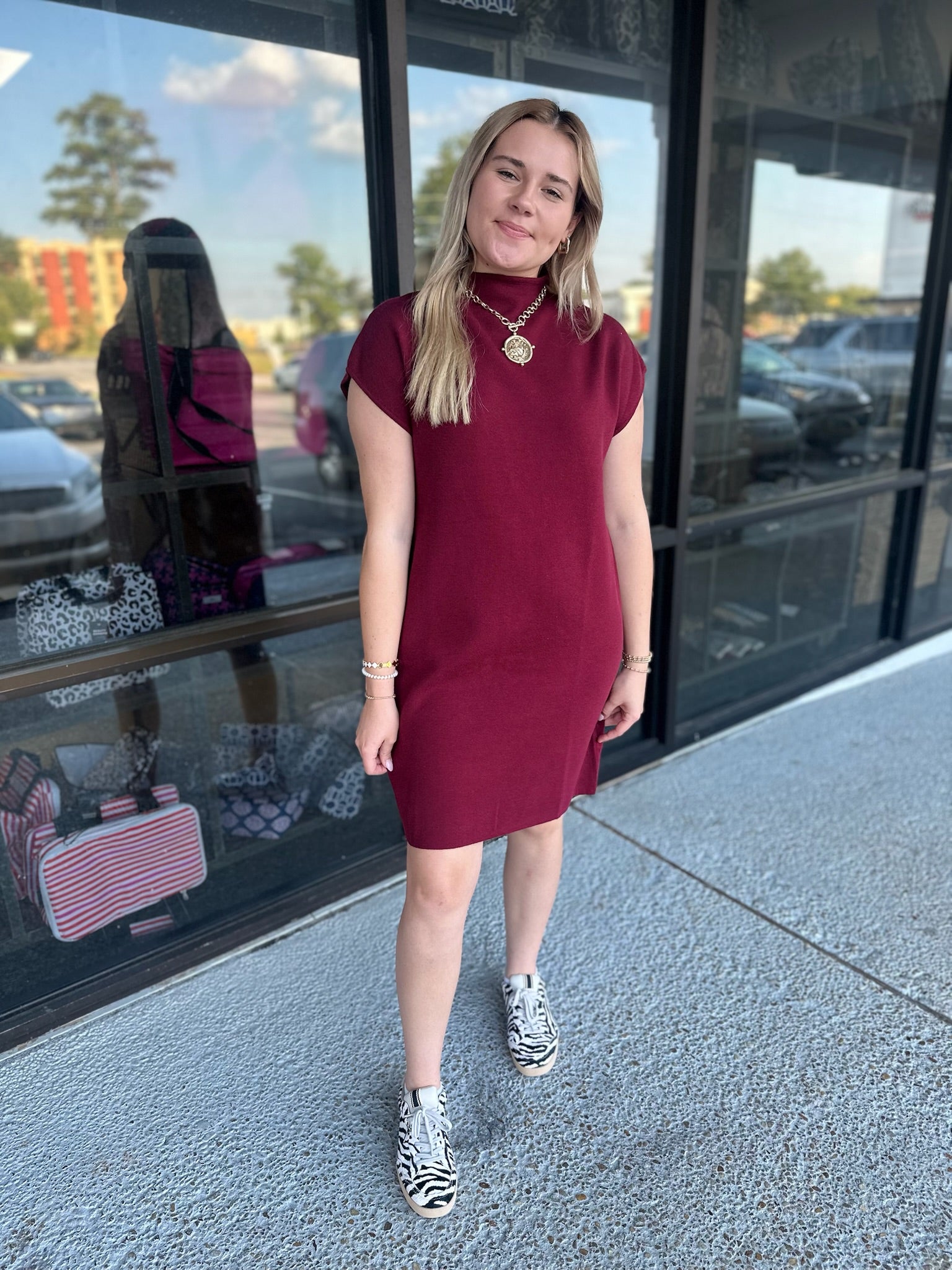 Solid mock neck sweater knit mini pullover dress. Unlined. Knit. Non-sheer. Lightweight.