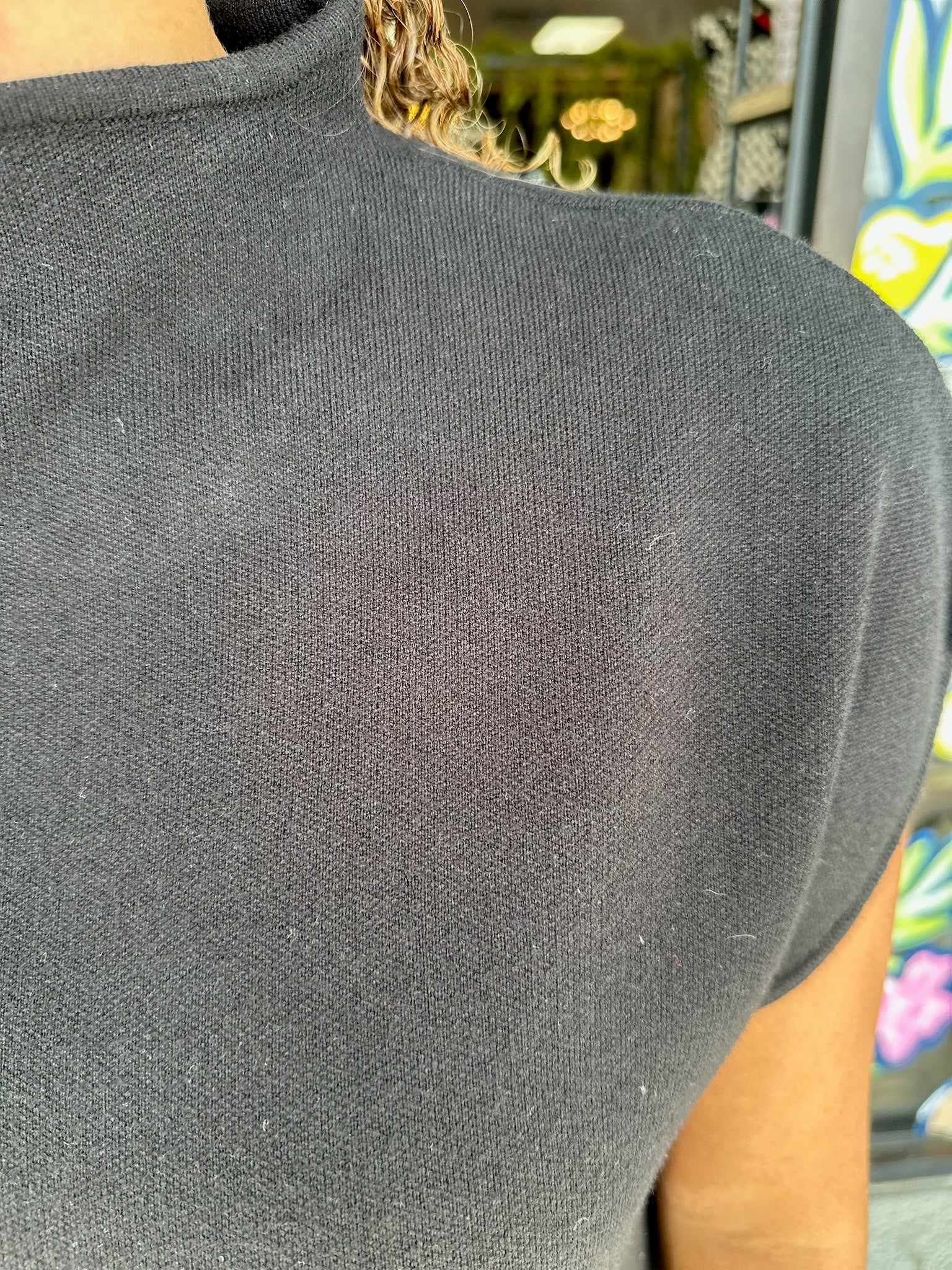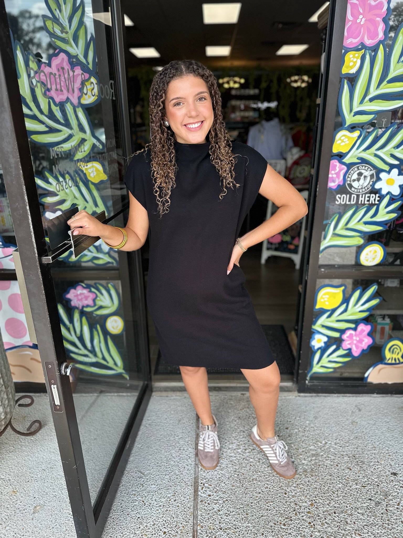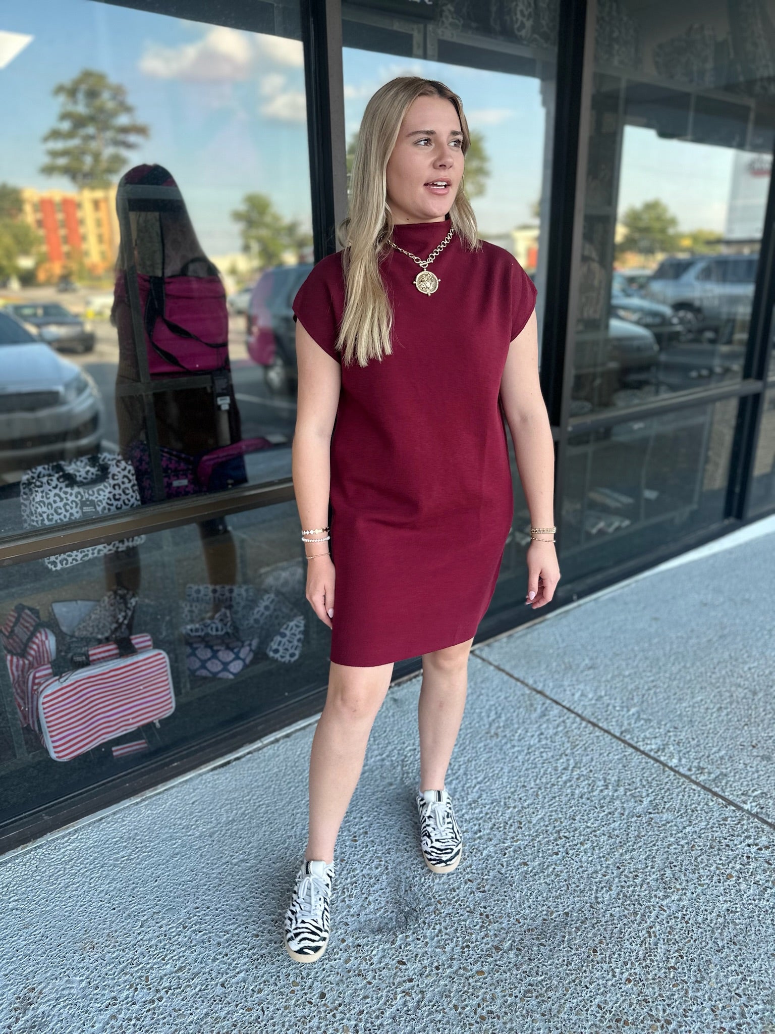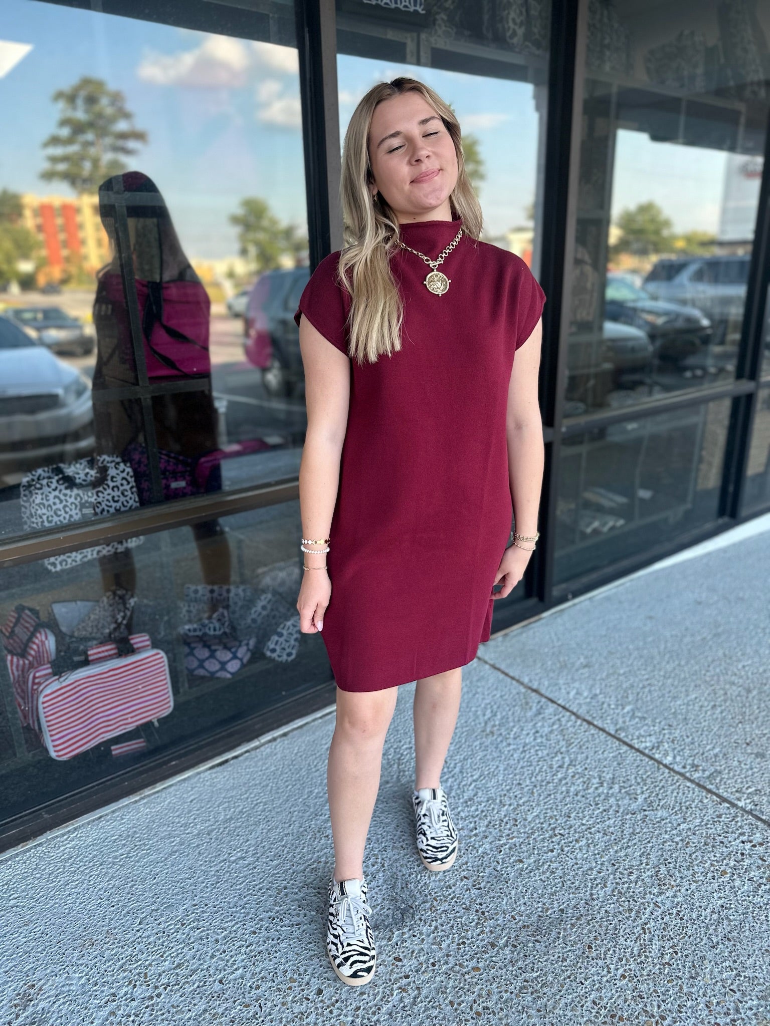 Solid mock neck sweater knit mini pullover dress. Unlined. Knit. Non-sheer. Lightweight.